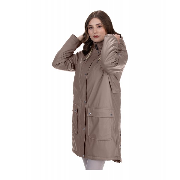 Супер стильный плащ с капюшоном и теплой внутренней частью из приятного мягкого плюша. Водо и ветрозащитный. Потайная двусторонняя молния спереди с защитой подбородка, 1 внутренний карман на молнии, 2 кармана с клапанами на кнопках спереди, регулируемый капюшон, который также имеет подкладку из плюшевого меха и может прикрепляться к спине, более длинный вырез сзади с 2 разрезы для верховой езды на кнопках, принт Felix Bühler на рукаве. Снаружи 100% полиуретан, внутри 100% полиэстер.