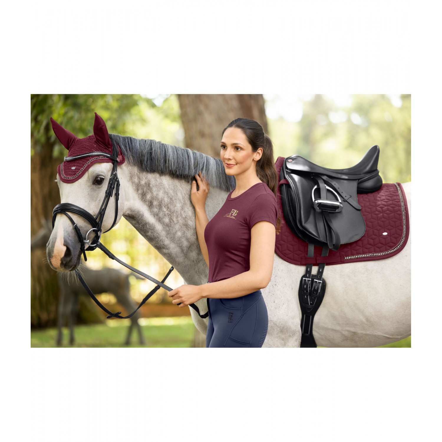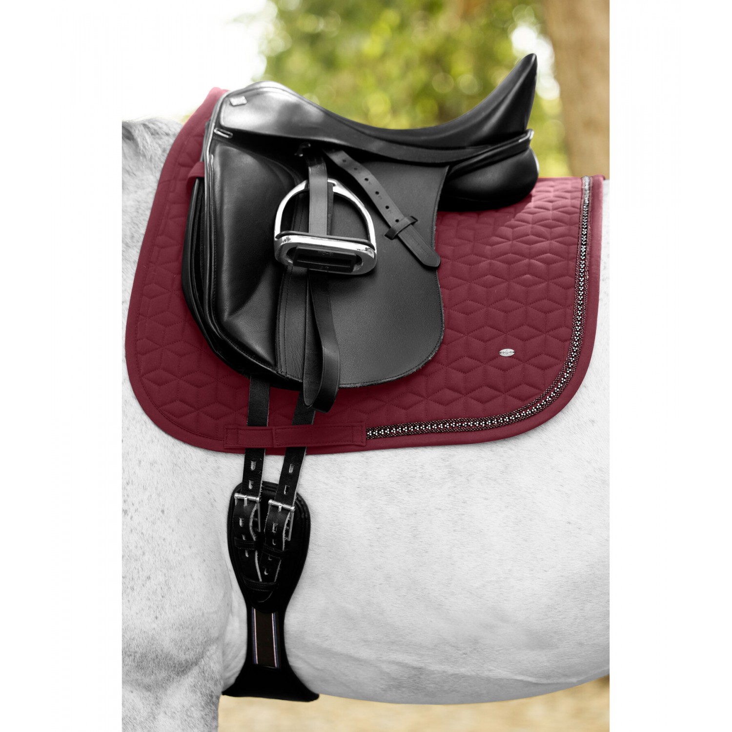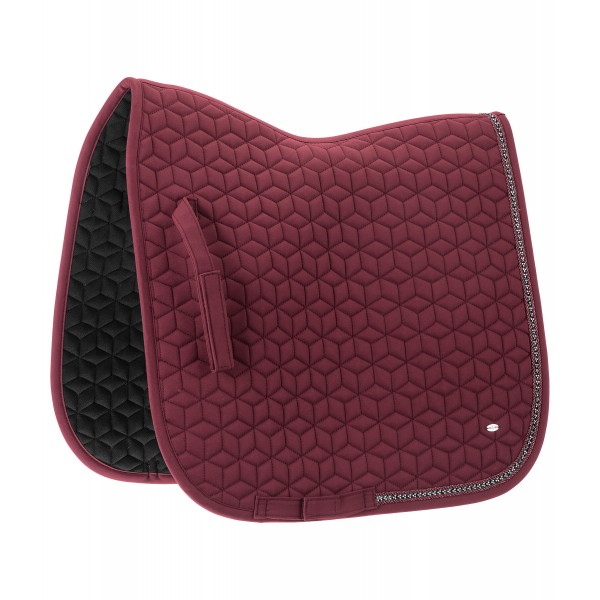 Блестящий вальтрап, украшенный мелкими стразами и двойным мерцающим декоративным шнуром. Изящная серебряная пластинка с логотипом и изысканная стёжка. Нижняя часть изготовлена из влагоотводящей и воздухопроницаемой сетчатой ткани. 100% полиэстер.
