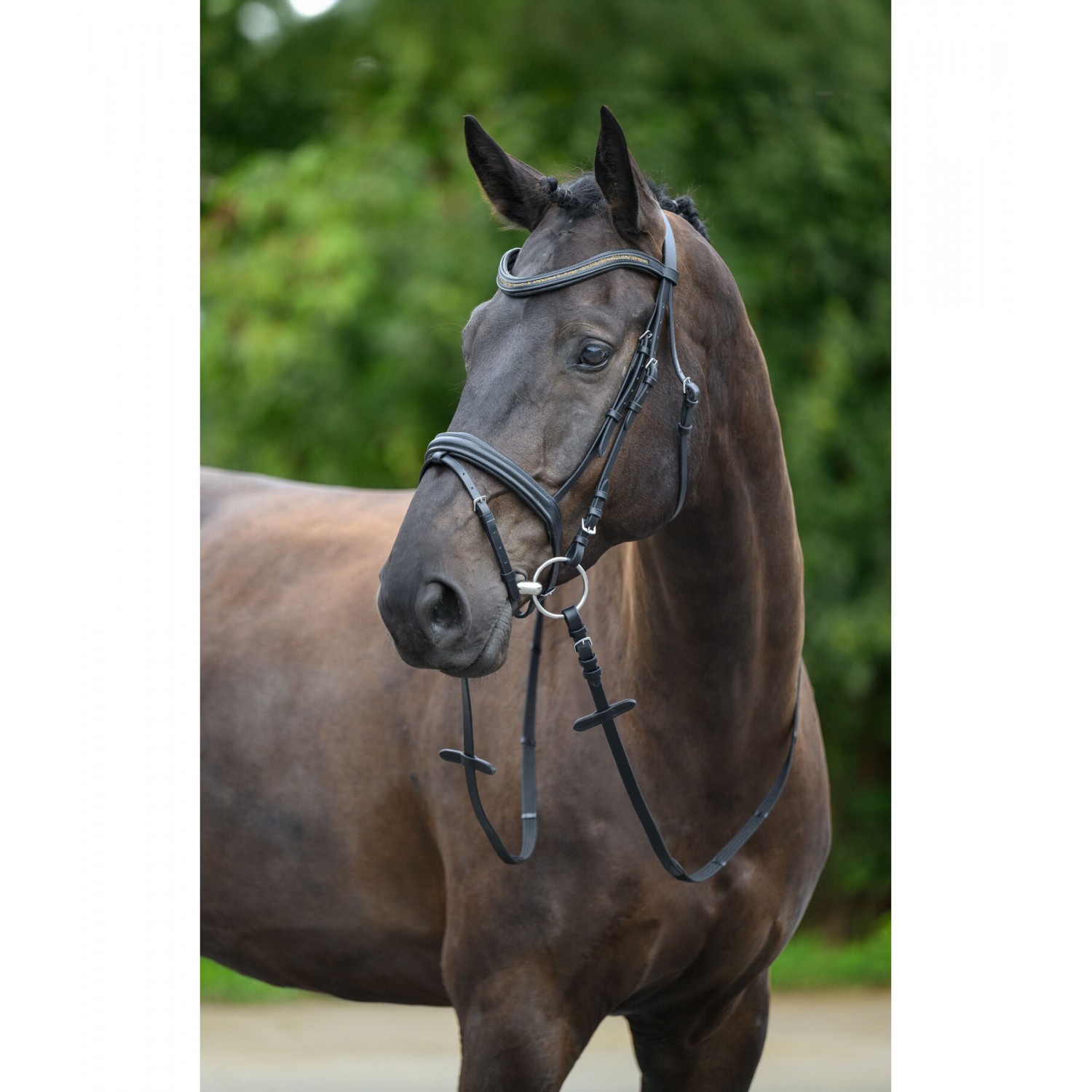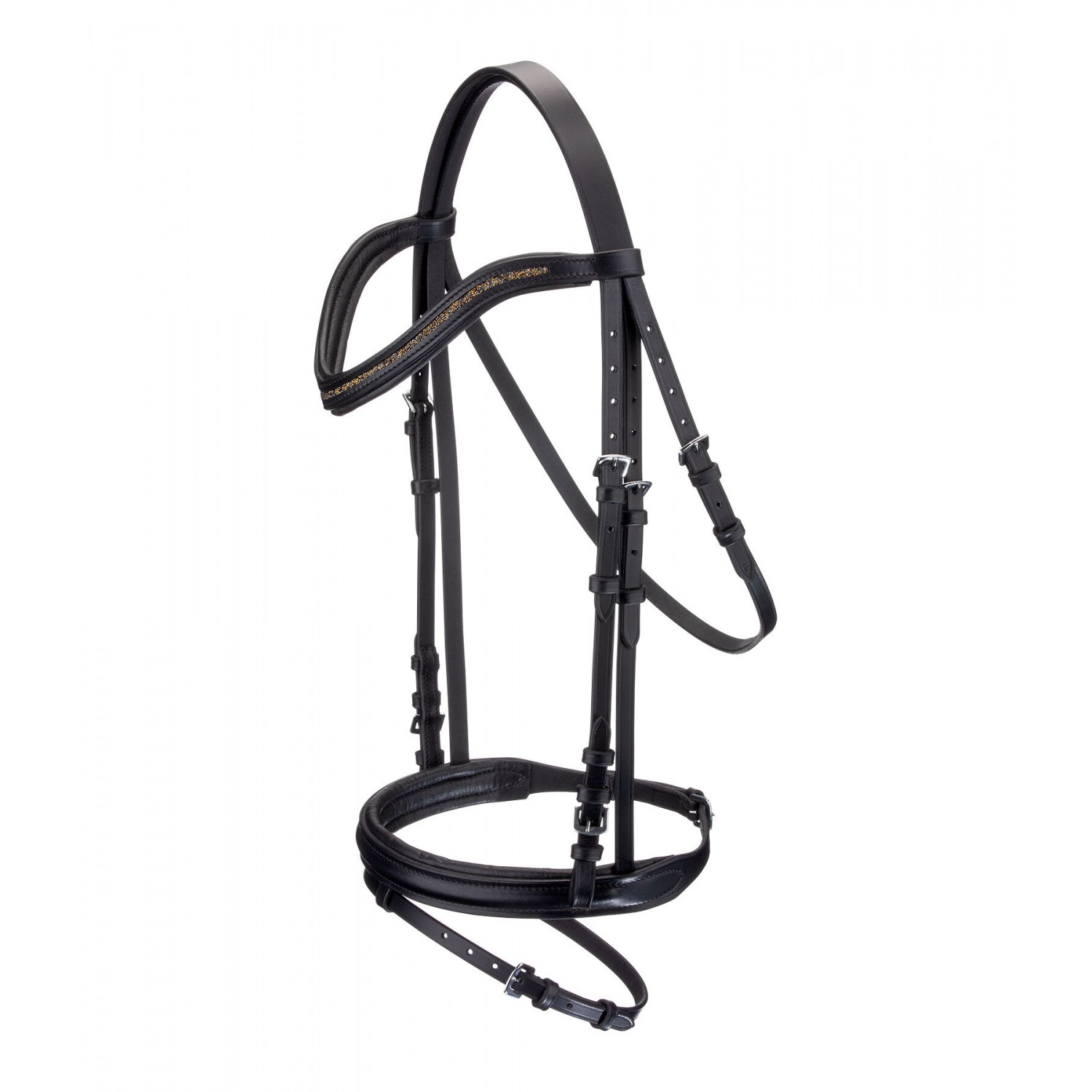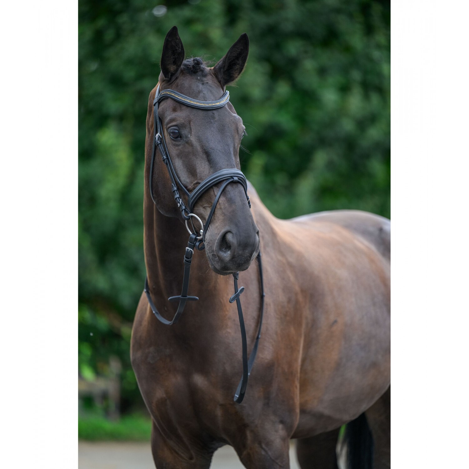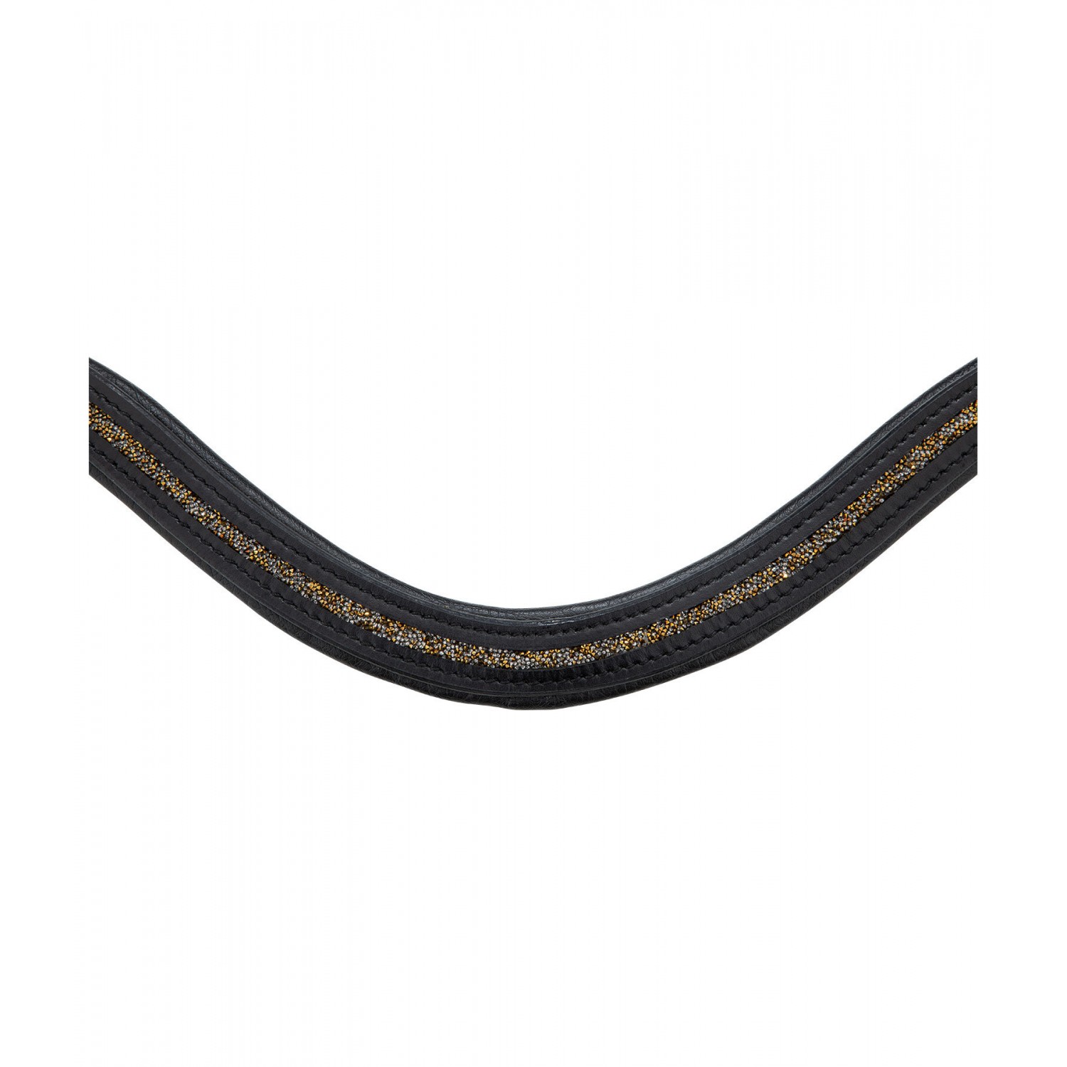 Яркая уздечка со сверкающим изогнутым налобником с крошечными камнями из розового золота и серебра Ободок и носовая накладка с мягкой кожаной подкладкой. Фурнитура из розового золота. С поводом, без трензеля.