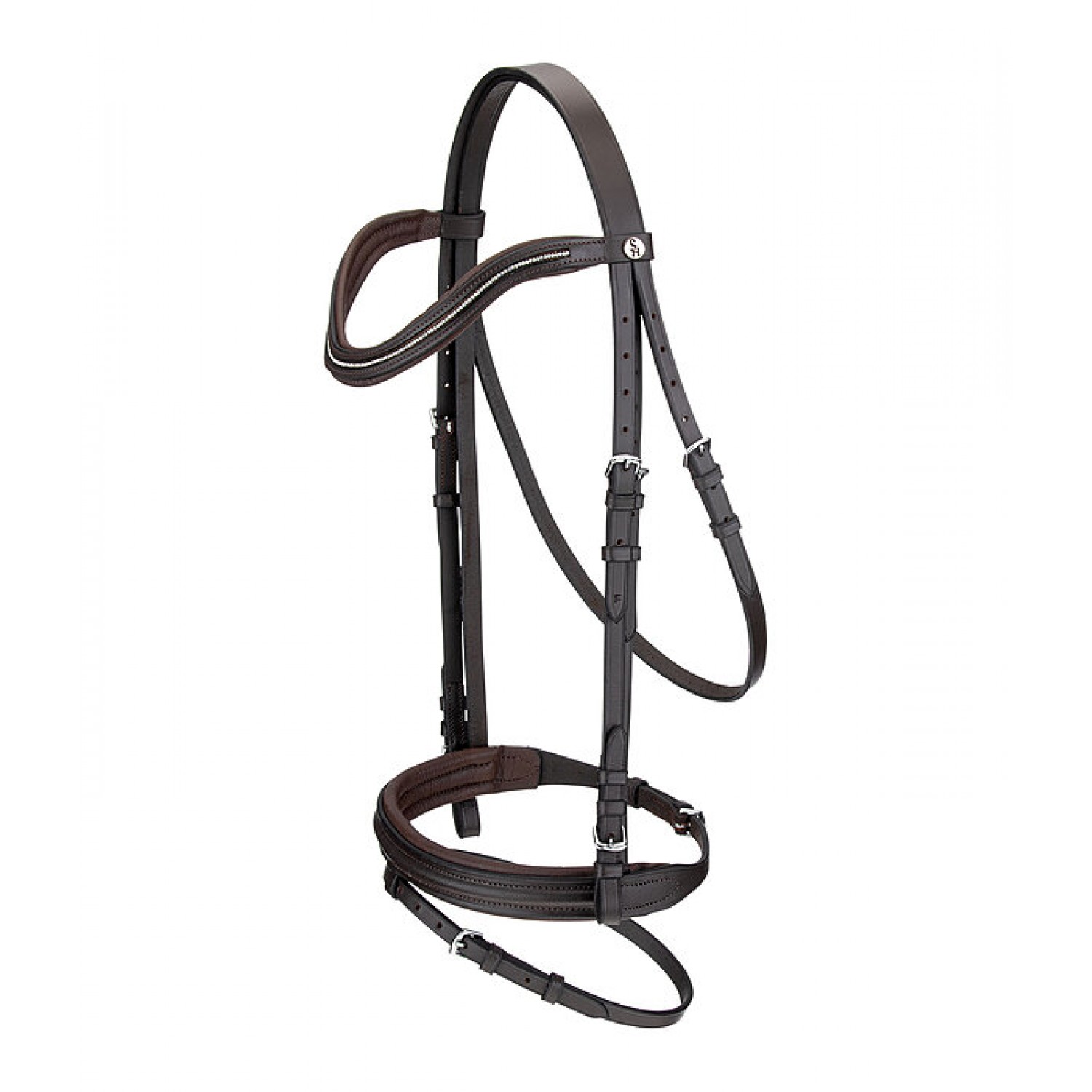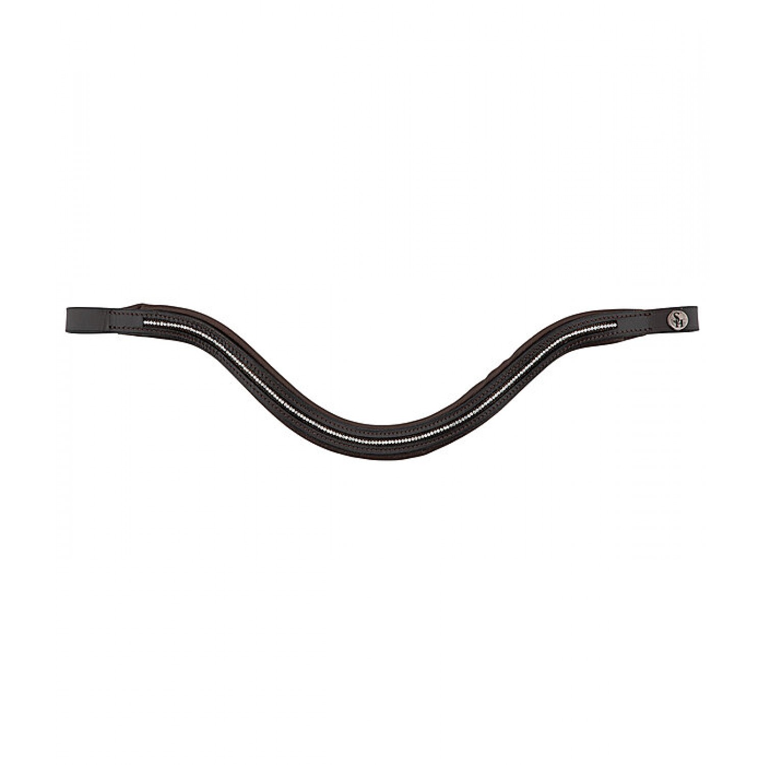 Уздечка с комбинированной носовой частью. Изогнутый налобный ремень усеян множеством маленьких сверкающих страз. Серебристые фитинги. С поводом, без трензеля.