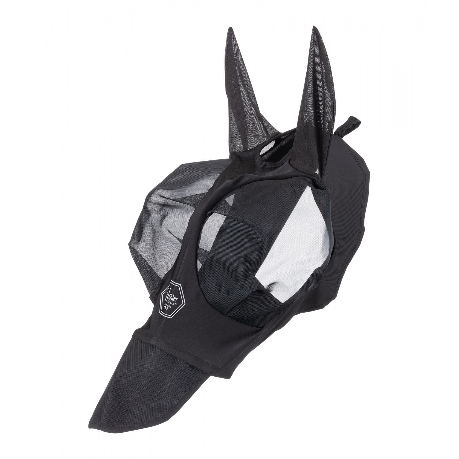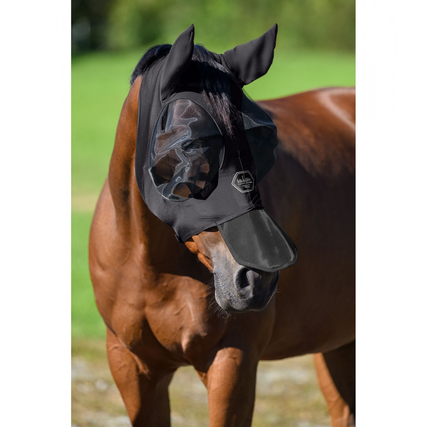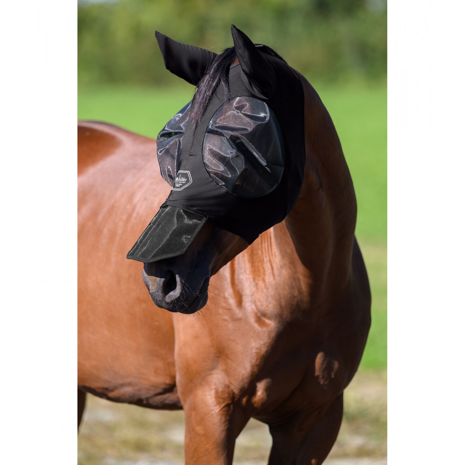 Плотно прилегающая эластичная маска от насекомых с прочной молнией и дополнительной застежкой-липучкой для надежной фиксации. Также имеется анатомически сформированная непрозрачная защита ноздрей, которая защищает чувствительную область носа лошади от воздействия солнца, создавая тень. Область вокруг глаз большого размера выполнена из жесткого, сохраняющего форму сетчатого материала, обеспечивающего безопасное расстояние от глаз, и отделана мягким флисом. Мелкоячеистая сетка блокирует не менее 50% УФ-излучения, обеспечивая при этом хорошую видимость. Легкий, высокоэластичный материал Lycra обеспечивает защиту UPF 50+, блокируя не менее 97% УФ-излучения. Ушные части изготовлены из эластичного перфорированного материала. Имеет отверстие для передней части головы и светоотражающий логотип на переносице. Материал маски и ушей: 88% полиэстер, 12% эластан; сетчатый материал: 100% нейлон.