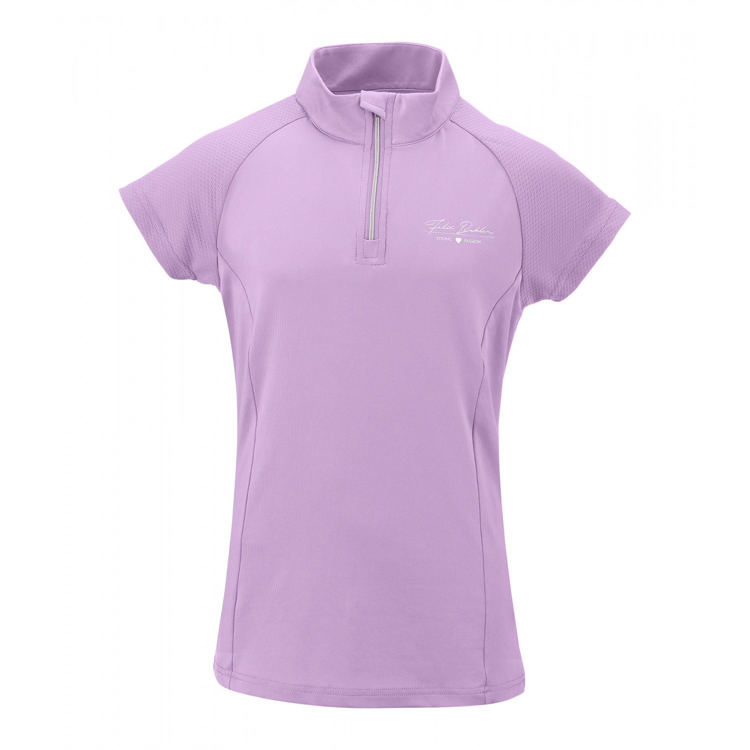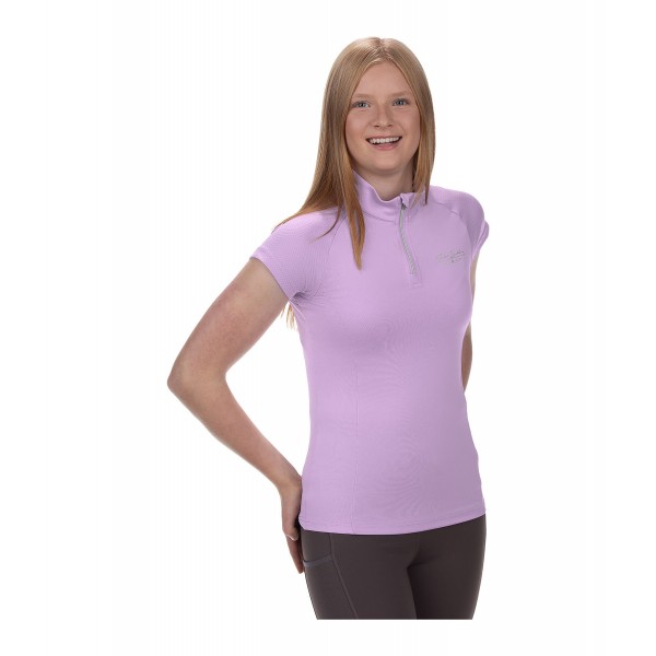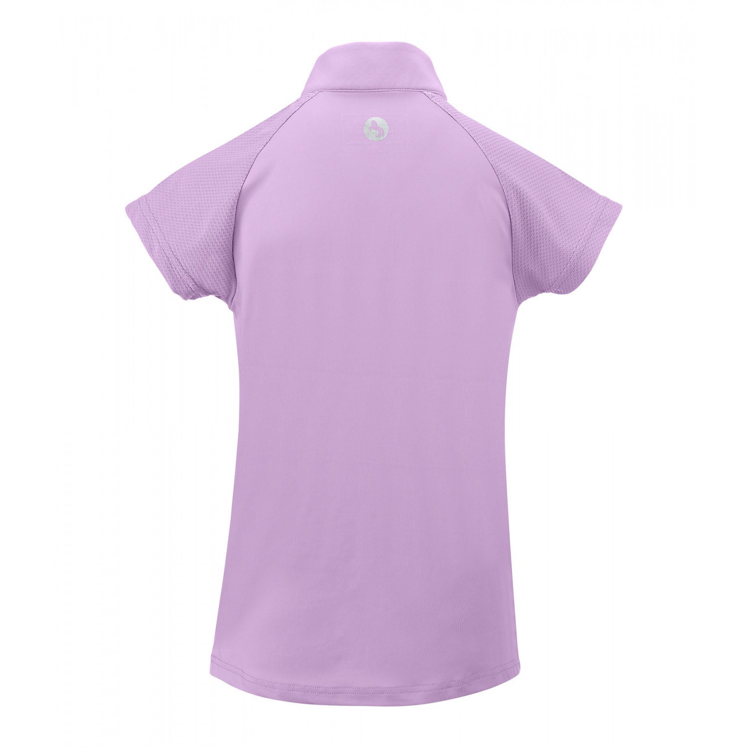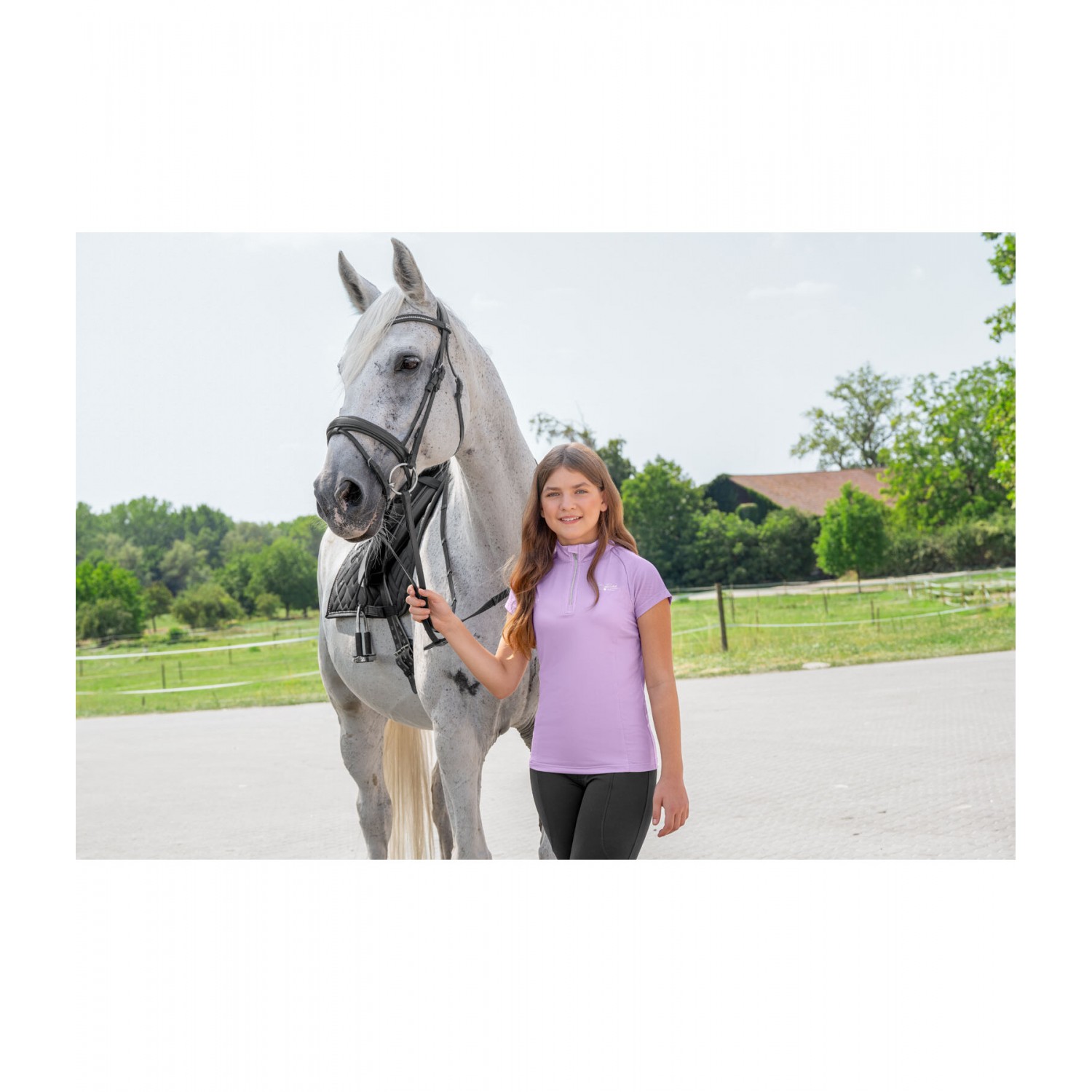 Спортивная, дышащая и быстросохнущая детская функциональная рубашка с сетчатыми рукавами реглан, воротником-стойкой на молнии и защитой подбородка. Принт-логотип на груди и тонкий принт в виде лошади на спине под воротником. 88% полиэстер, 12% эластан.