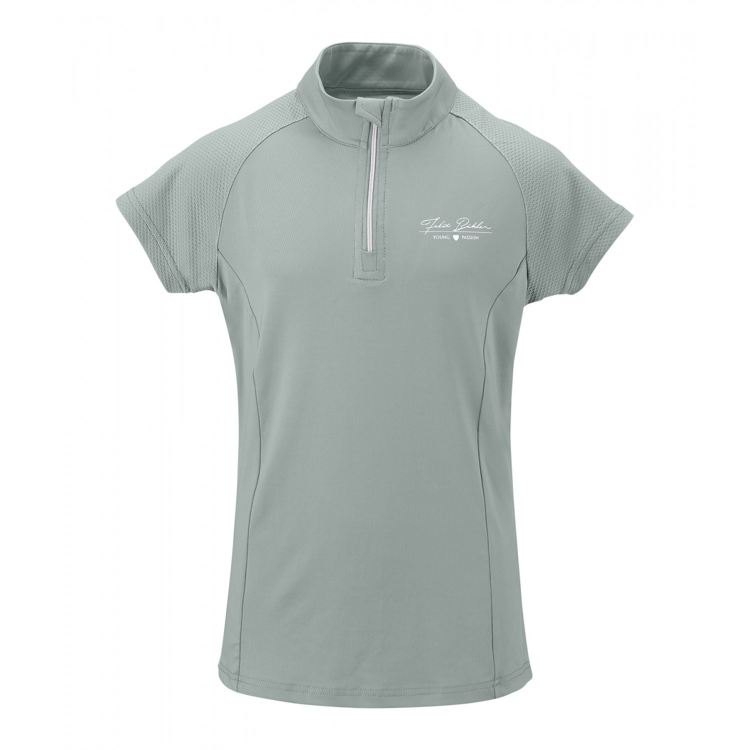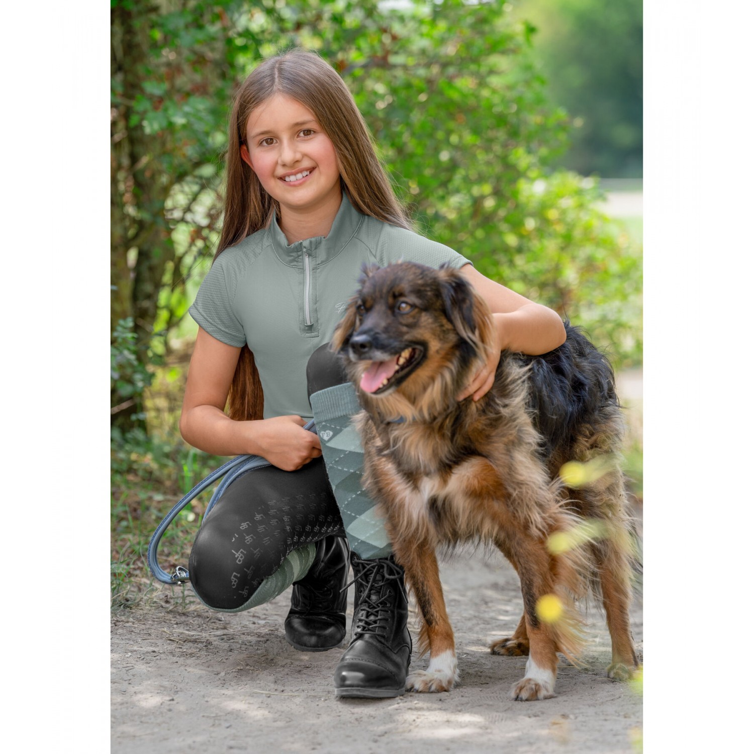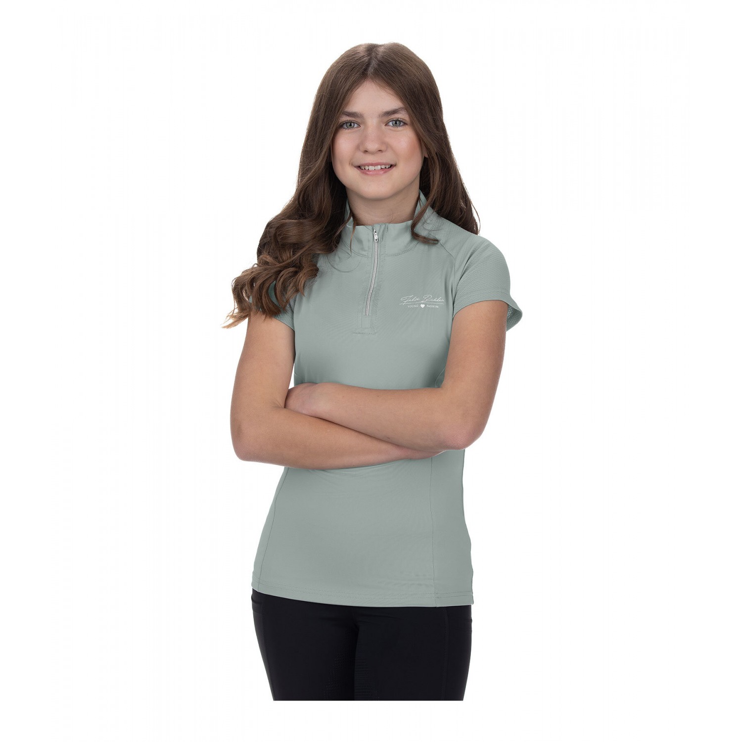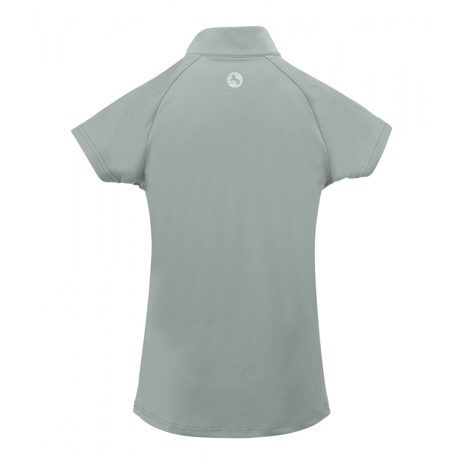 Спортивная, дышащая и быстросохнущая детская функциональная рубашка с сетчатыми рукавами реглан, воротником-стойкой на молнии и защитой подбородка. Принт-логотип на груди и тонкий принт в виде лошади на спине под воротником. 88% полиэстер, 12% эластан.