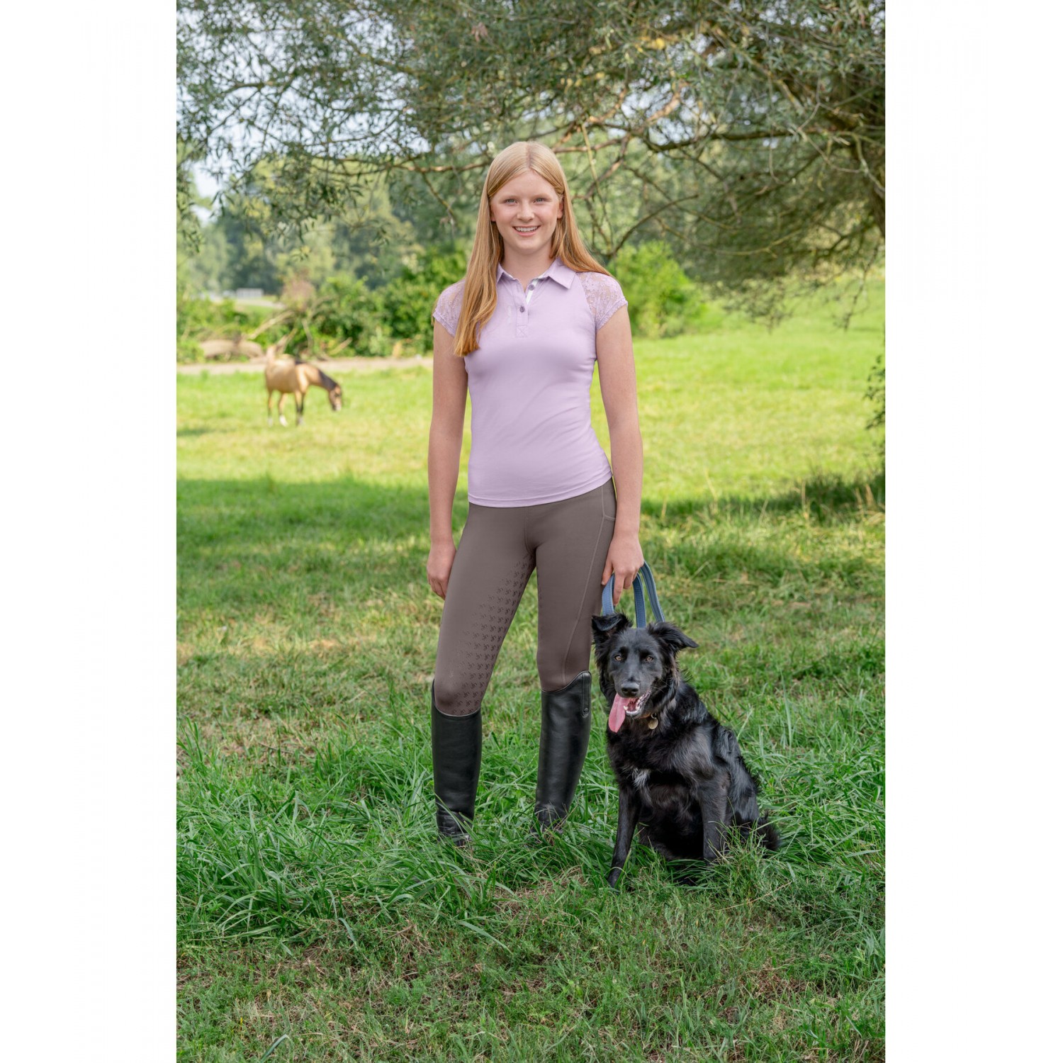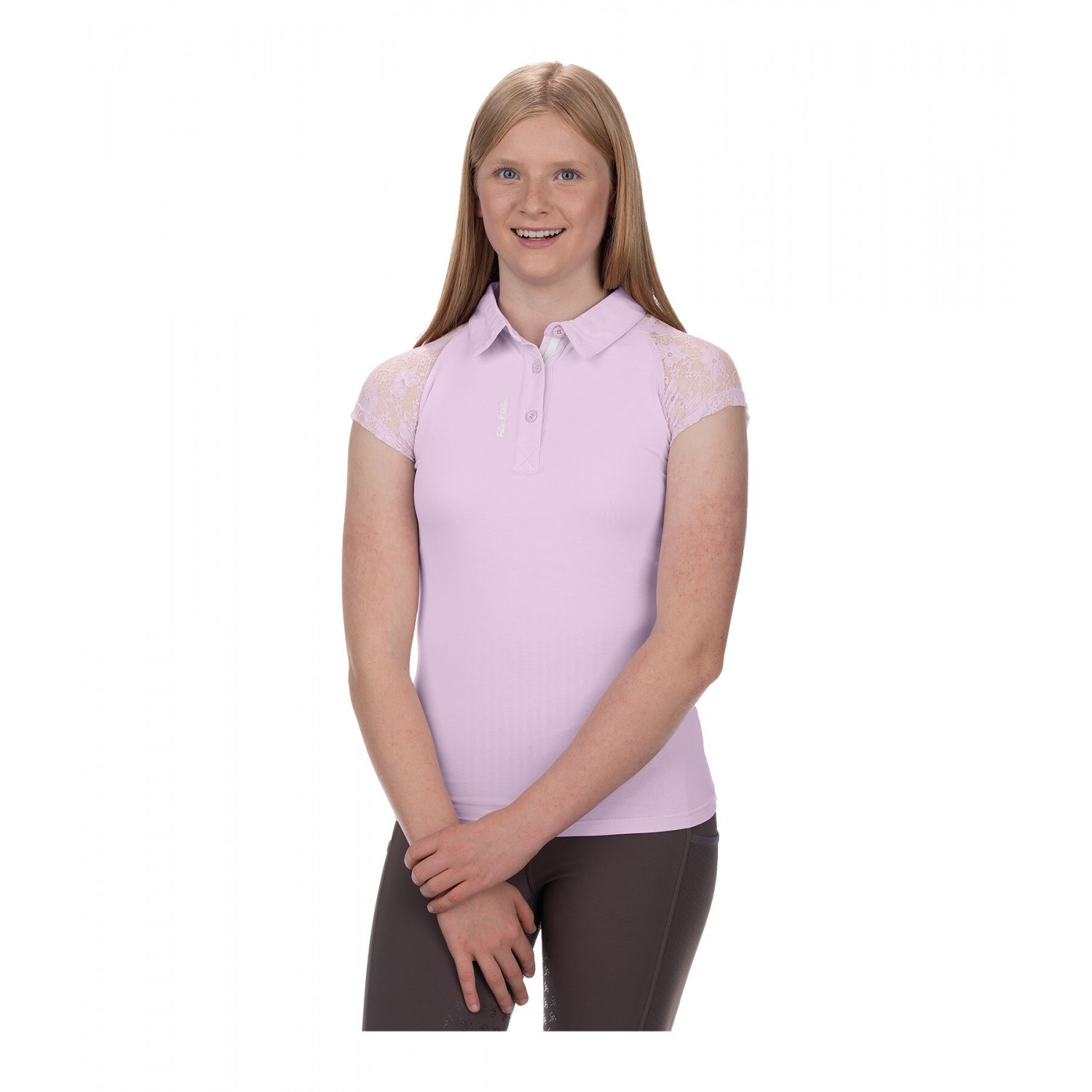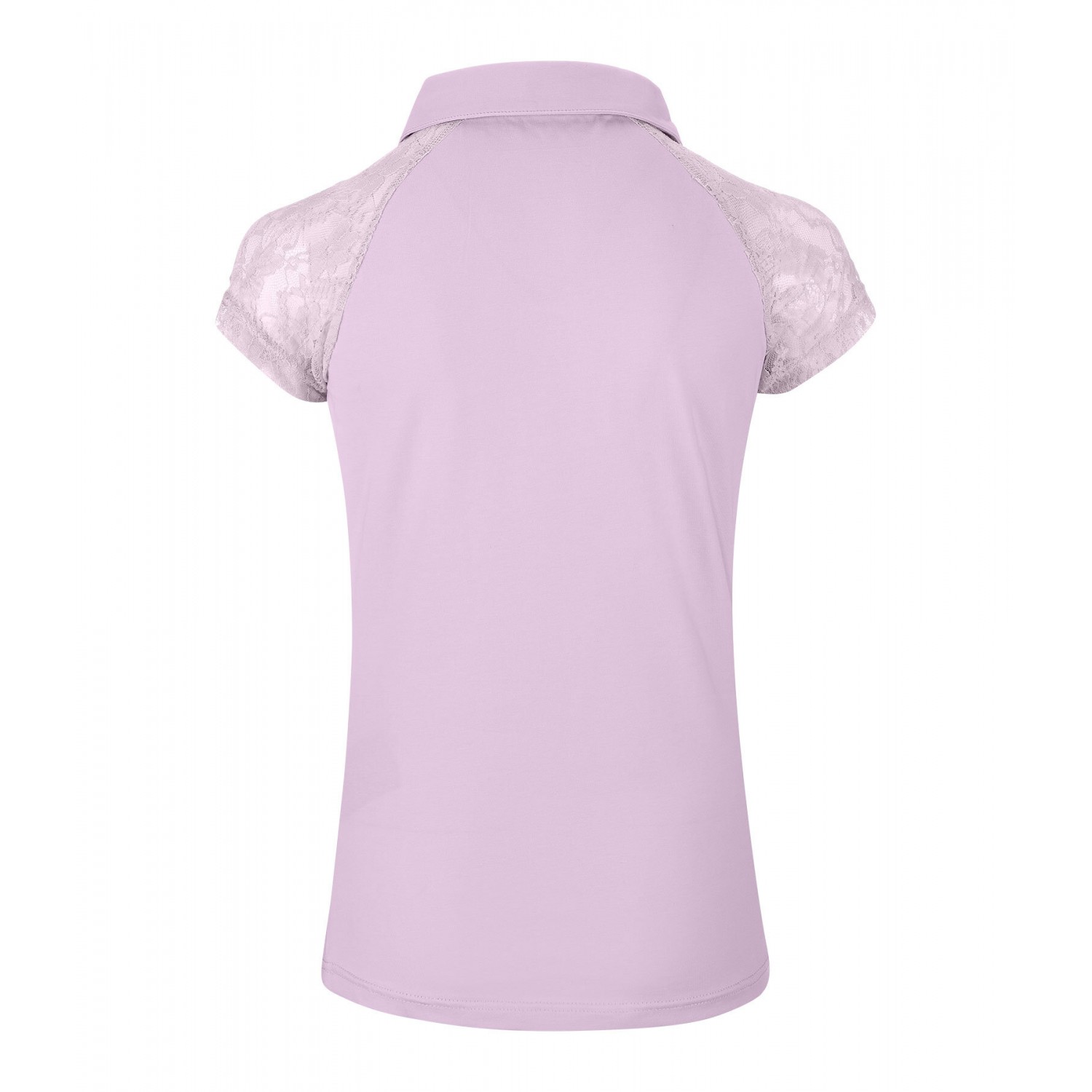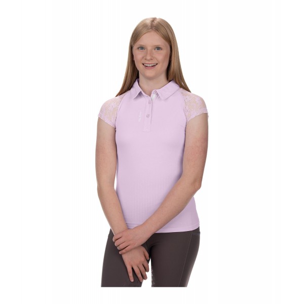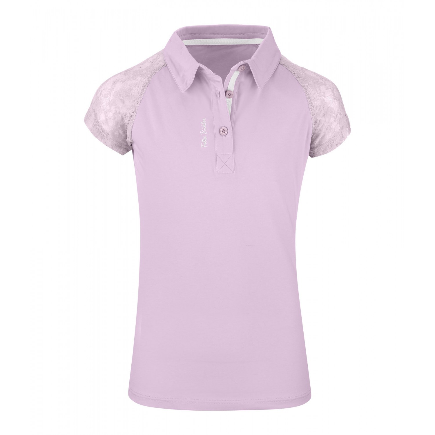 Милая детская рубашка-поло из эластичного хлопкового трикотажа с рукавами реглан из тонкого эластичного кружева. Дышащая, вышивка логотипа на планке с пуговицами. 95% хлопок, 5% спандекс.