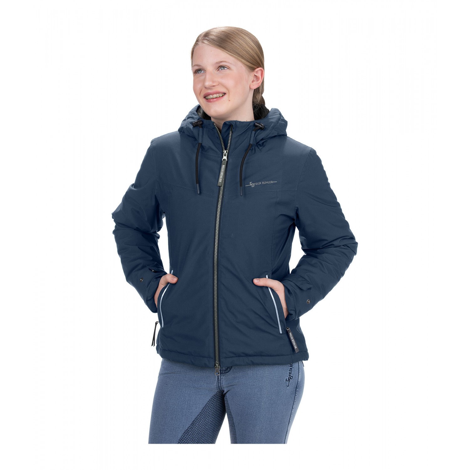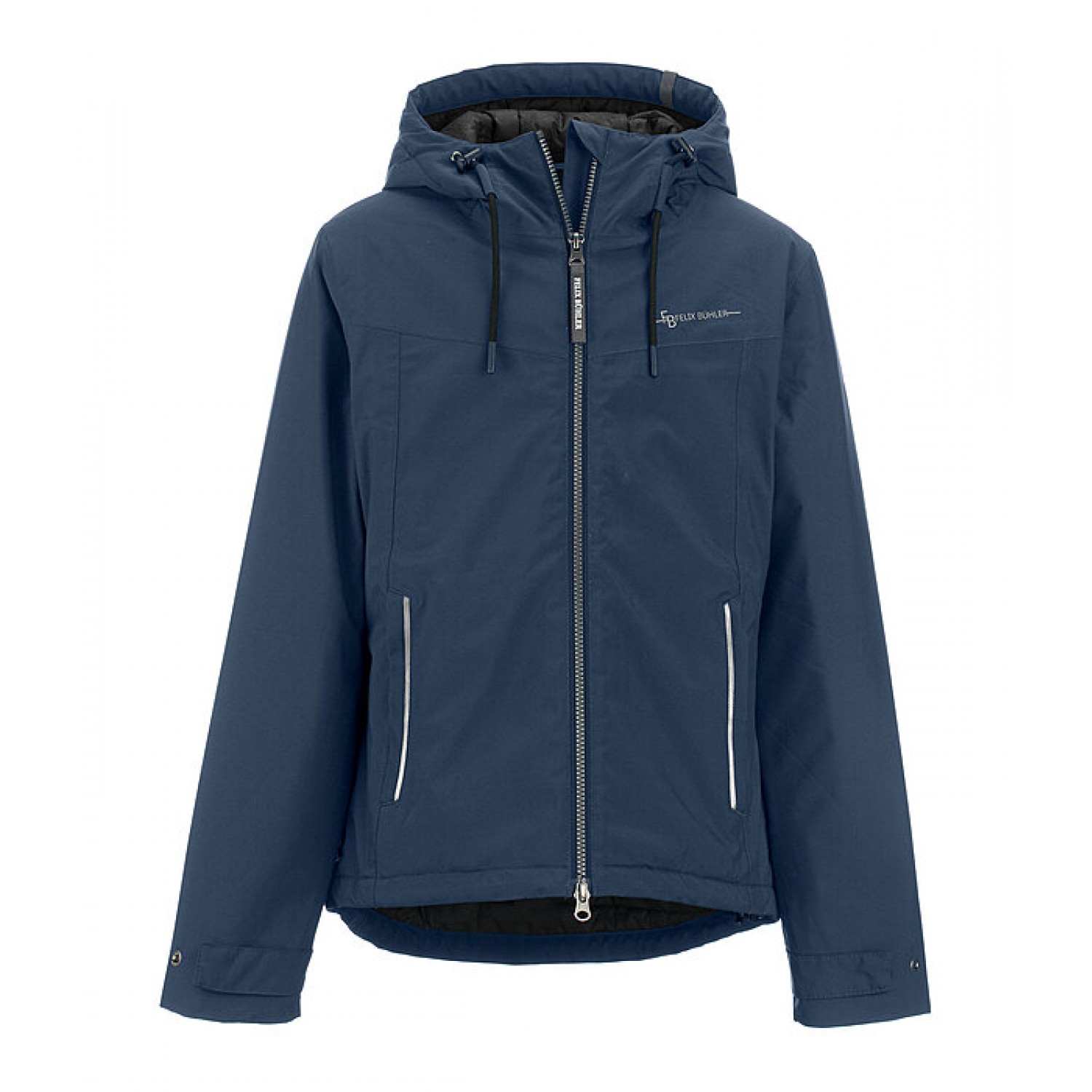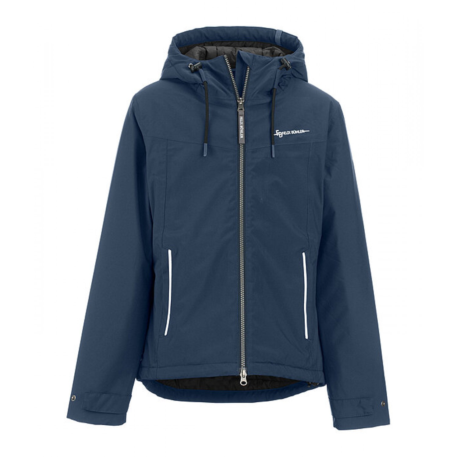 Высокофункциональная укороченная куртка с капюшоном, на тёплой подкладке с пухоподобным утеплителем. Высокая водонепроницаемость, ветронепроницаемость и воздухопроницаемость. Два кармана для рук на молнии, двусторонняя молния на подкладке, регулируемая талия, регулируемый капюшон, регулируемые манжеты, светоотражающий принт Felix Bühler на груди. 100% полиэстер, подкладка 100% нейлон.