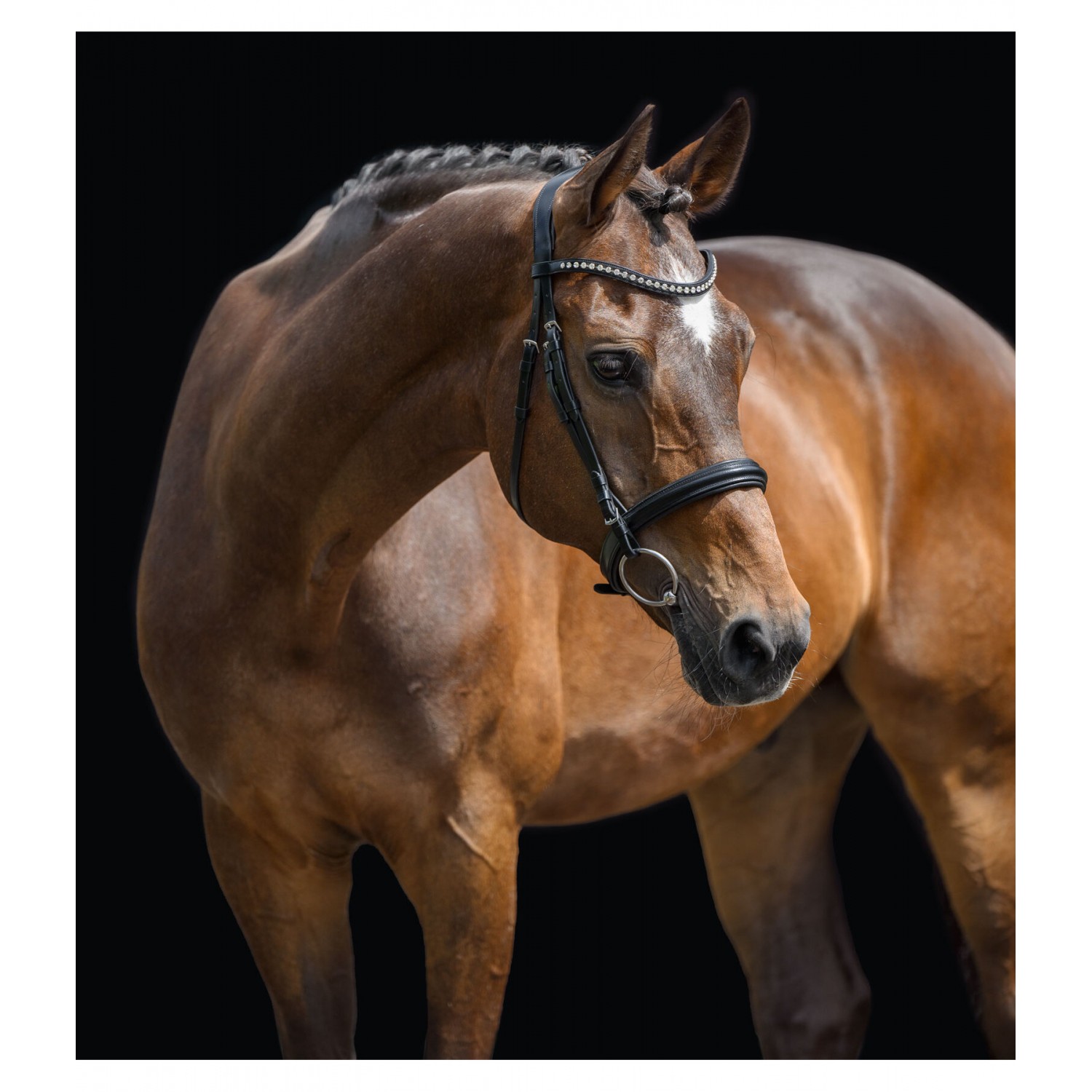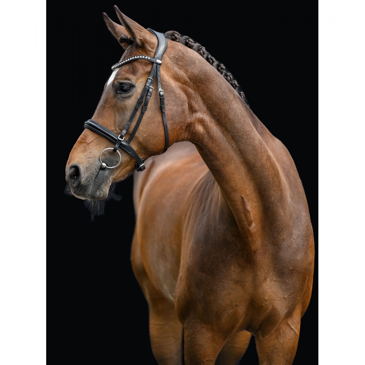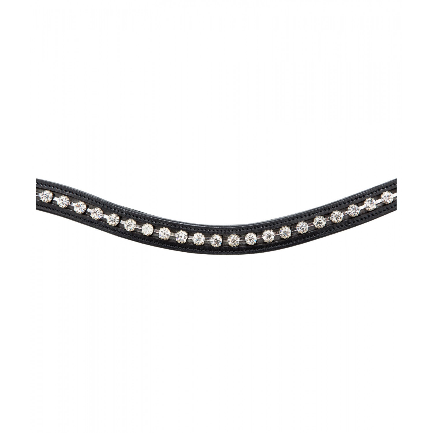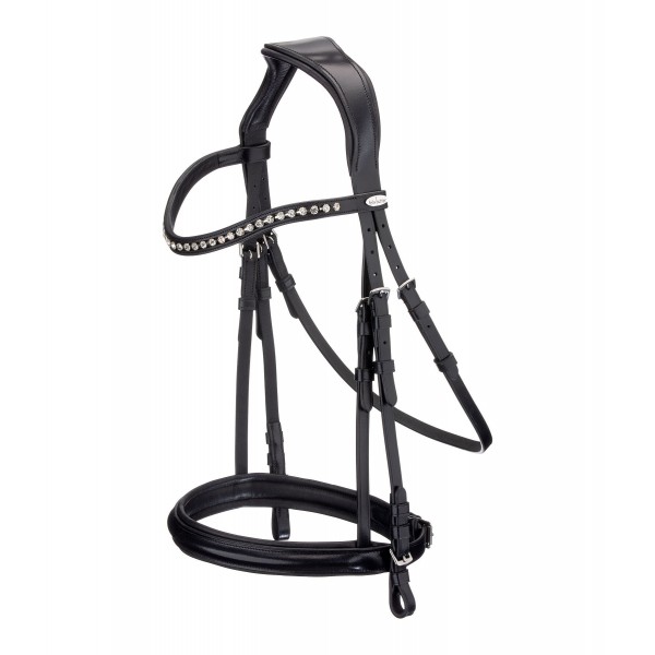 Привлекательная спортивная уздечка с анатомически сформированным, мягко облегающим суголовным ремнем для максимального комфорта. Классический изогнутый налобник с красивыми серебряными стразами. Без повода и трензеля. Натуральная кожа.