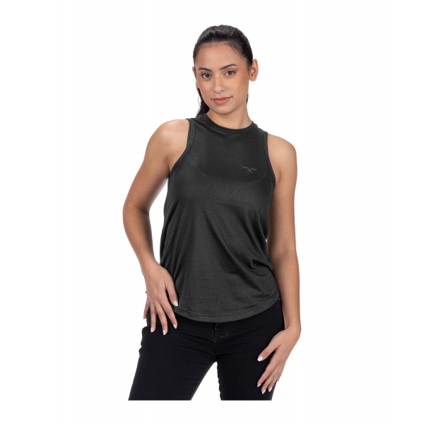 Свободная, дышащая майка из сетчатого материала с высоким круглым вырезом. 85% полиэстер, 15% хлопок.