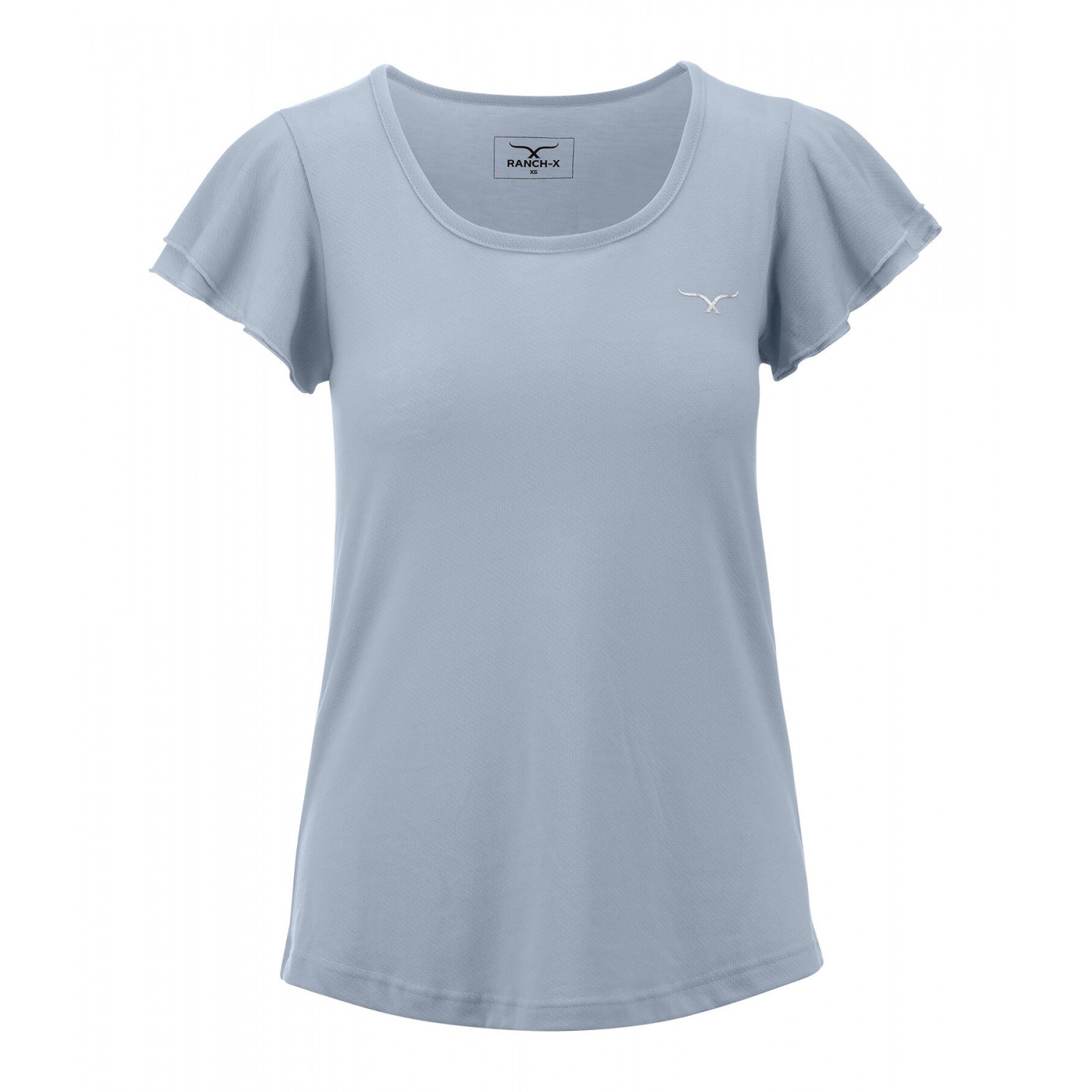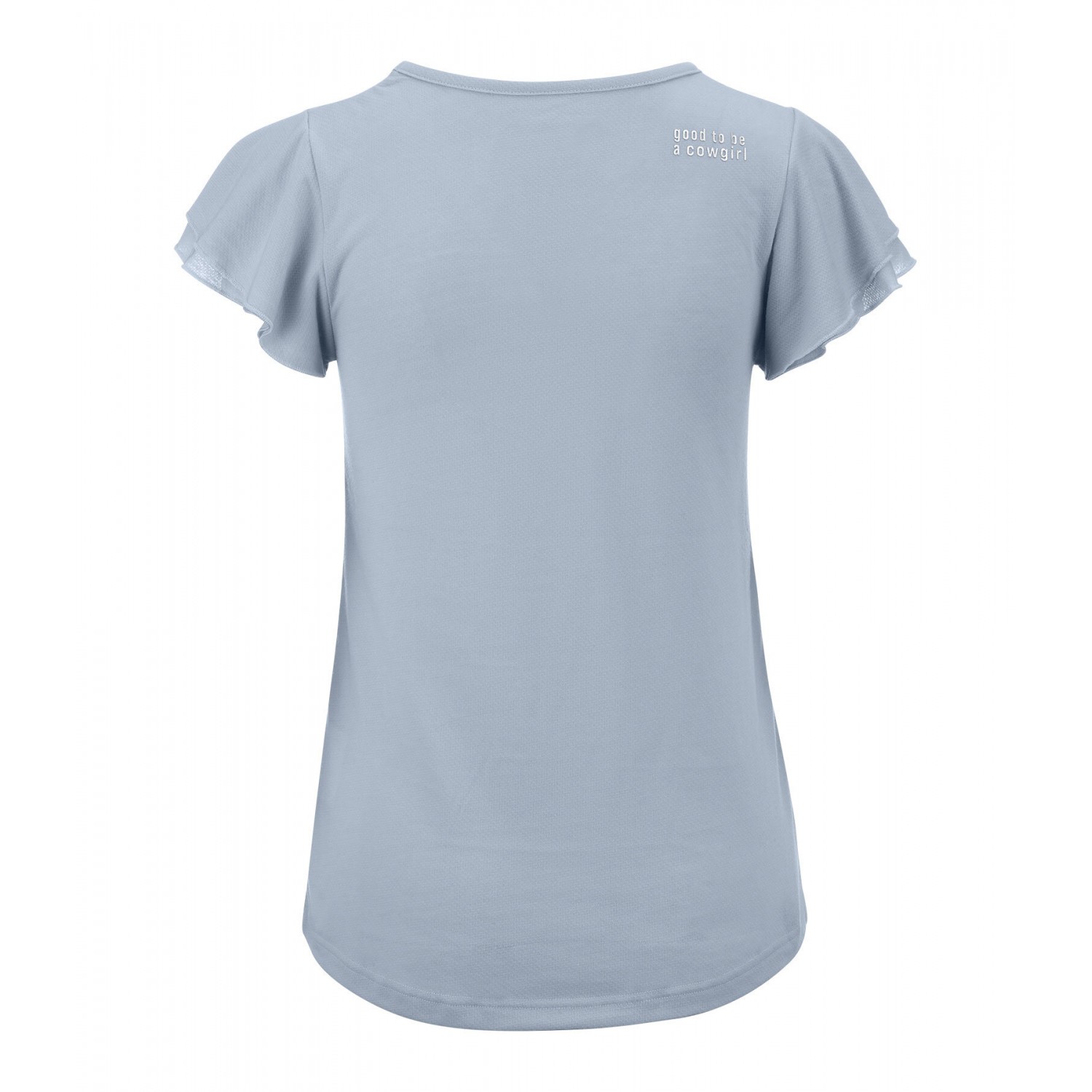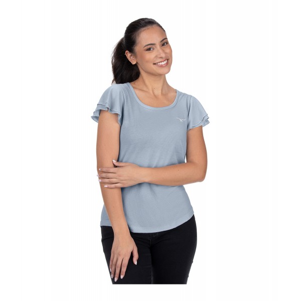 Легкая сетчатая футболка с многослойными рукавами-воланами и блестящими принтами на груди и плечах. Свободный крой и квадратный вырез горловины. 85% полиэстер, 15% хлопок.