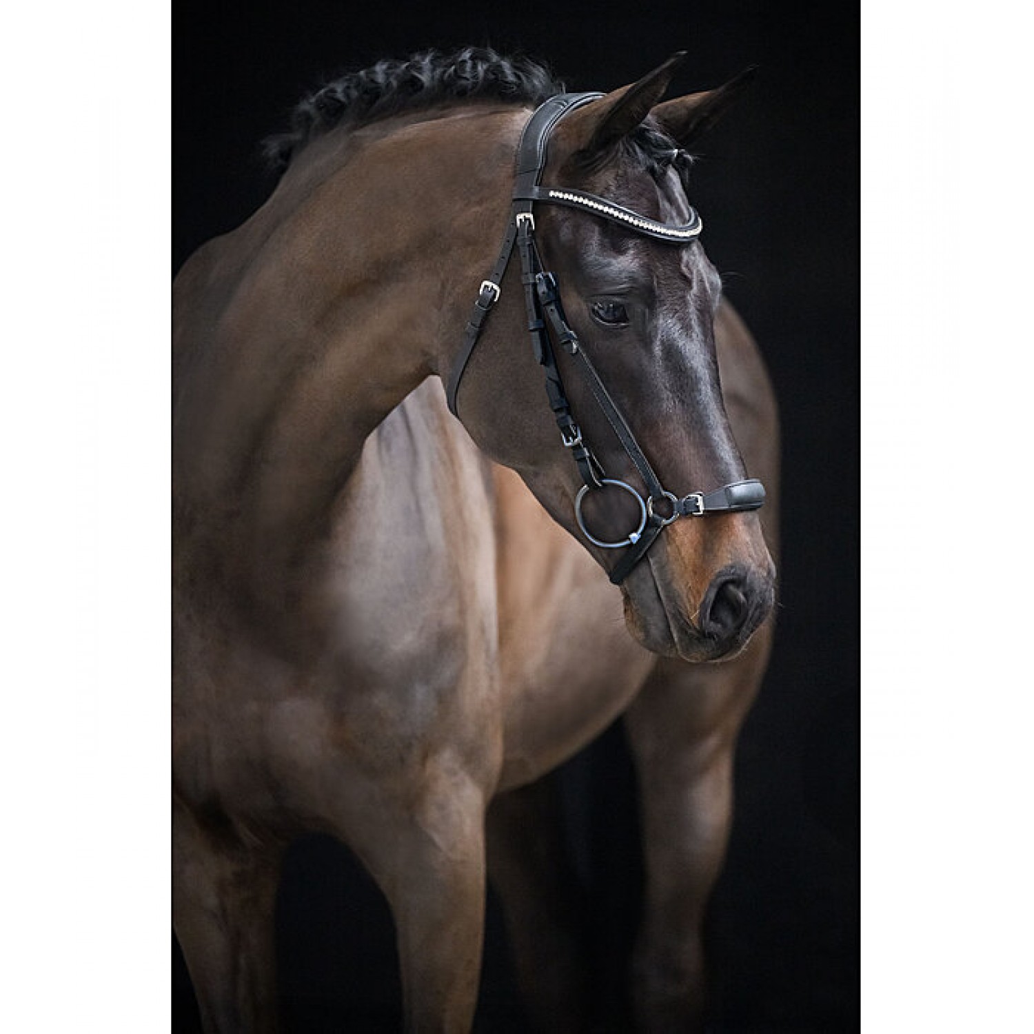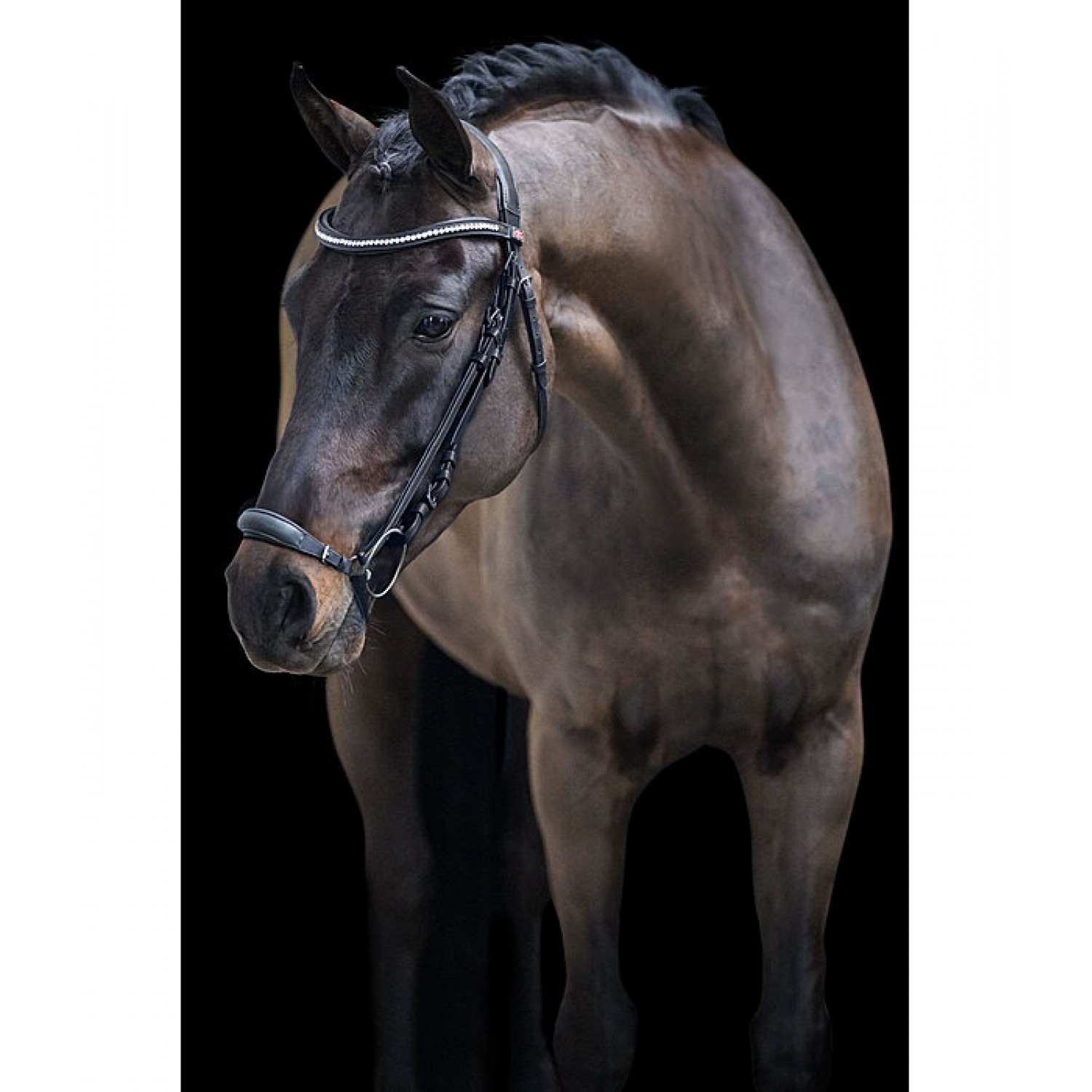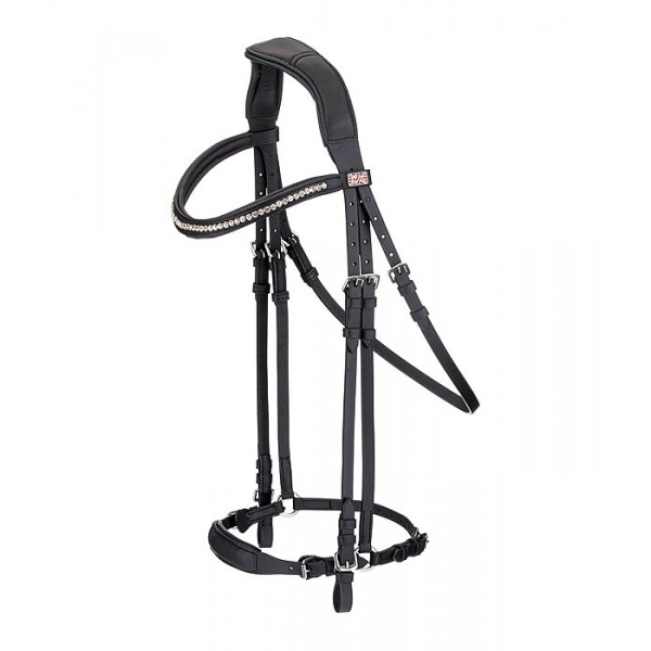 Исключительно мягкая уздечка с носовым ремнём в ганноверском стиле. Анатомическая форма оголовья. Изогнутый налобник со стразами. Оголовье, налобник, носовой ремень и подбородочный ремень имеют мягкую подкладку из натуральной кожи. Носовой ремень регулируется. Фурнитура серебристого цвета. Повод и трензель в комплект не входят.