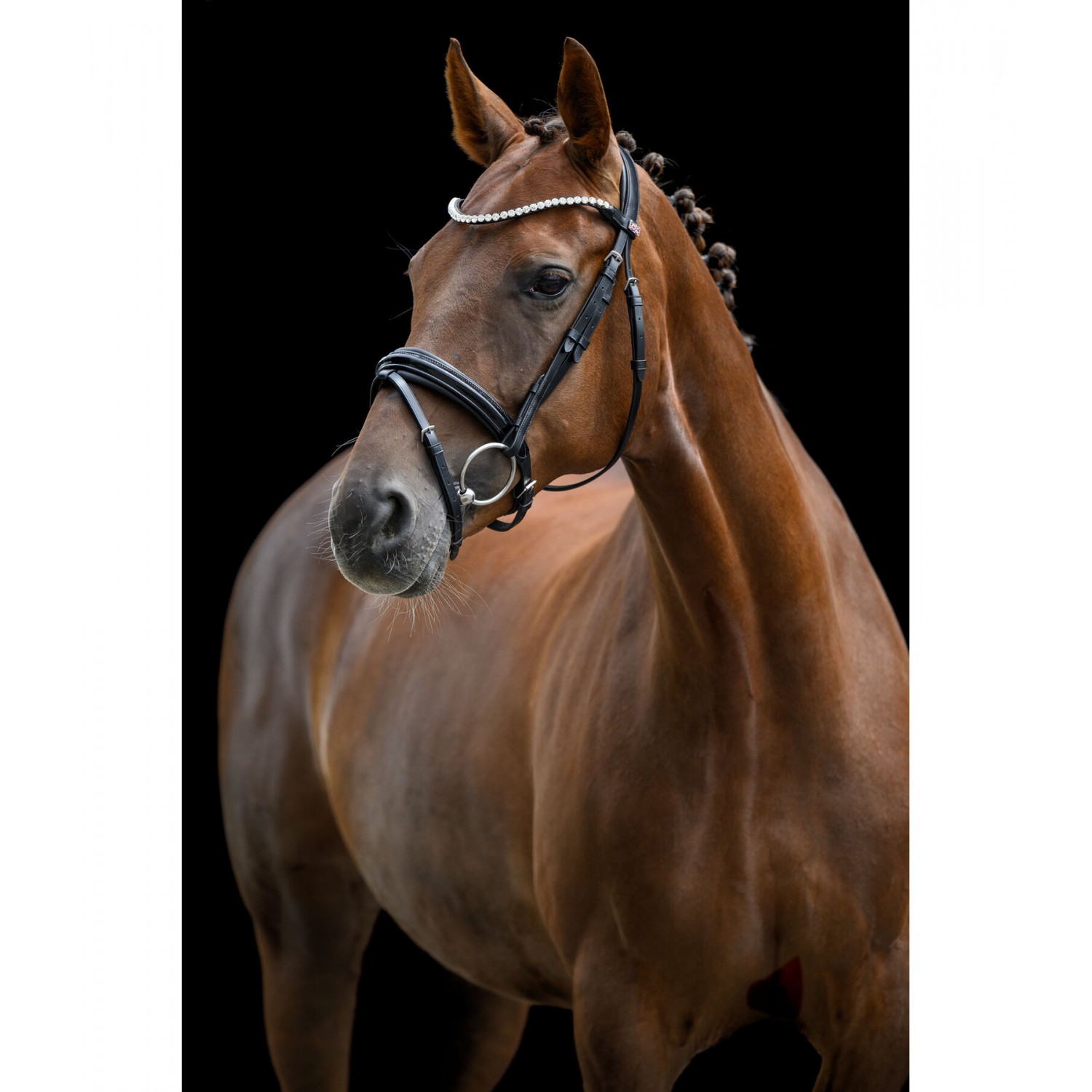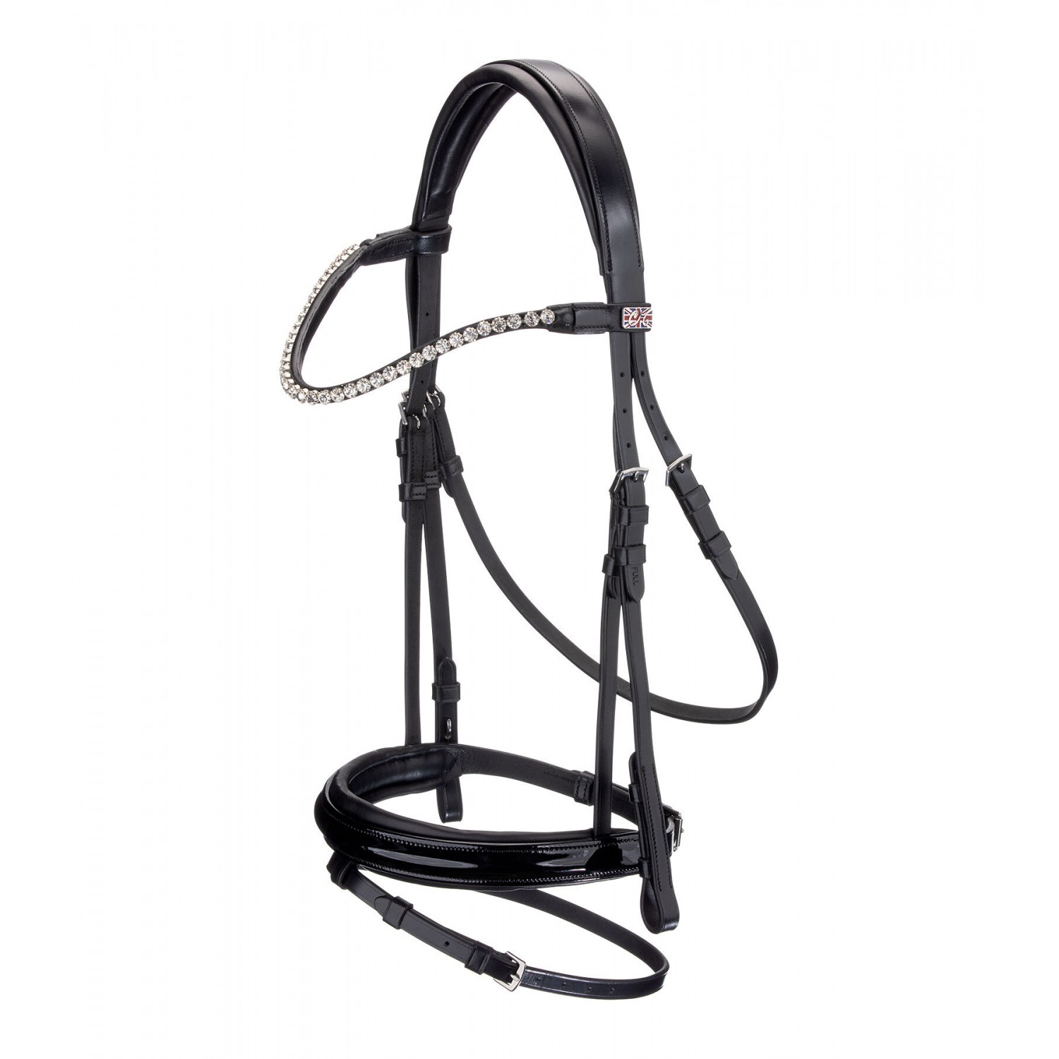 Элегантная кожаная уздечка с отделкой под лакированную кожу и эффектным налобником, украшенным крупными стразами. Тщательно обработанная кожа исключительно мягкая, что обеспечивает оптимальное распределение давления и облегчение боли. Уздечка имеет мягкую подкладку из натуральной кожи на затылке и наноснике. Повод и трензель в комплект не входят. Натуральная кожа.