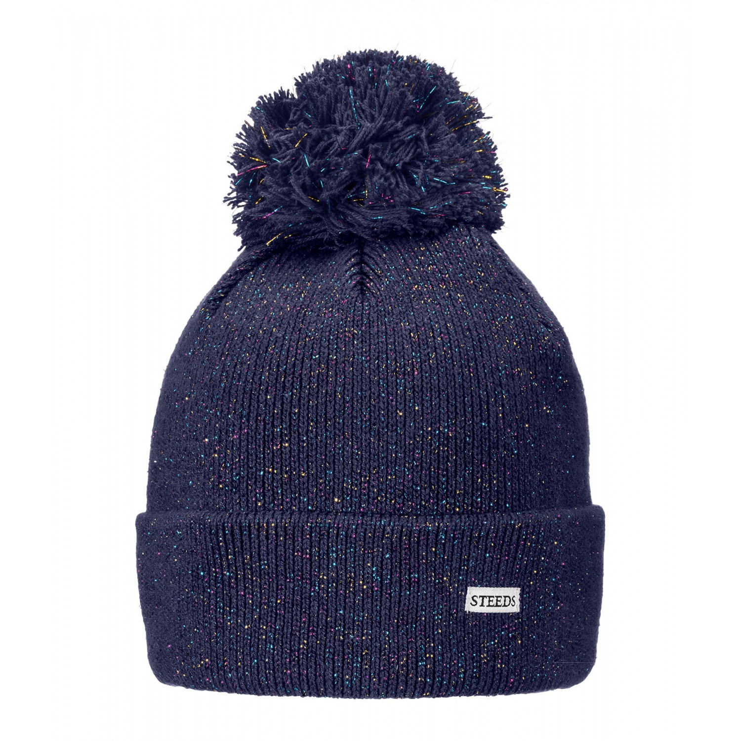 Детская шапочка, связанная с использованием блестящей пряжи всех цветов радуги и помпона. Состав: 60% хлопок, 40% полиакрил.