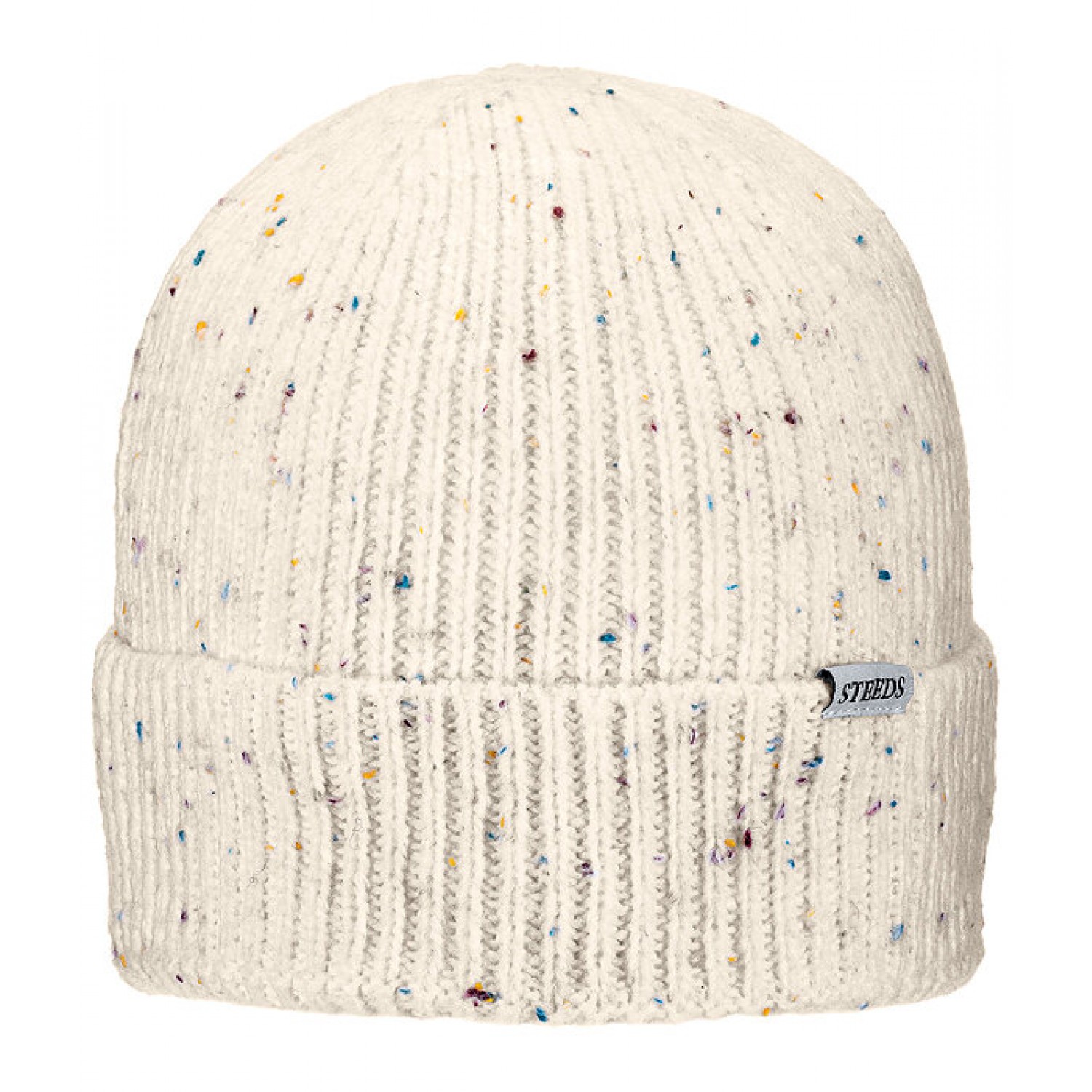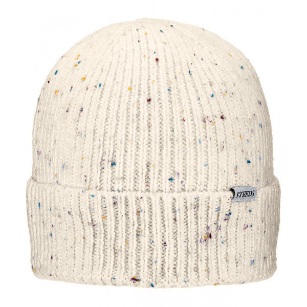 Детская шапка тонкой вязки из яркой пряжи. Спереди — незаметный лейбл STEEDS. Состав: 55% полиакрил, 38% нейлон, 5% шерсть, 2% полиэстер.