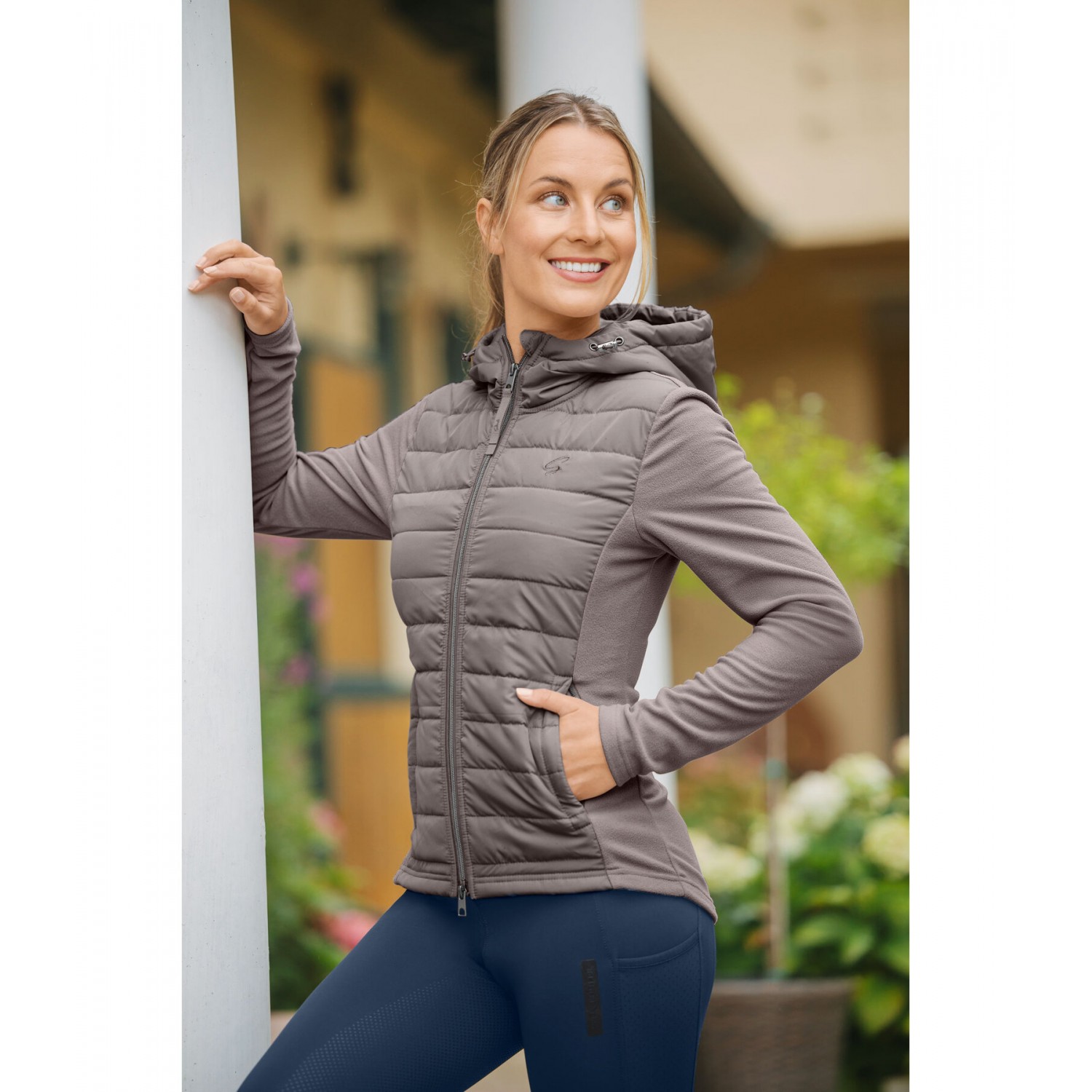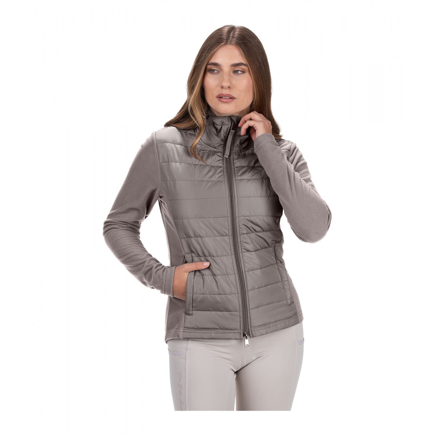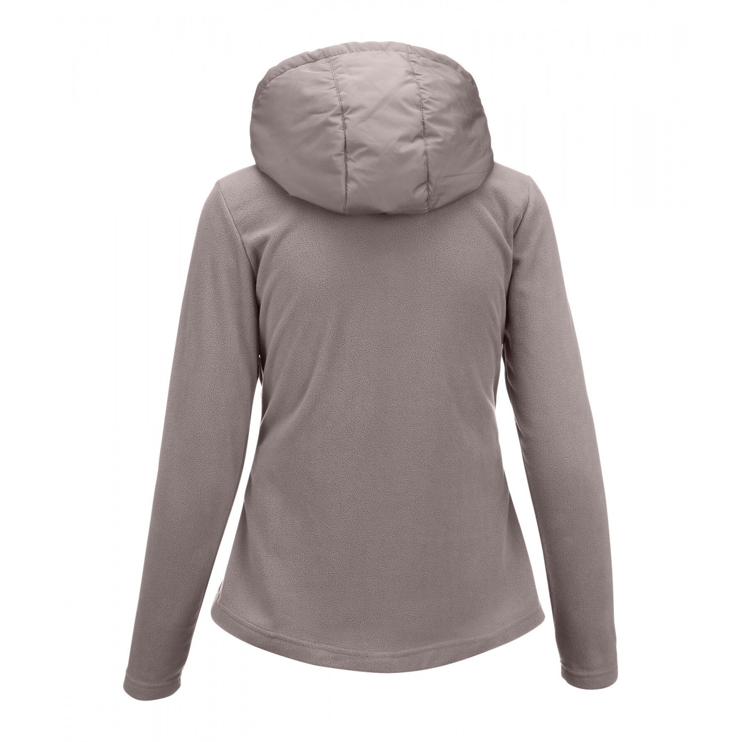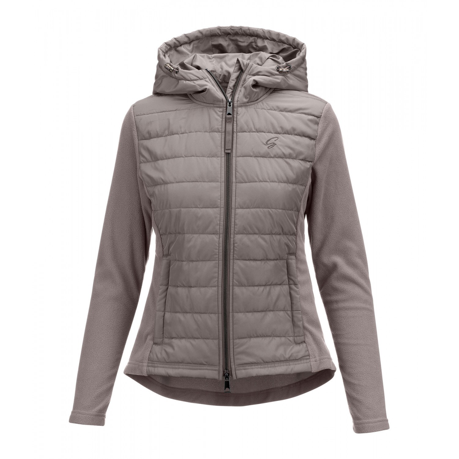 Стильное сочетание мягкого флиса и высококачественной микрофибры. Куртка со стеганой передней частью и флисовыми боковыми вставками. Регулируемый капюшон, который можно прикрепить сзади, подкладка, двусторонняя молния спереди с защитой подбородка, два передних кармана на молнии и блестящая вышивка на груди. 100% полиэстер.