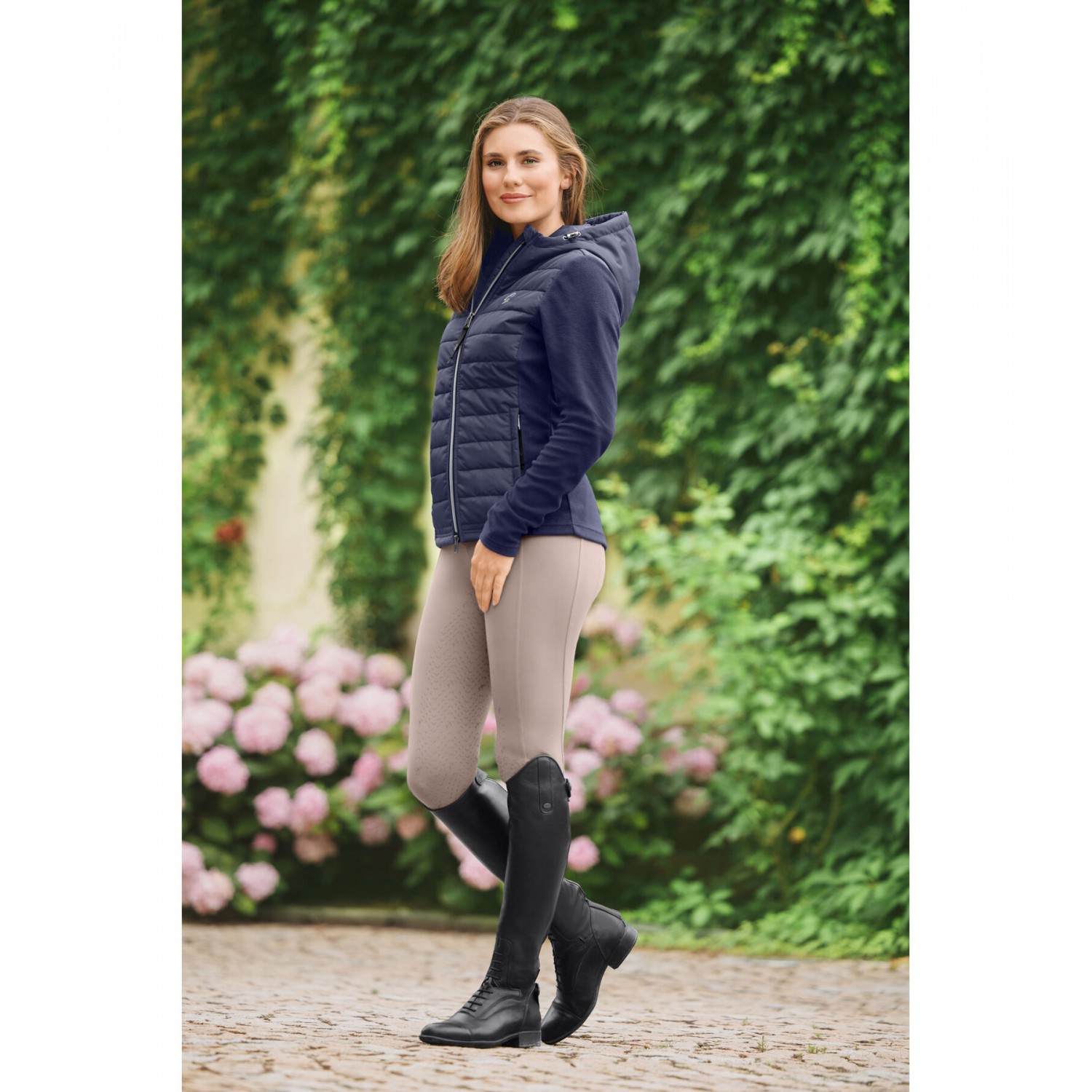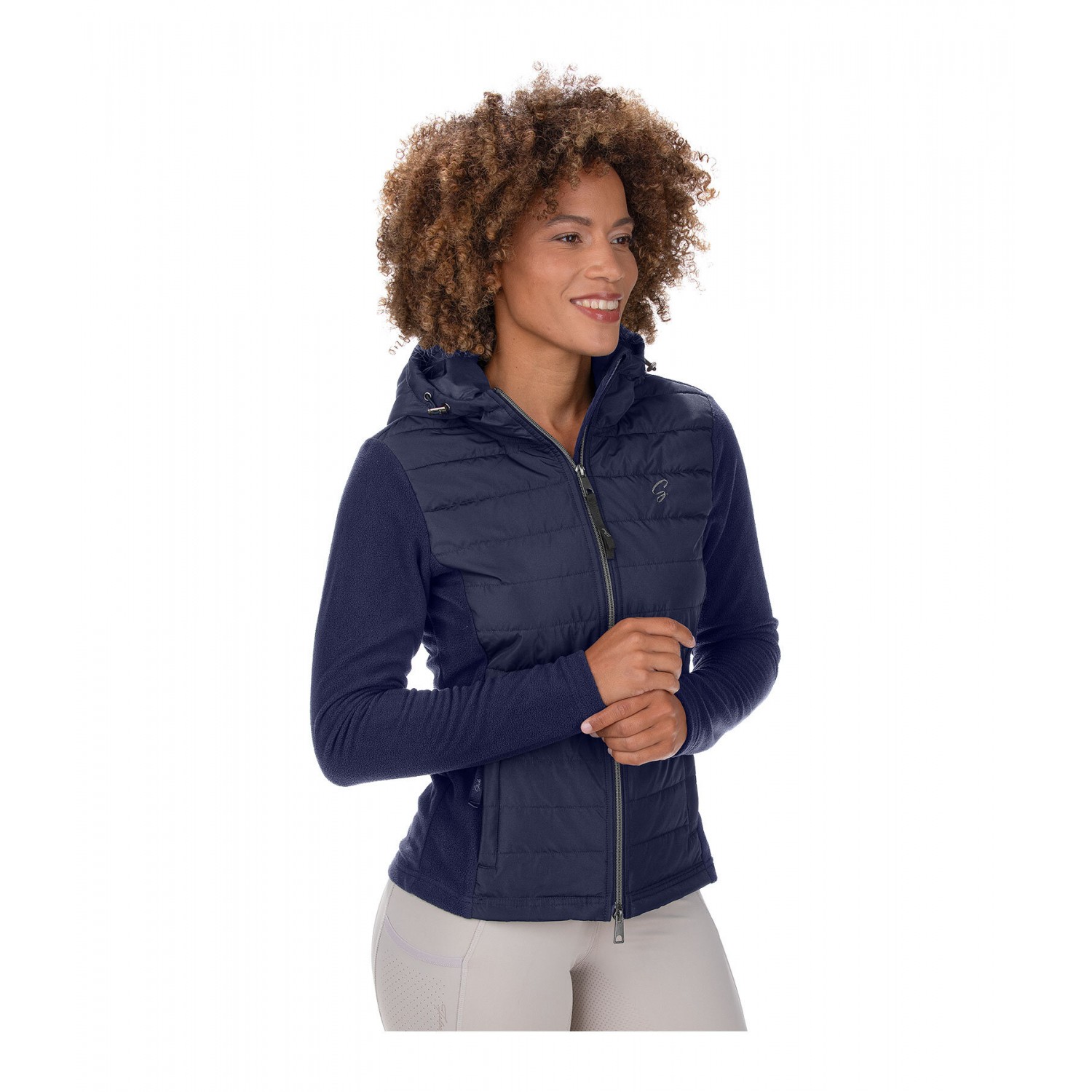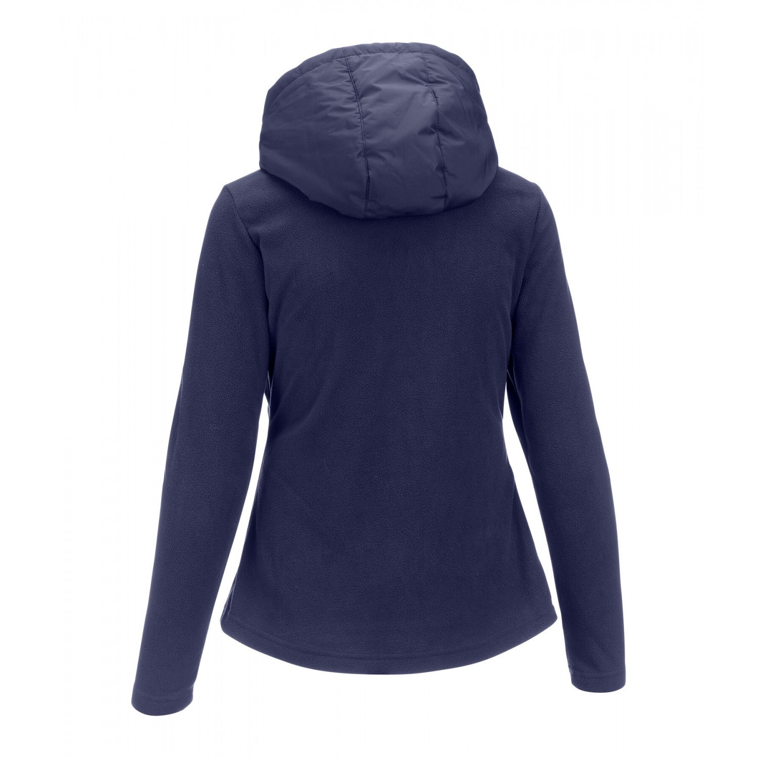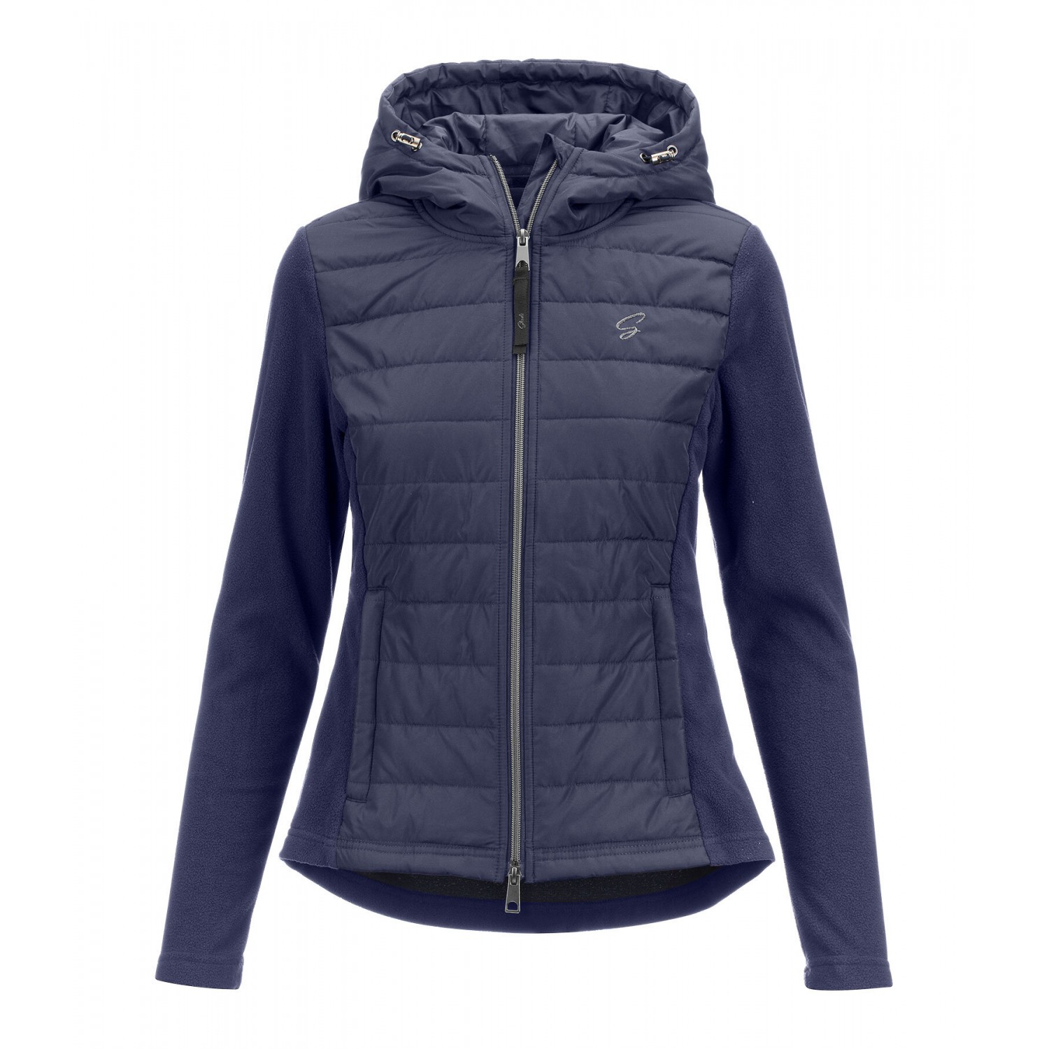 Стильное сочетание мягкого флиса и высококачественной микрофибры. Куртка со стеганой передней частью и флисовыми боковыми вставками. Регулируемый капюшон, который можно прикрепить сзади, подкладка, двусторонняя молния спереди с защитой подбородка, два передних кармана на молнии и блестящая вышивка на груди. 100% полиэстер.