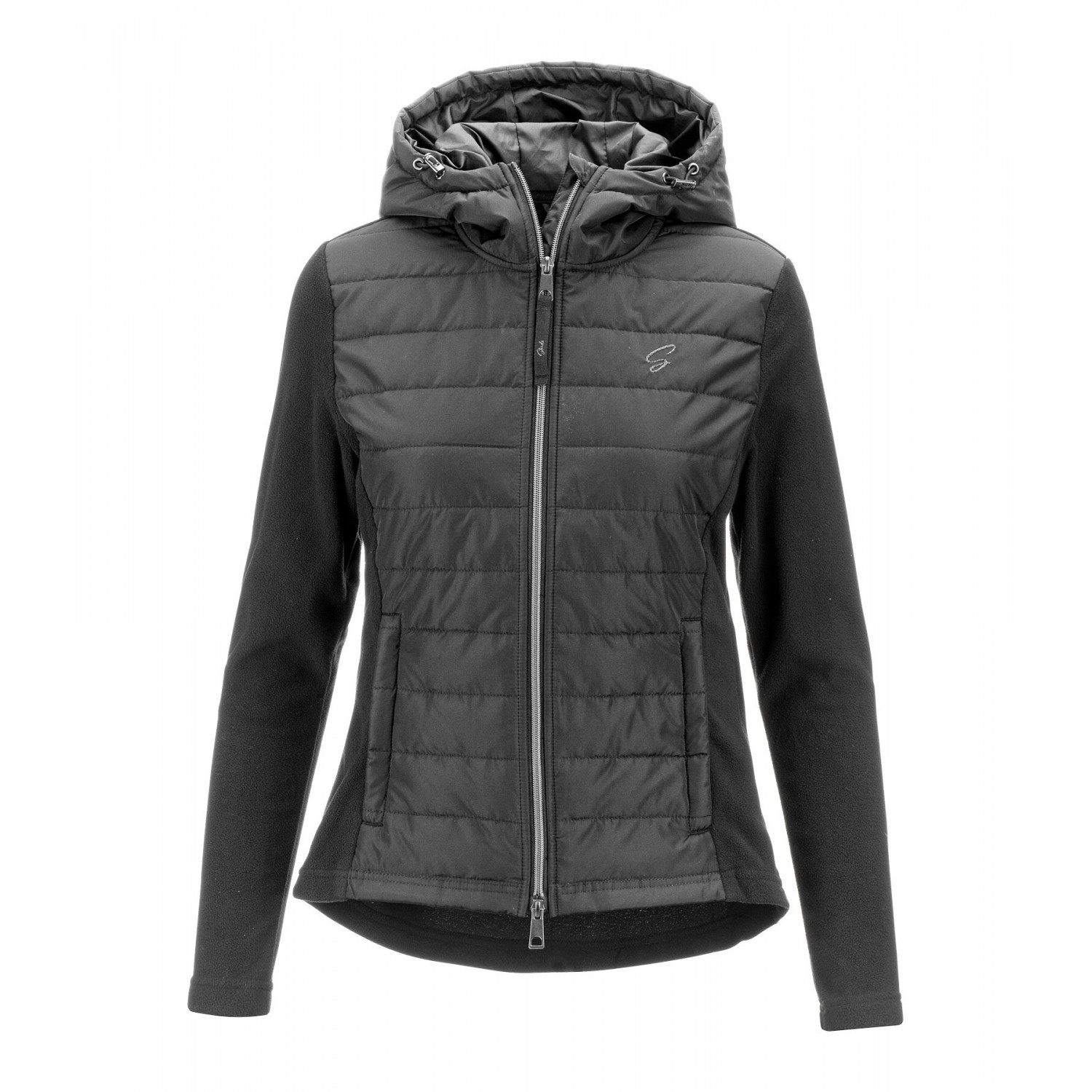 Стильное сочетание мягкого флиса и высококачественной микрофибры. Куртка со стеганой передней частью и флисовыми боковыми вставками. Регулируемый капюшон, который можно прикрепить сзади, подкладка, двусторонняя молния спереди с защитой подбородка, два передних кармана на молнии и блестящая вышивка на груди. 100% полиэстер.