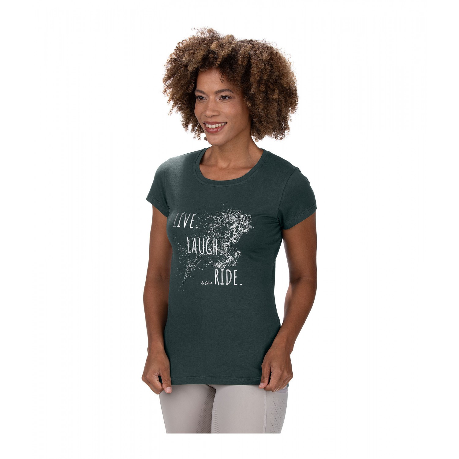 Футболка свободного кроя с круглым вырезом и красивым крупным девизом спереди. 95% хлопок, 5% полиэстер.