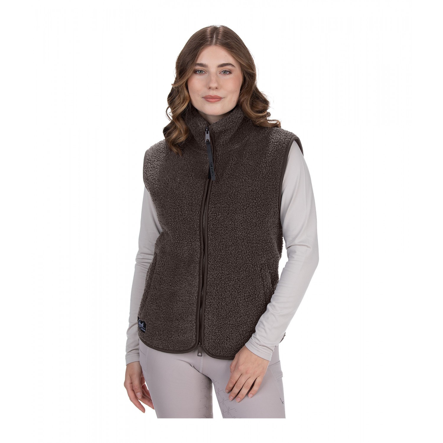 Уютный, мягкий, эластичный жилет из плюшевого флиса с воротником-стойкой. Удлиненная спина, двусторонняя молния на подкладке, 2 потайных кармана на молнии спереди и бирка STEEDS на подоле. 100% полиэстер.
