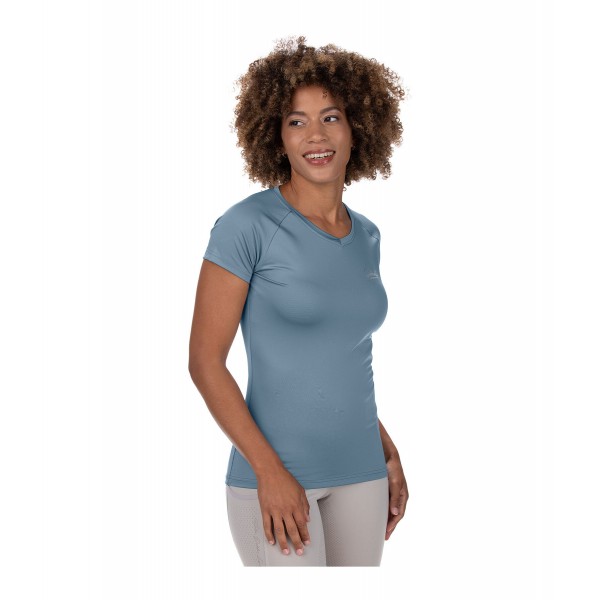 Эластичная футболка для верховой езды с короткими рукавами, V-образным вырезом и мерцающим принтом на груди. Дышащий и быстросохнущий материал. 88% полиэстер, 12% эластан.