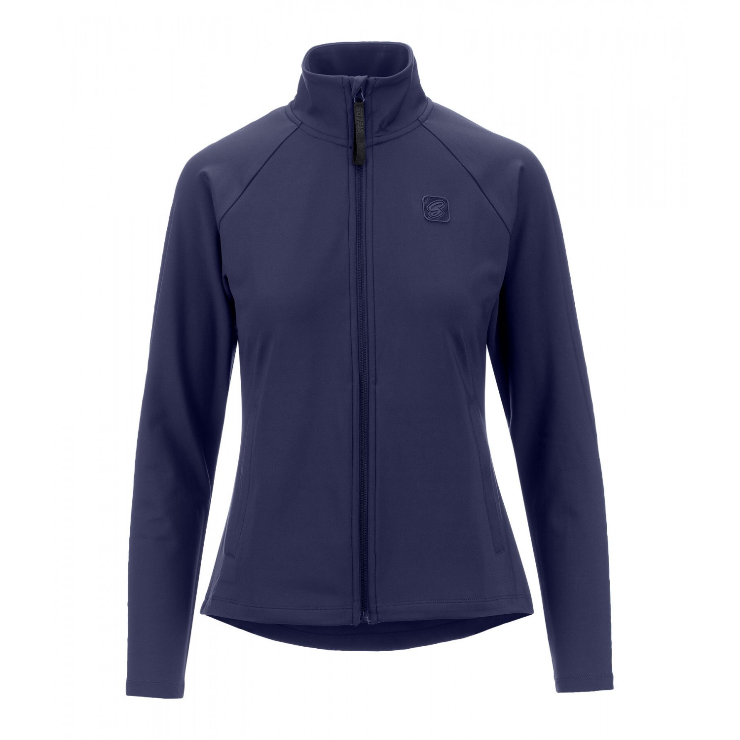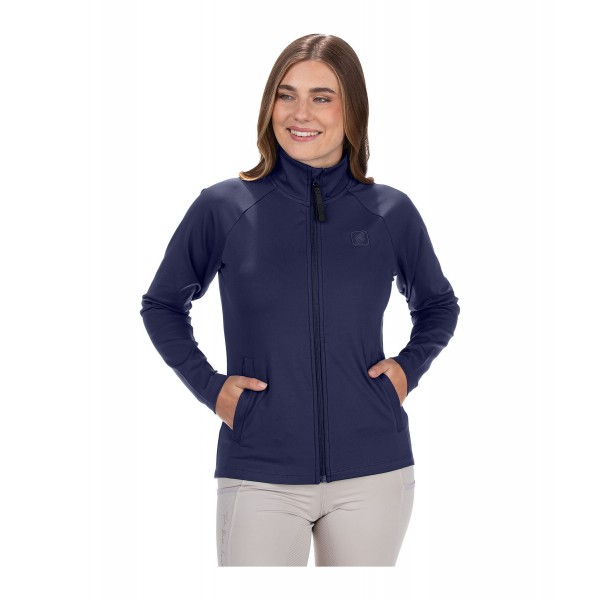 Спортивная эластичная куртка с воротником-стойкой. Дышащая и быстросохнущая. Имеет подкладку, застежку-молнию спереди и защиту подбородка, два передних кармана и логотип на груди. 79% полиэстер, 21% эластан.