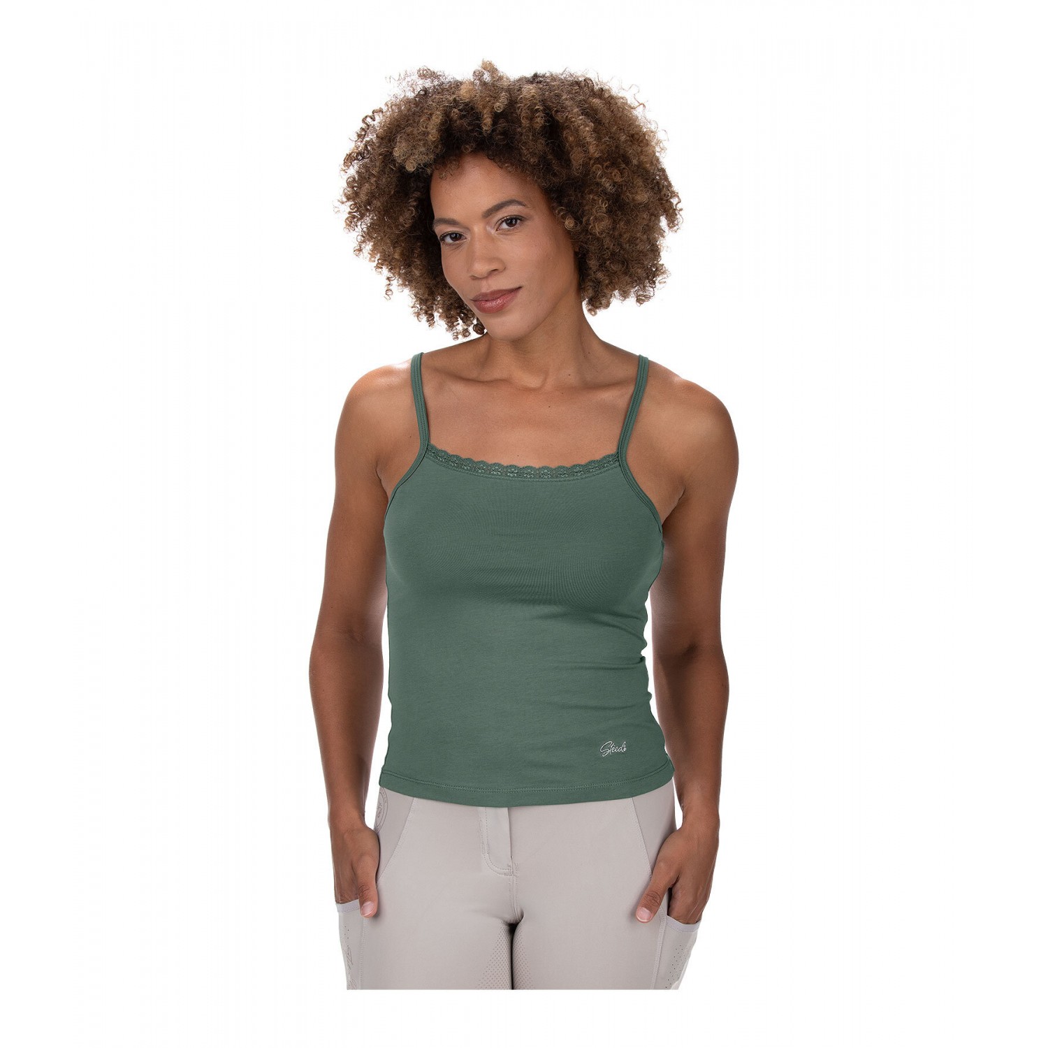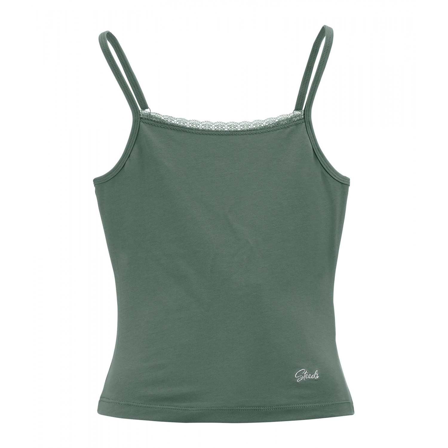 Укороченный топ на тонких бретельках с изящной кружевной отделкой. Изготовлен из мягкого, комфортного хлопкового трикотажа. Регулируемые бретельки и вышитый логотип спереди. 95% хлопок, 5% эластан.