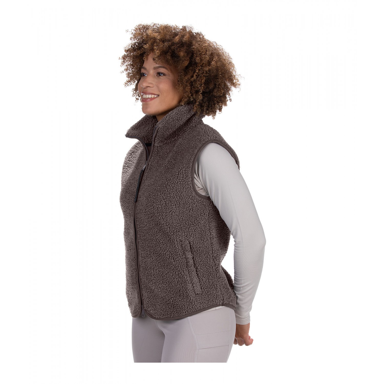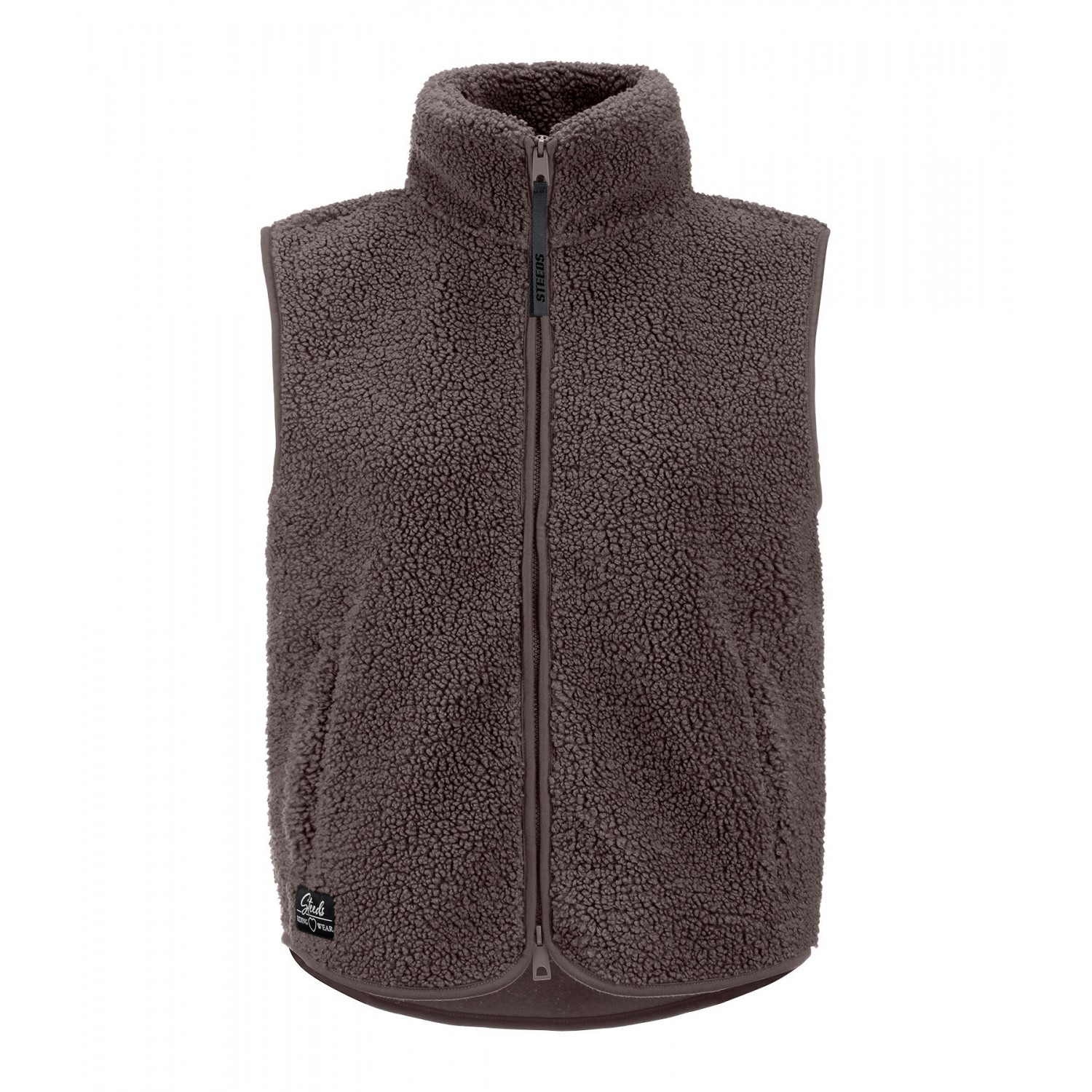 Уютный, мягкий, эластичный жилет из плюшевого флиса с воротником-стойкой. Удлиненная спина, двусторонняя молния на подкладке, 2 потайных кармана на молнии спереди и бирка STEEDS на подоле. 100% полиэстер.