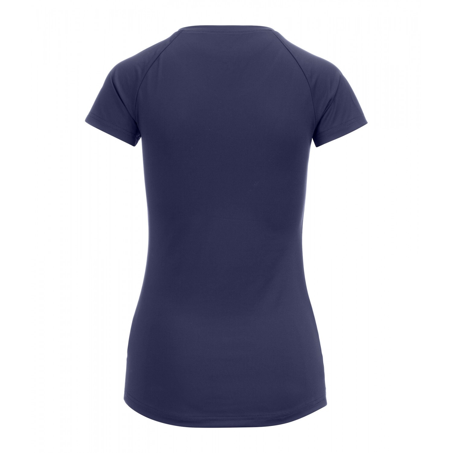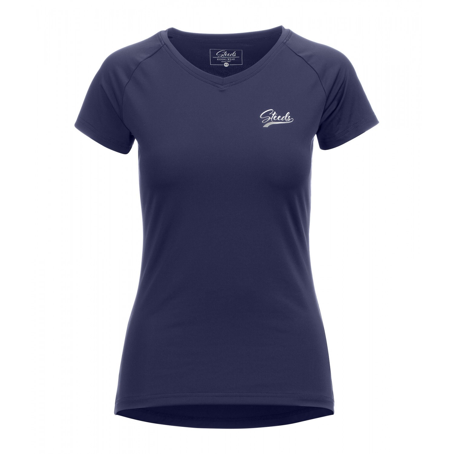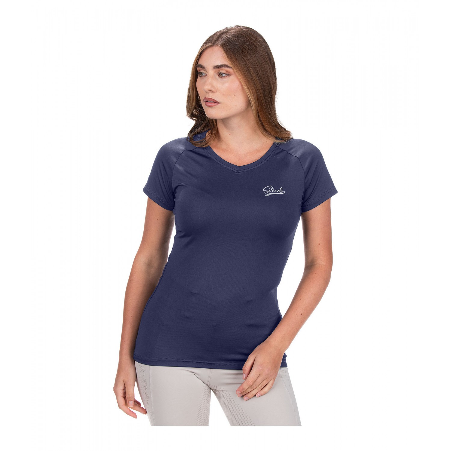Эластичная футболка для верховой езды с короткими рукавами, V-образным вырезом и мерцающим принтом на груди. Дышащий и быстросохнущий материал. 88% полиэстер, 12% эластан.