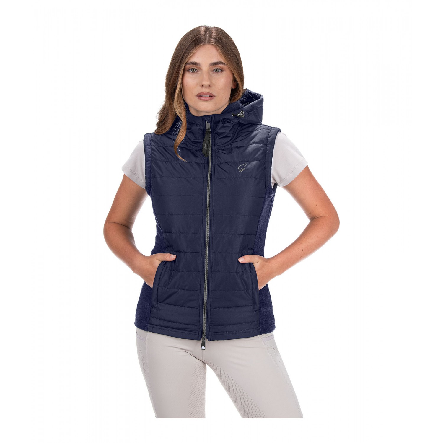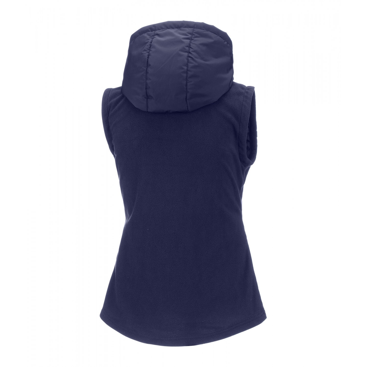 Прекрасное сочетание мягкого флиса и высококачественной микрофибры. Жилет со стеганой передней частью и флисовыми боковыми вставками. Регулируемый капюшон, который можно прикрепить сзади, подкладка, двусторонняя молния спереди с защитой подбородка, два передних кармана на молнии и блестящая вышивка на груди. 100% полиэстер.