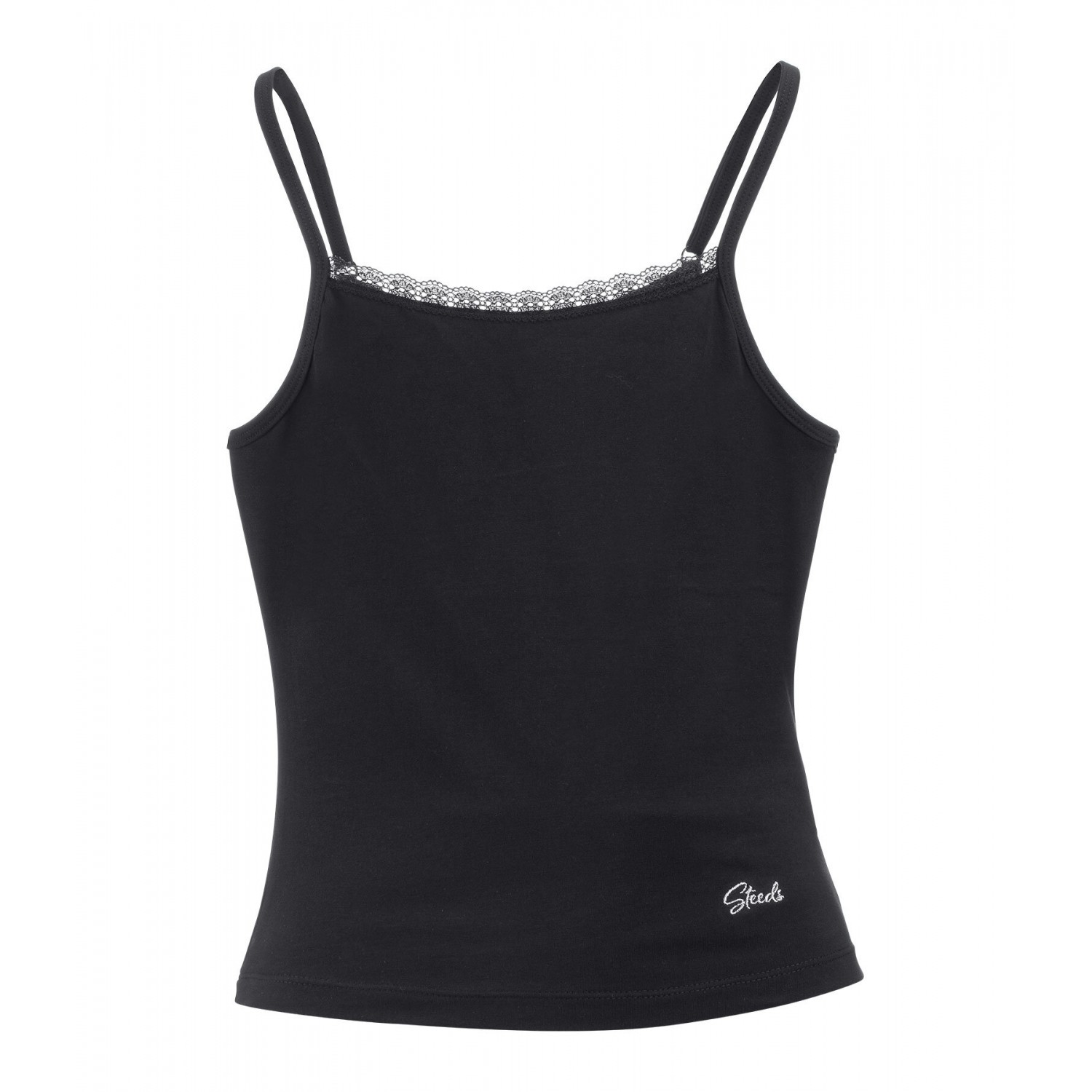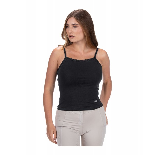 Укороченный топ на тонких бретельках с изящной кружевной отделкой. Изготовлен из мягкого, комфортного хлопкового трикотажа. Регулируемые бретельки и вышитый логотип спереди. 95% хлопок, 5% эластан.