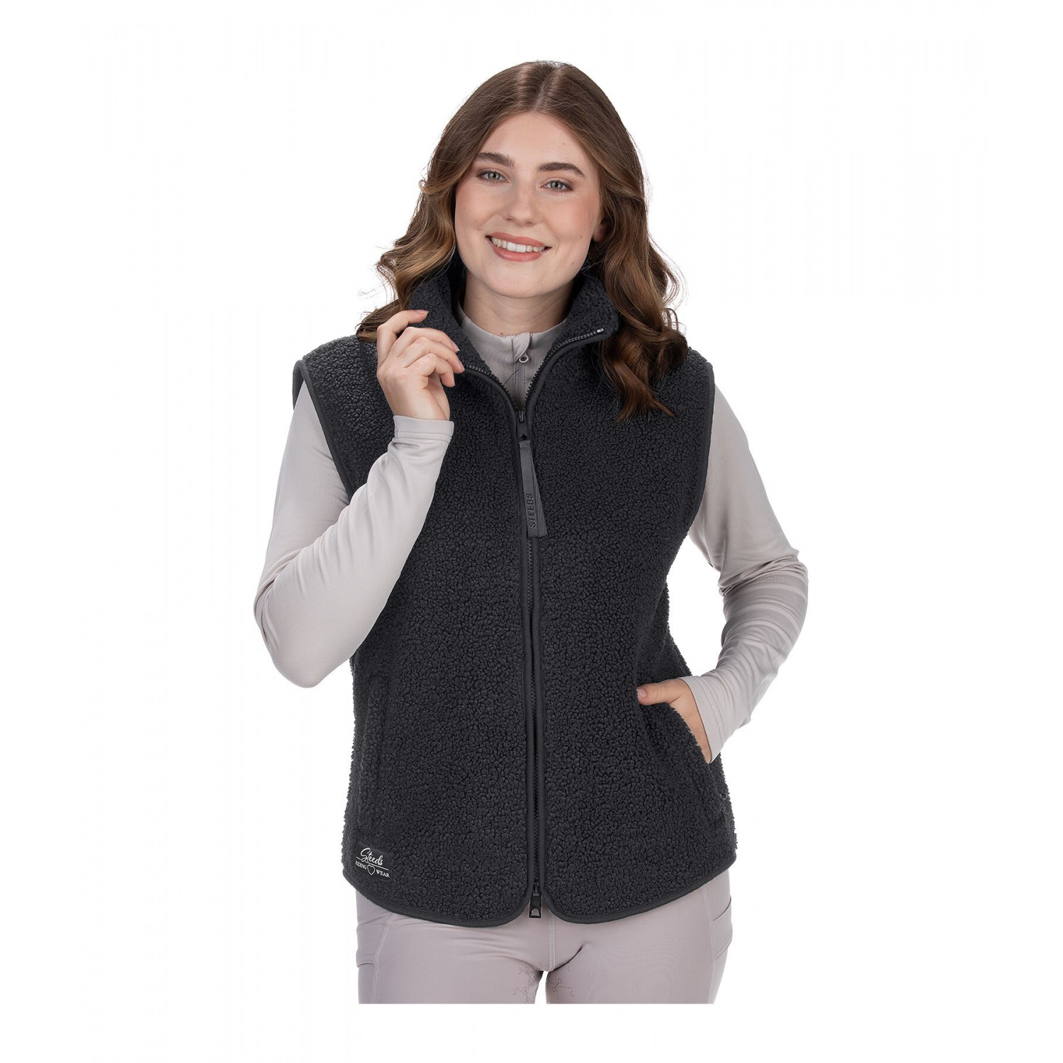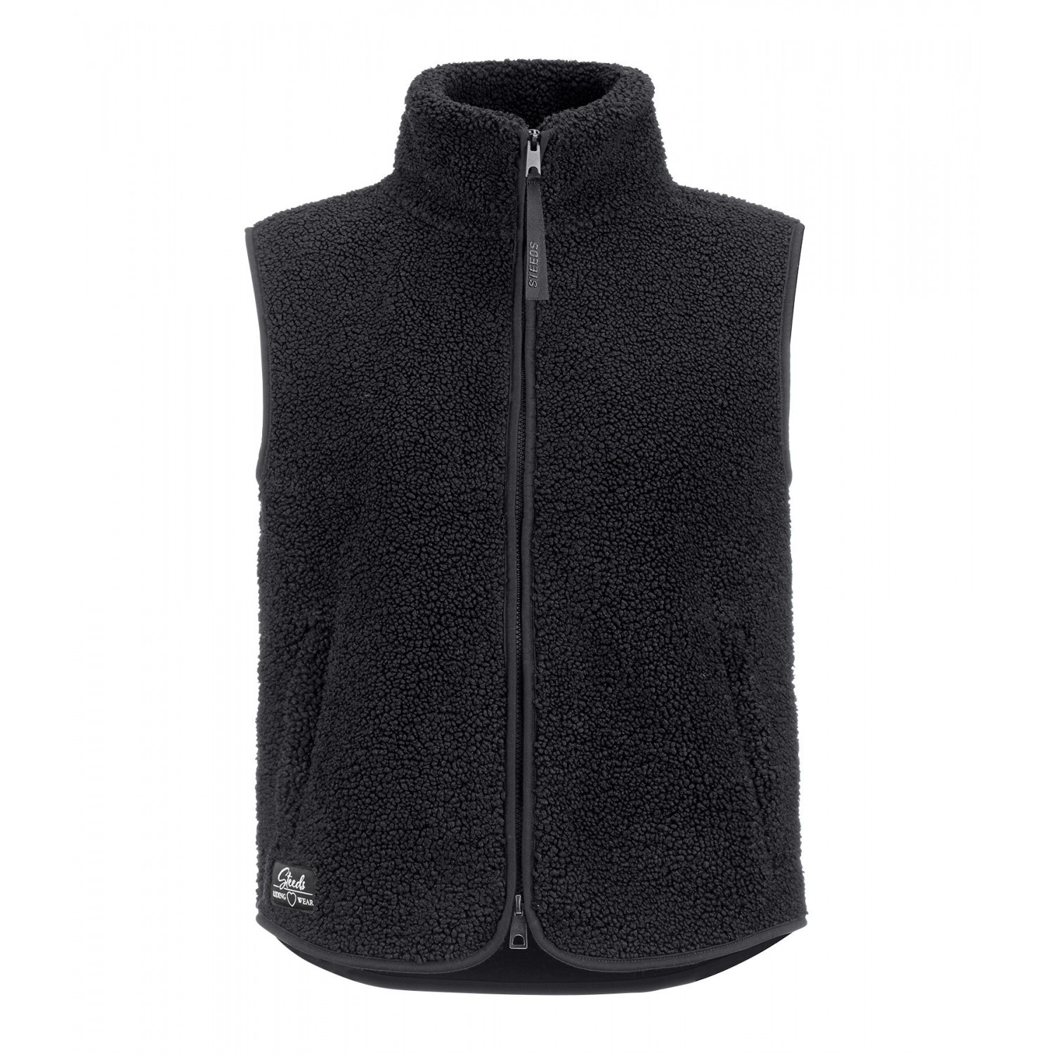 Уютный, мягкий, эластичный жилет из плюшевого флиса с воротником-стойкой. Удлиненная спина, двусторонняя молния на подкладке, 2 потайных кармана на молнии спереди и бирка STEEDS на подоле. 100% полиэстер.