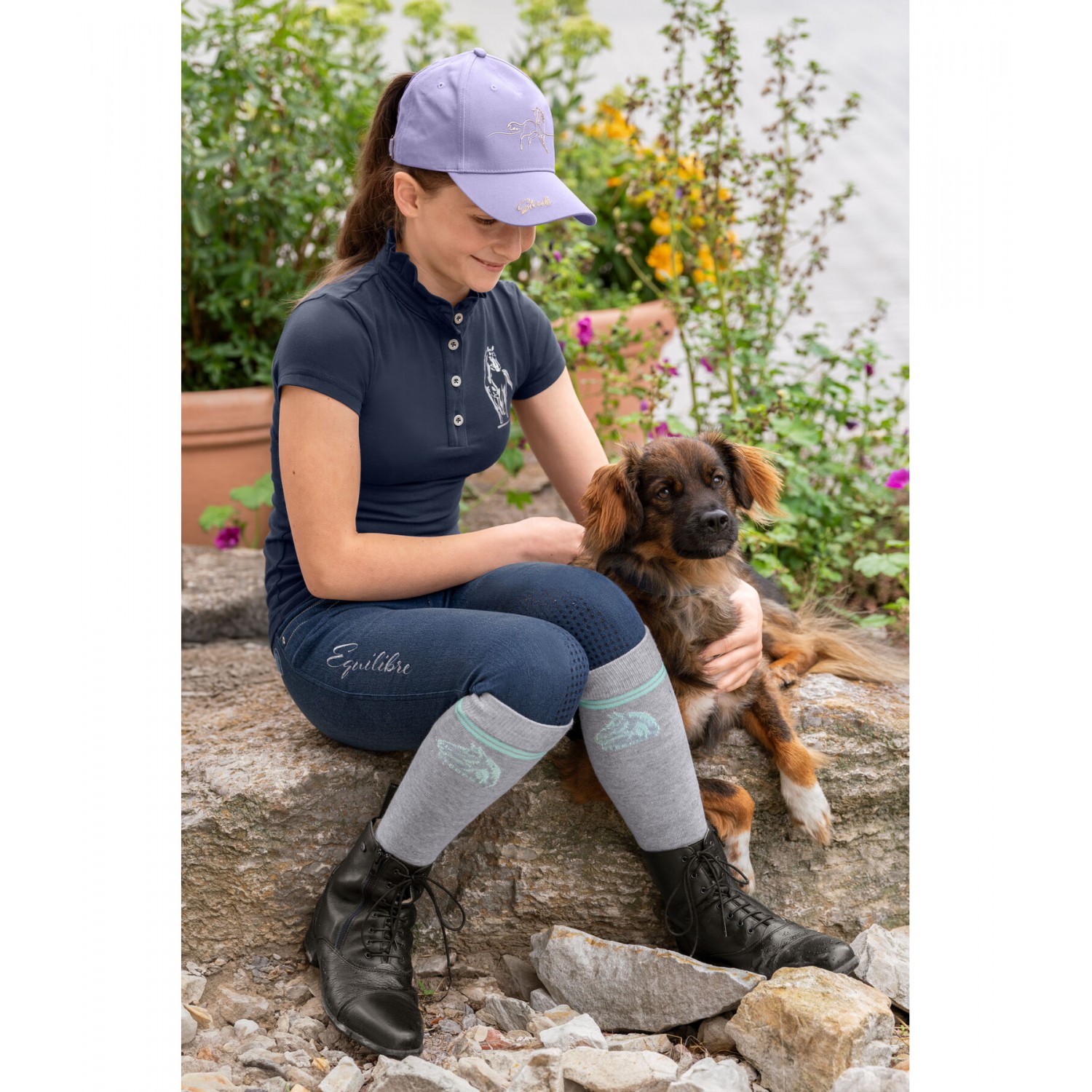 Модная детская рубашка-поло из мягкого эластичного хлопкового трикотажа. Большой воротник из джерси с рюшами, серебряные пуговицы, серебряный принт в виде лошади на груди и принт с логотипом под воротником сзади. 95% хлопок, 5% спандекс.