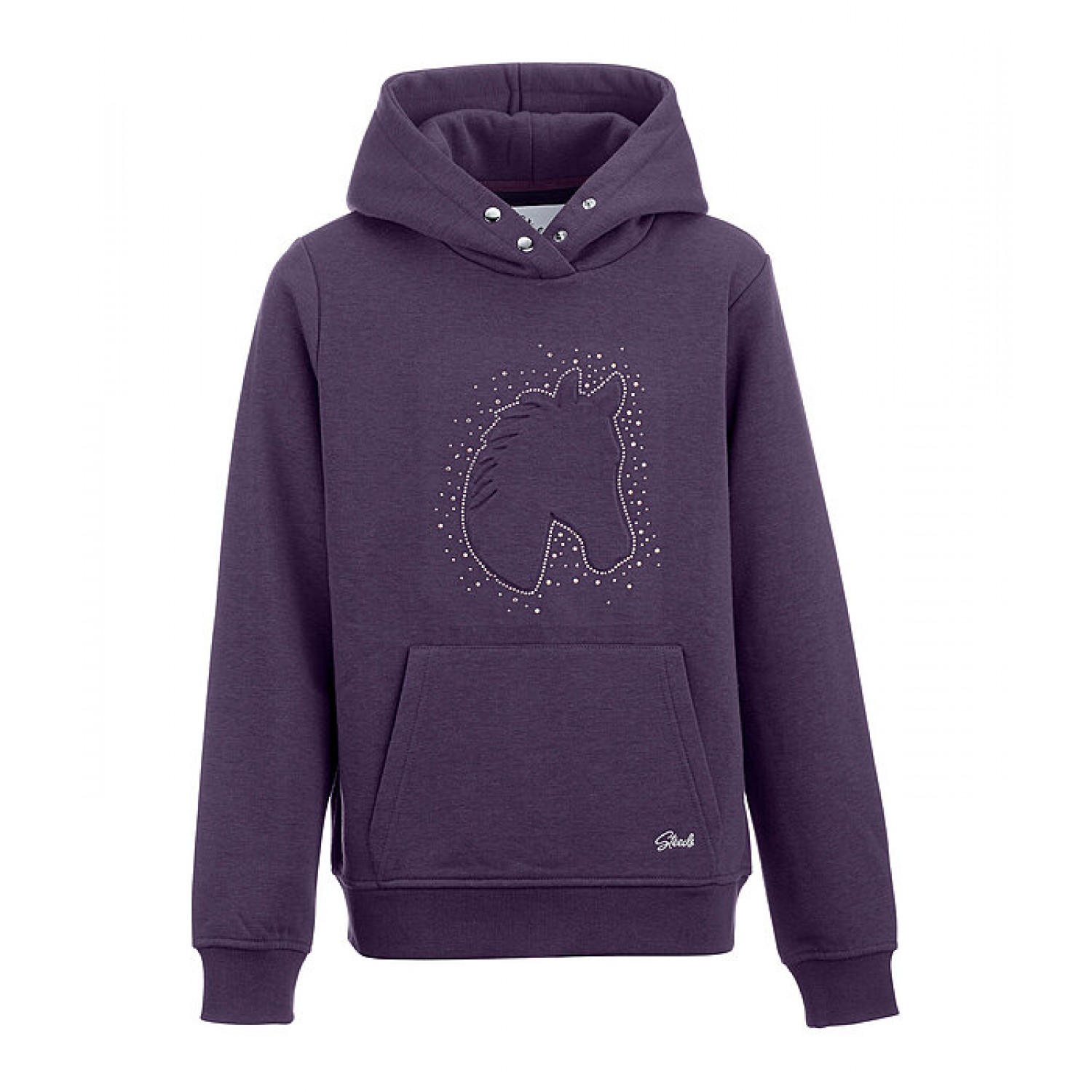 Очень красивая детская толстовка с великолепным рельефным изображением лошади и множеством блестящих камней, переливающихся цветами радуги спереди. С капюшоном, который закрывается на кнопки. Карман-кенгуру с изысканной вышивкой STEEDS, манжеты и пояс из тонкого трикотажного материала. 65% полиэстер, 35% хлопок.