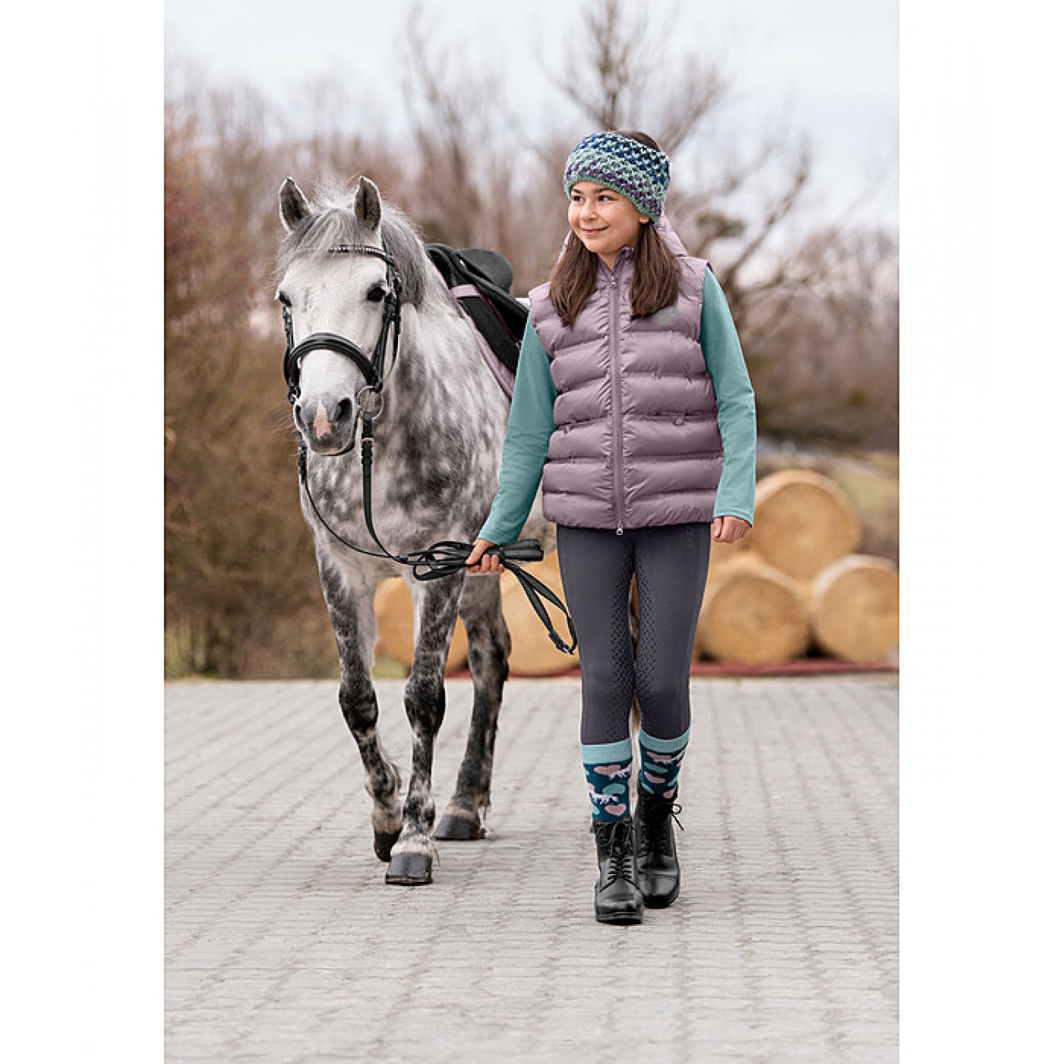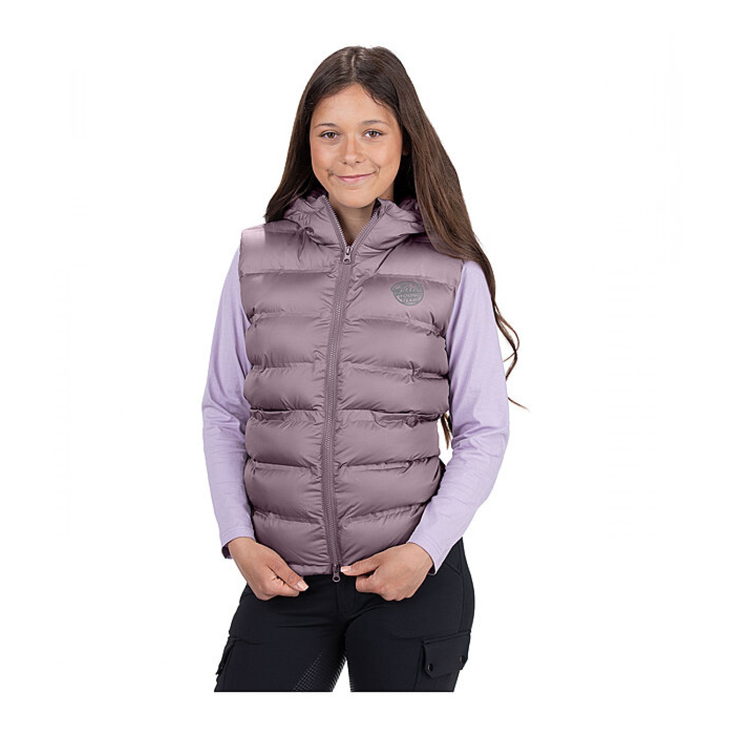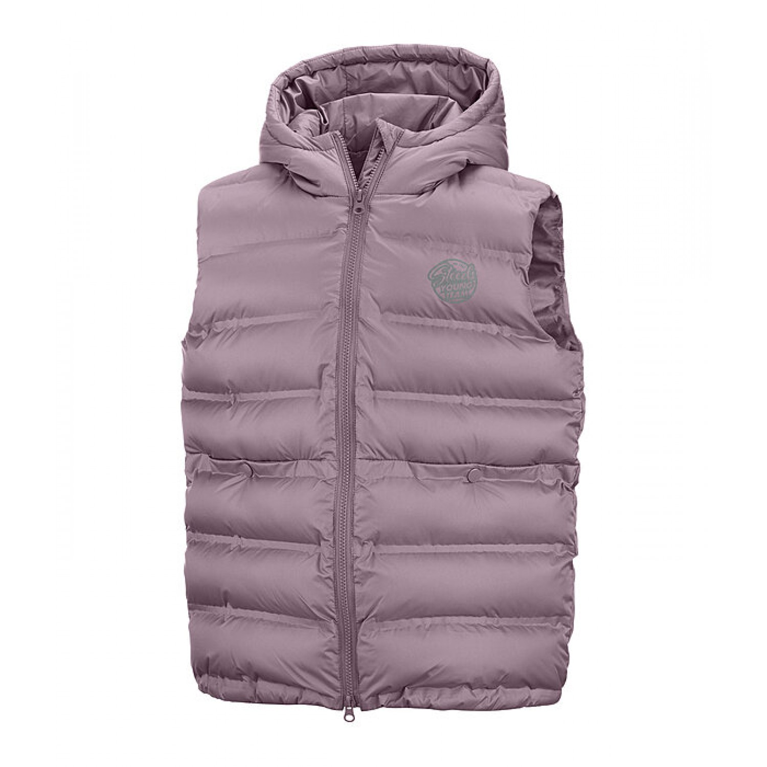 Спортивный детский стеганый жилет с высоким воротником и капюшоном. Двусторонняя молния контрастного цвета с подкладкой спереди с защитой подбородка, 2 прорезных кармана на кнопках спереди, эластичный низ и светоотражающий принт STEEDS на груди. 100% полиэстер.