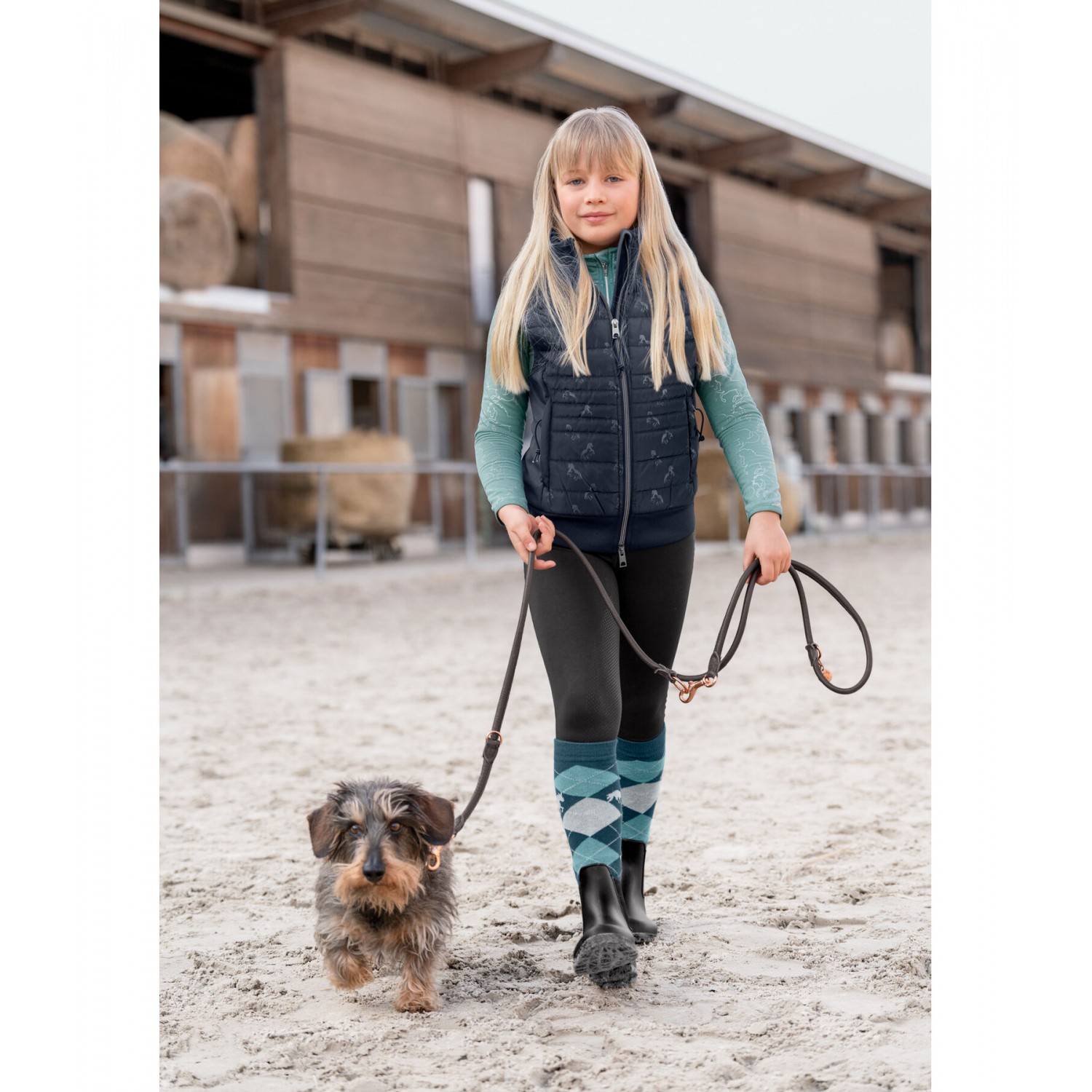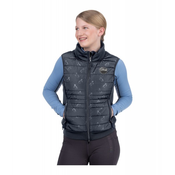 Функциональный детский жилет из софтшелла с теплыми стегаными вставками спереди и воротником-стойкой. Устойчивый к воде и ветру. Красивый блестящий принт с лошадьми на стеганой вставке спереди. Двусторонняя молния на подкладке спереди с защитой подбородка, 2 потайных кармана на молнии спереди и трикотажные манжеты по низу. Значок STEEDS на груди и вышивка на спине. 100% полиэстер.