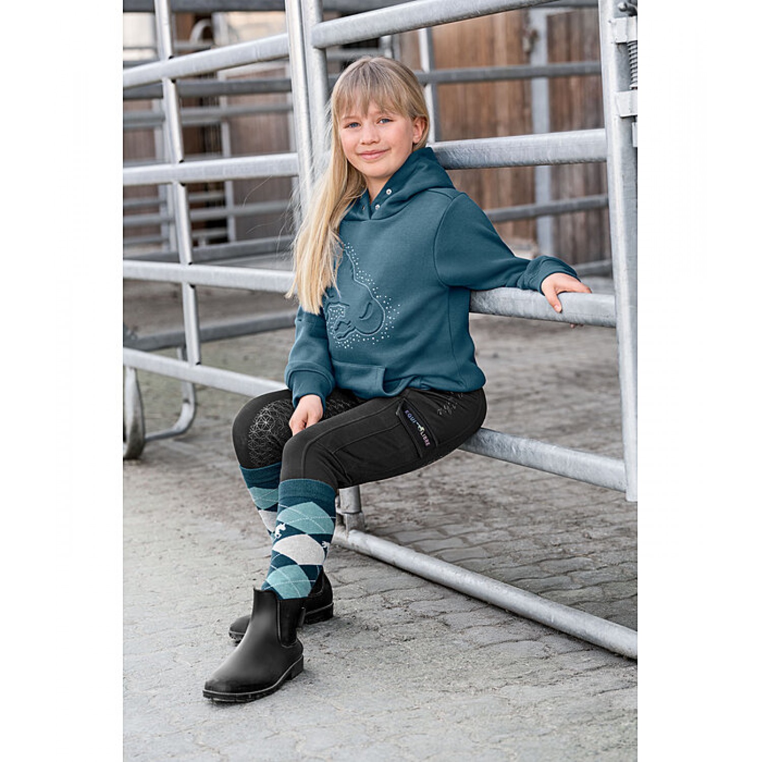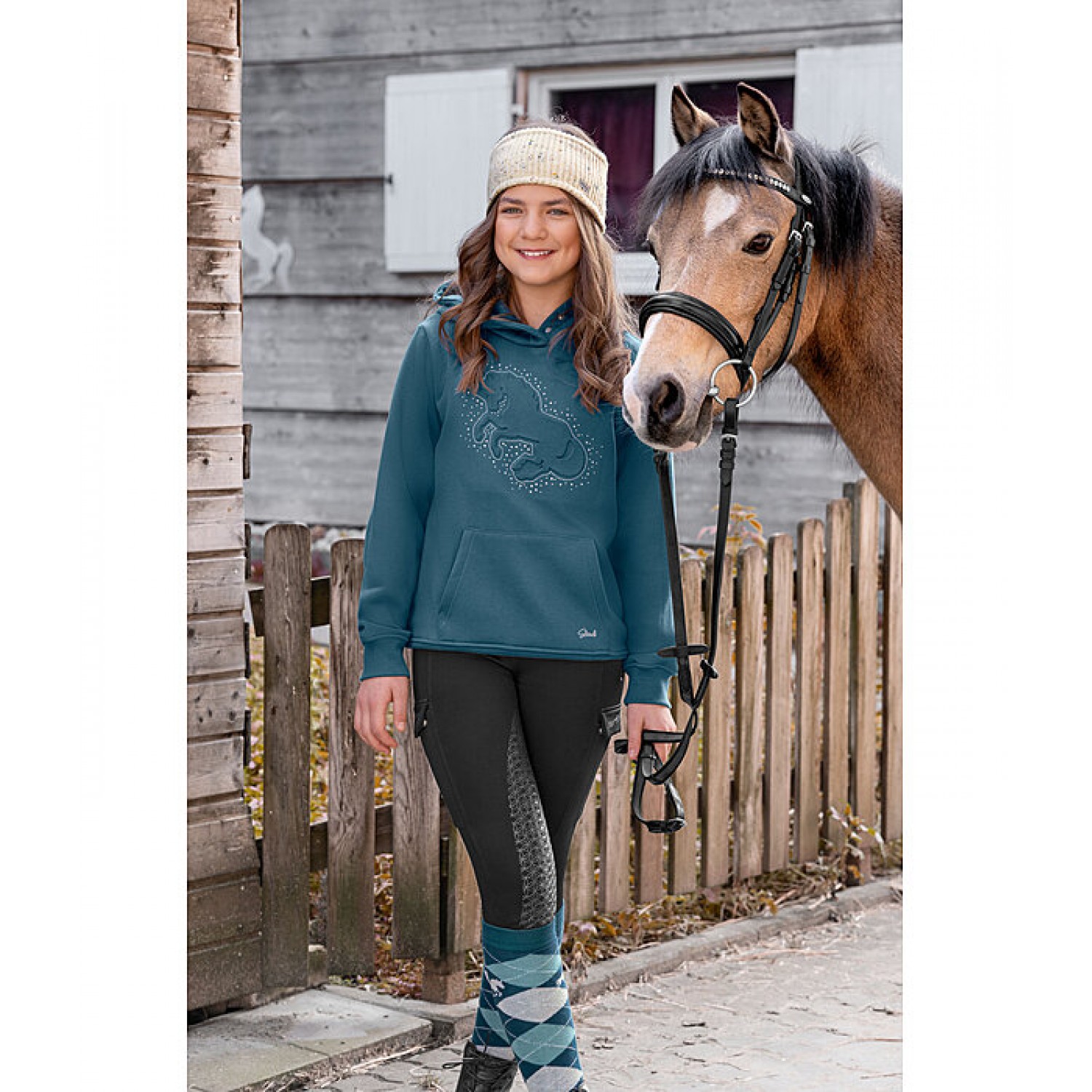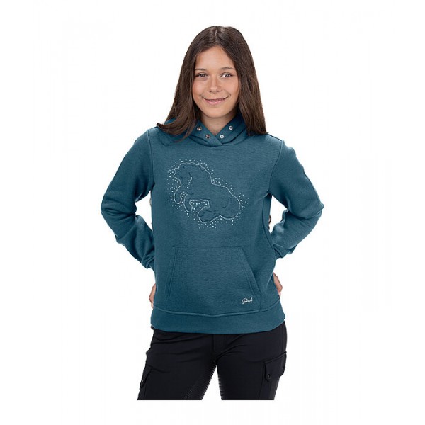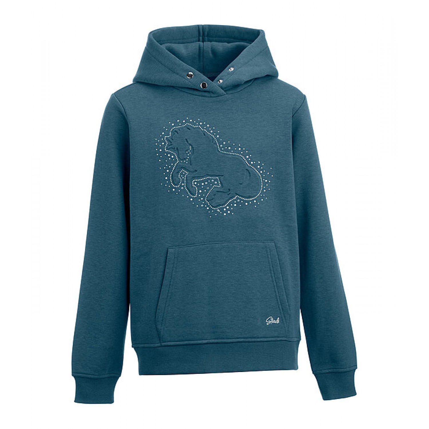 Очень красивая детская толстовка с великолепным рельефным изображением лошади и множеством блестящих камней, переливающихся цветами радуги спереди. С капюшоном, который закрывается на кнопки. Карман-кенгуру с изысканной вышивкой STEEDS, манжеты и пояс из тонкого трикотажного материала. 65% полиэстер, 35% хлопок.