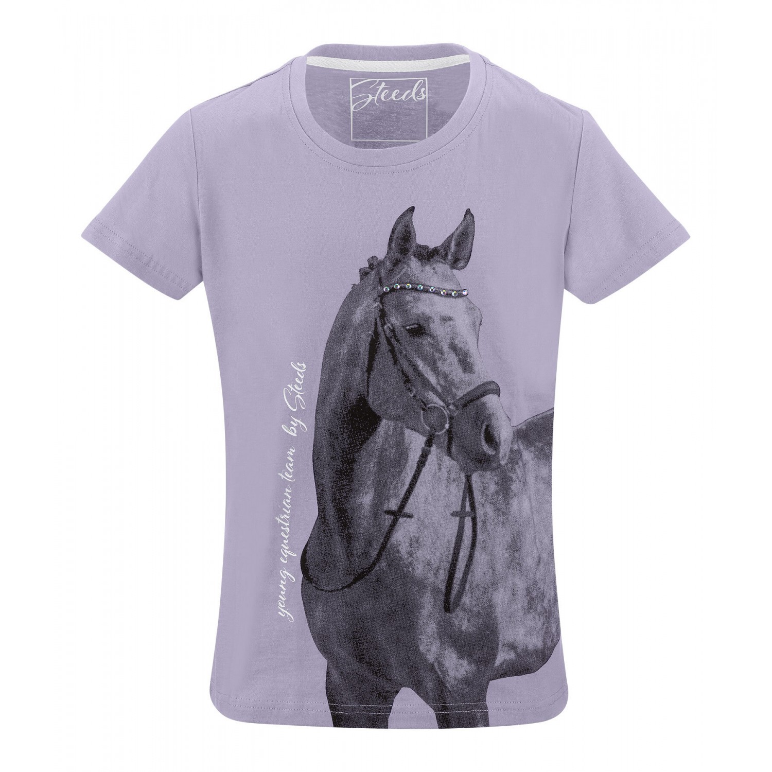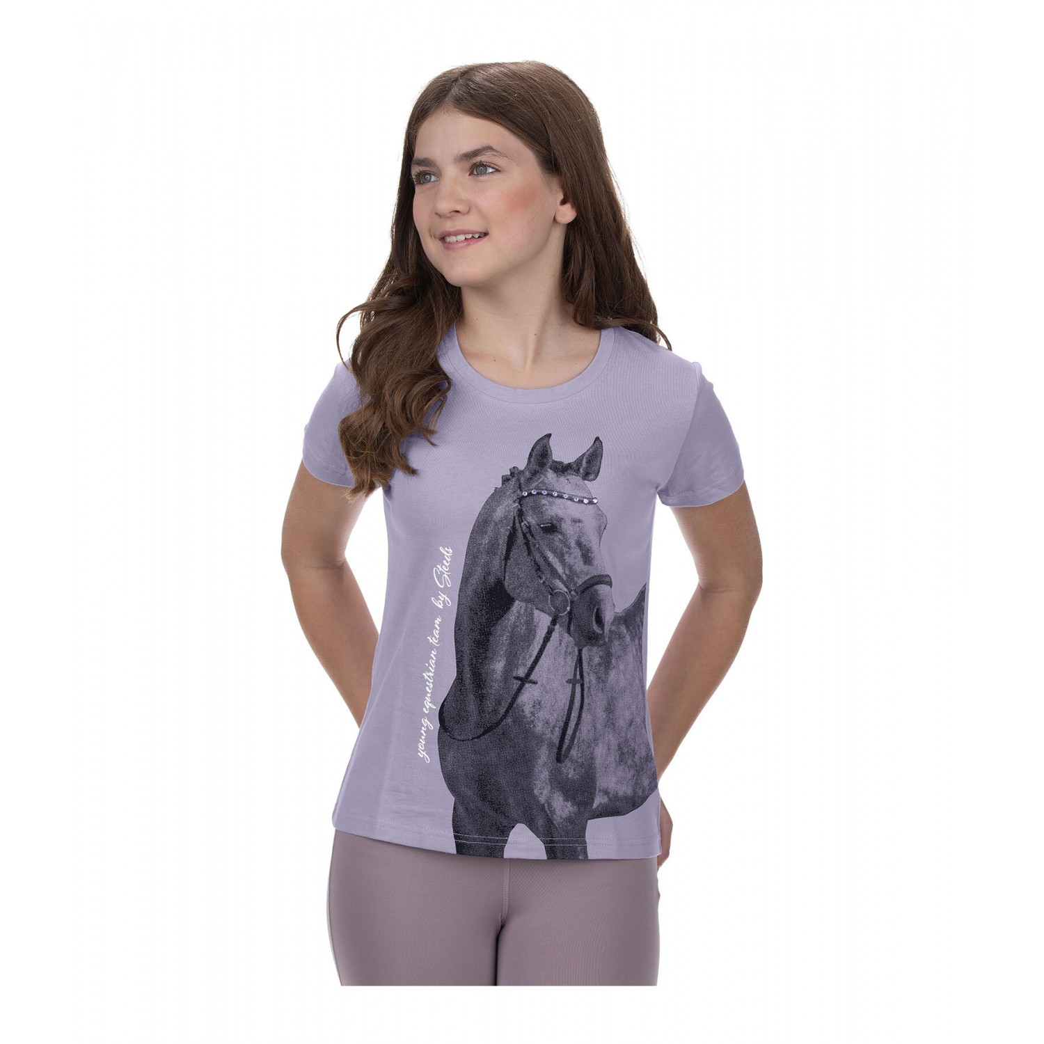 Стильная, мягкая детская футболка с большим изображением лошади на передней части, украшенная сверкающими стразами. Круглый вырез, короткие рукава и небольшой логотип. 100% хлопок.