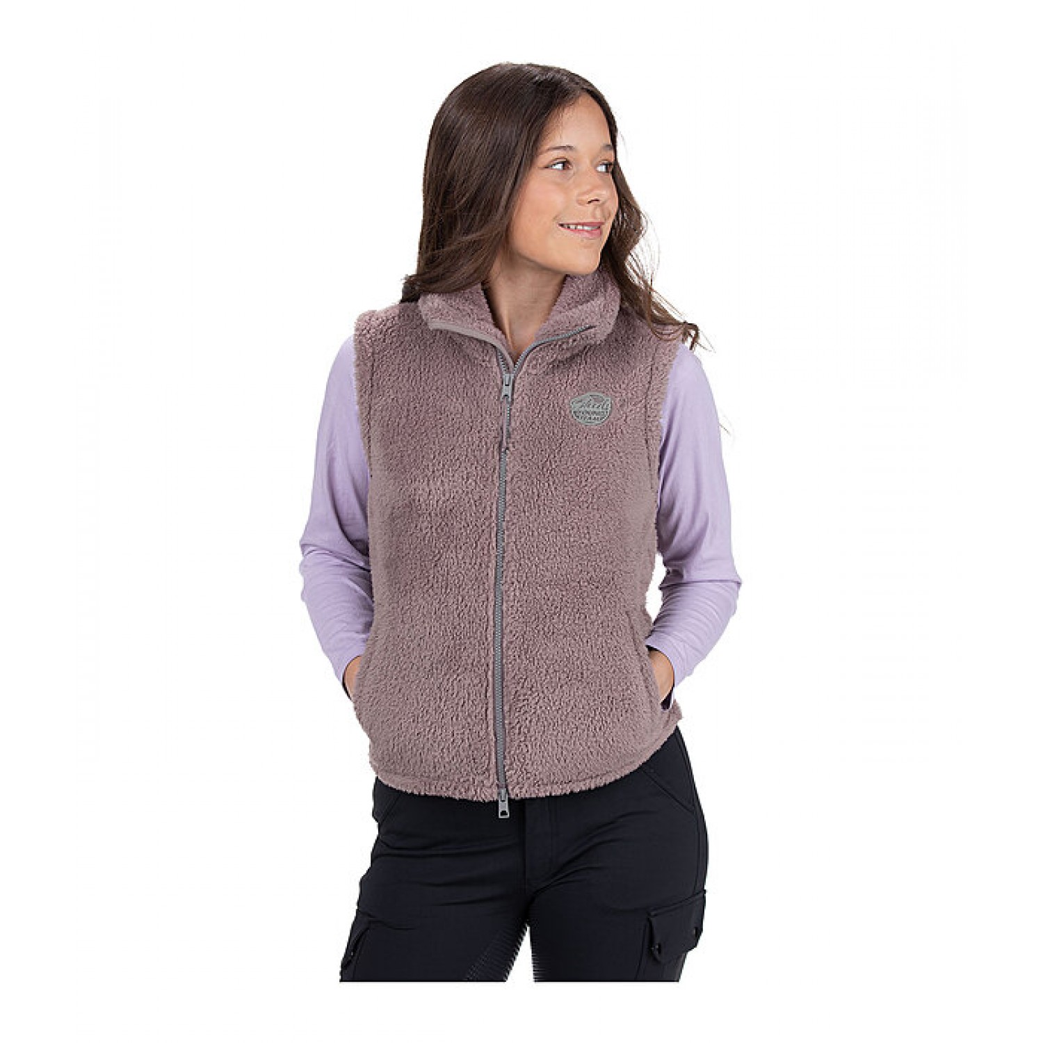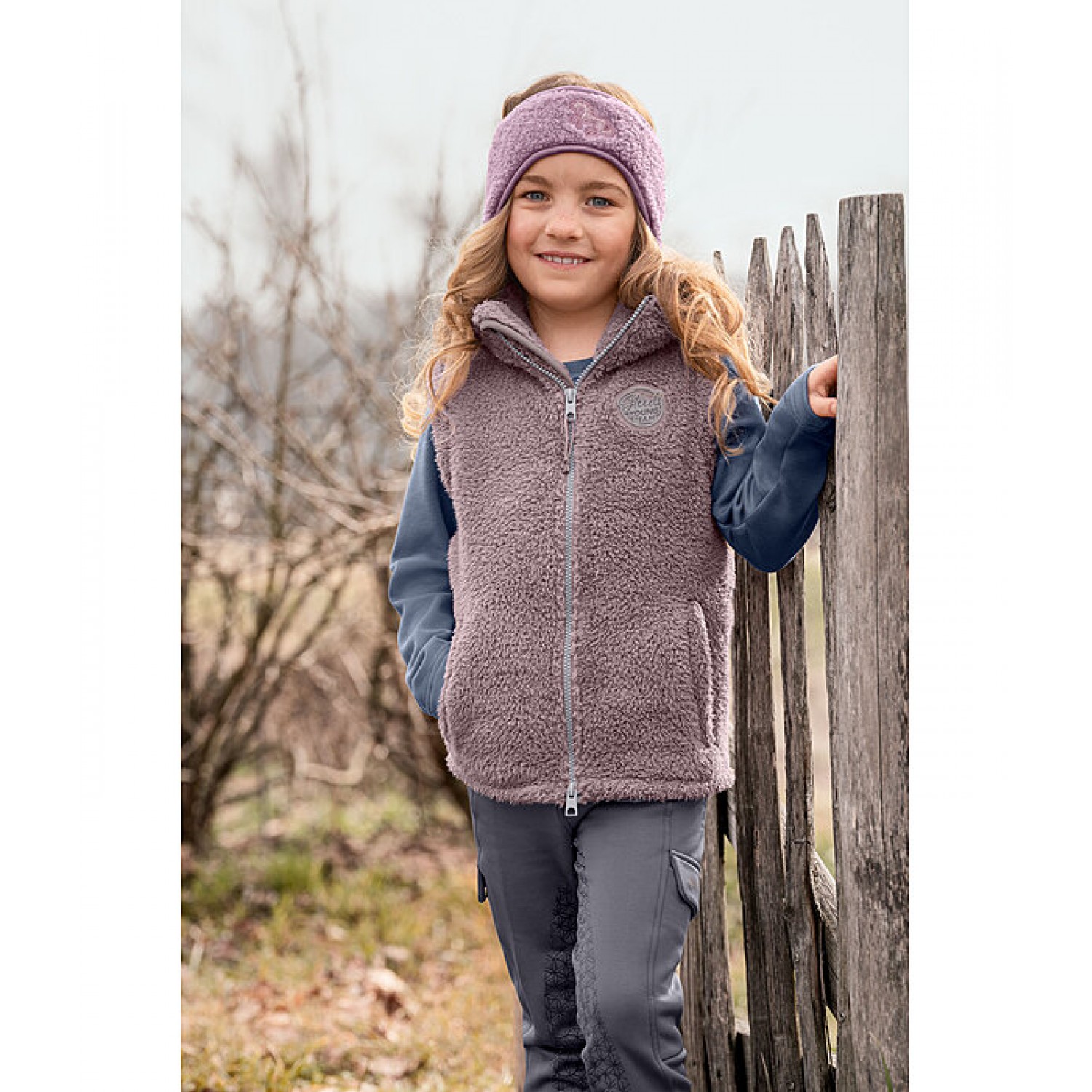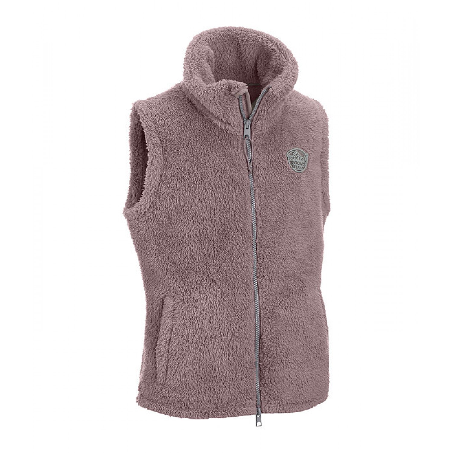 Уютный флисовый жилет для детей с высоким воротником. Двусторонняя молния под подкладкой спереди с защитой подбородка, 2 потайных прорезных кармана и значок STEEDS на груди. 100% полиэстер.