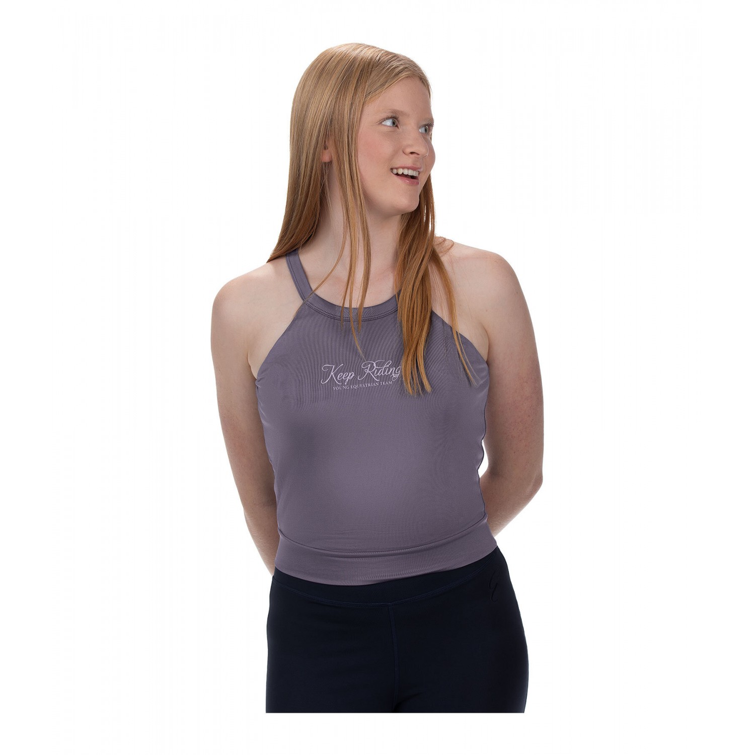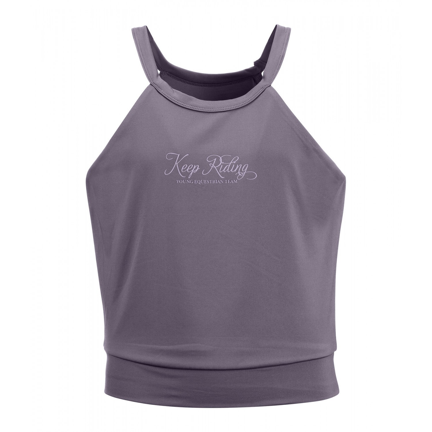Стильный укороченный топ для детей из дышащего и быстросохнущего функционального материала. С принтами спереди и сзади. 88% полиэстер, 12% эластан.