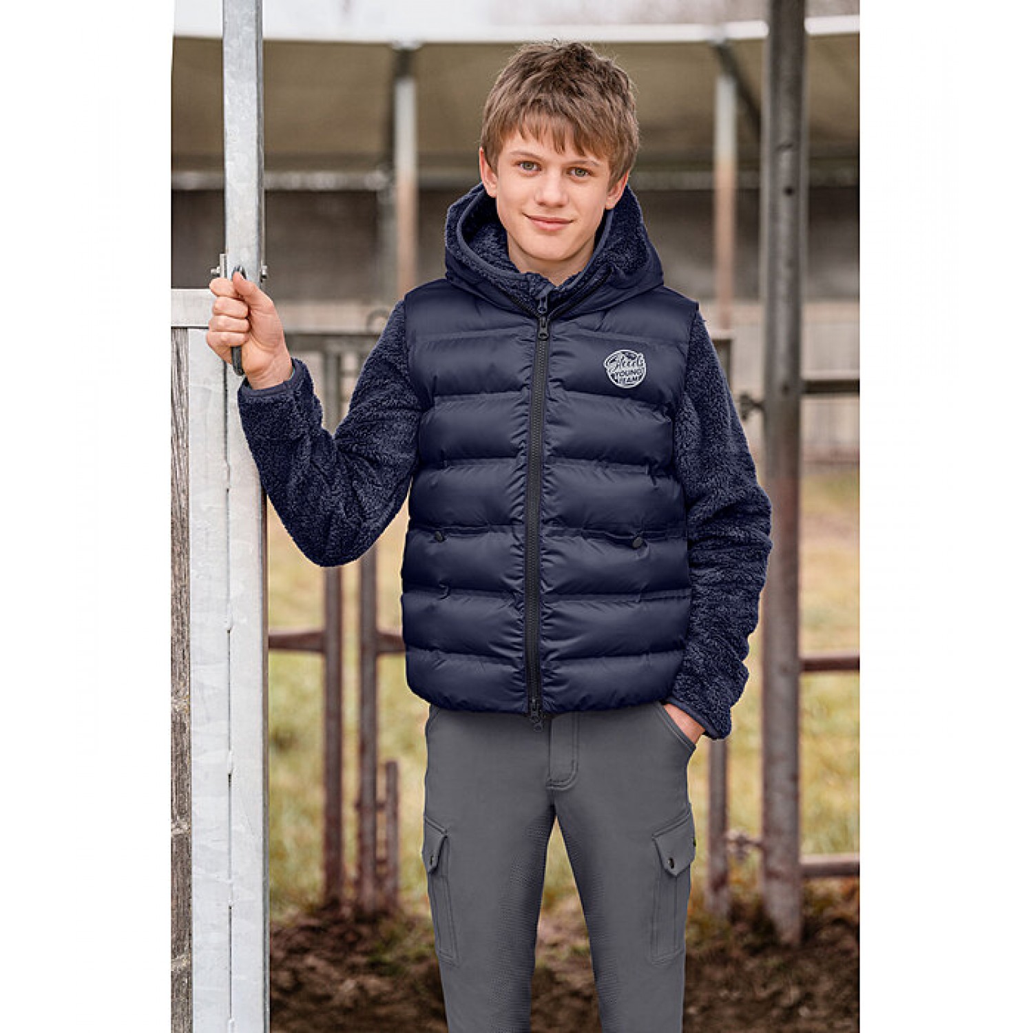 Спортивный детский стеганый жилет с высоким воротником и капюшоном. Двусторонняя молния контрастного цвета с подкладкой спереди с защитой подбородка, 2 прорезных кармана на кнопках спереди, эластичный низ и светоотражающий принт STEEDS на груди. 100% полиэстер.