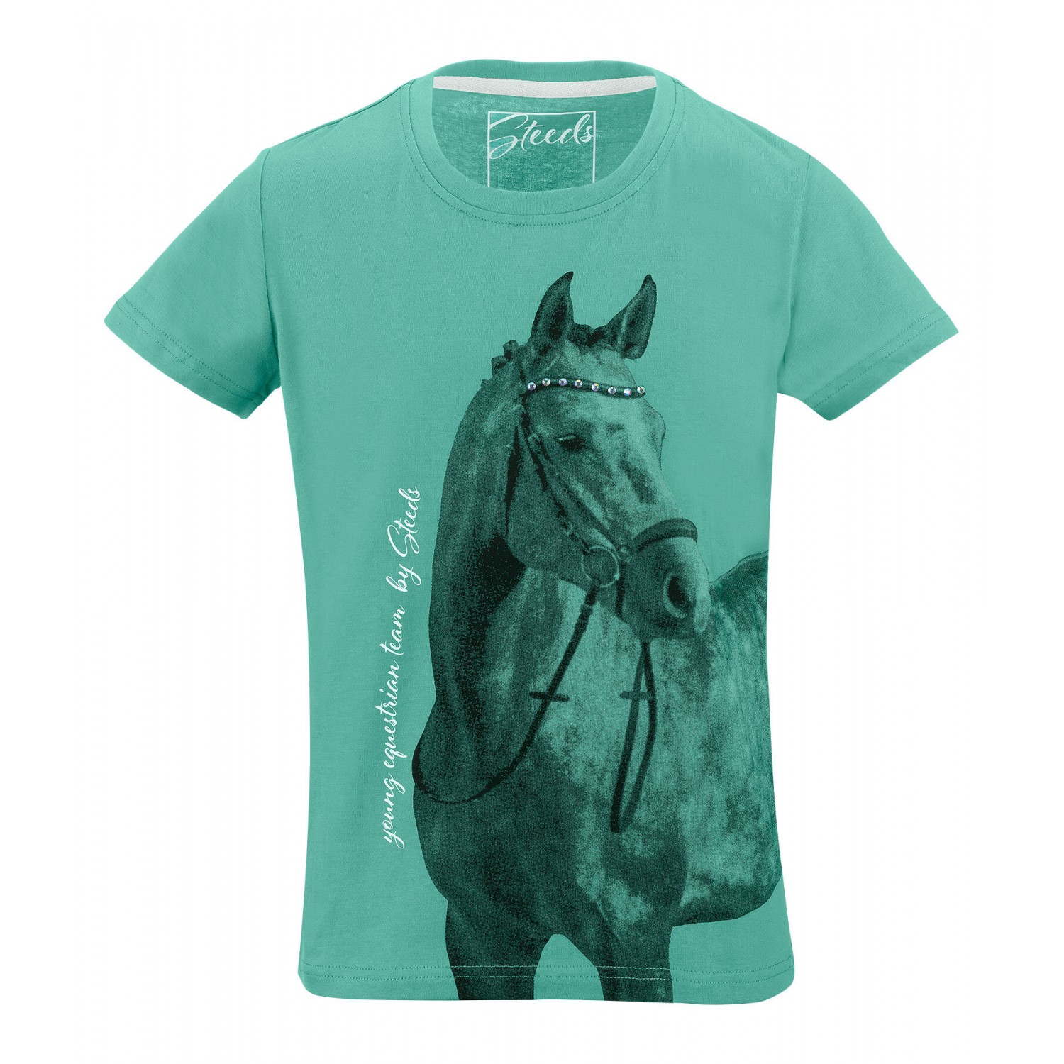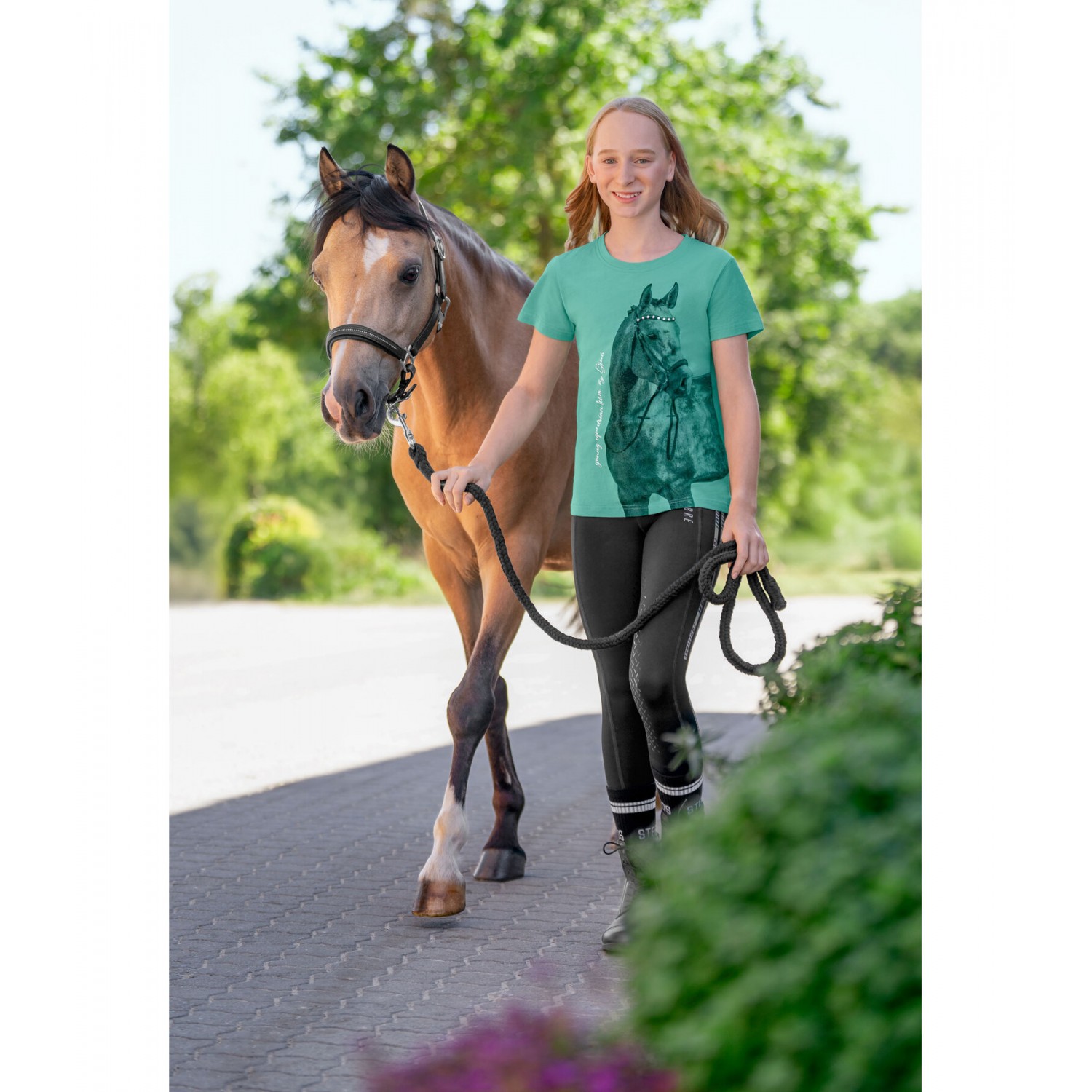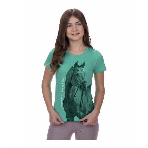 Стильная, мягкая детская футболка с большим изображением лошади на передней части, украшенная сверкающими стразами. Круглый вырез, короткие рукава и небольшой логотип. 100% хлопок.