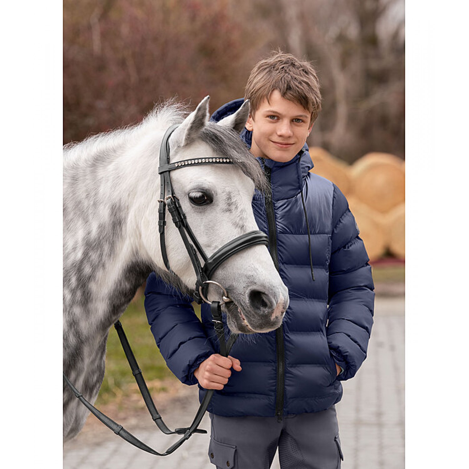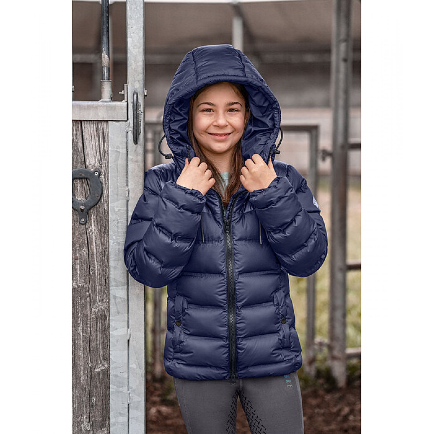 Спортивная стеганая куртка для детей с высоким воротником и регулируемым капюшоном, который можно прикрепить к спине на кнопке. Двусторонняя молния контрастного цвета с подкладкой спереди с защитой подбородка, 2 прорезных кармана на кнопках спереди, эластичный низ и манжеты рукавов, а также светоотражающий принт STEEDS на руке. Куртка выполнена из мерцающего материала сверху и матового снизу. 100% полиэстер.