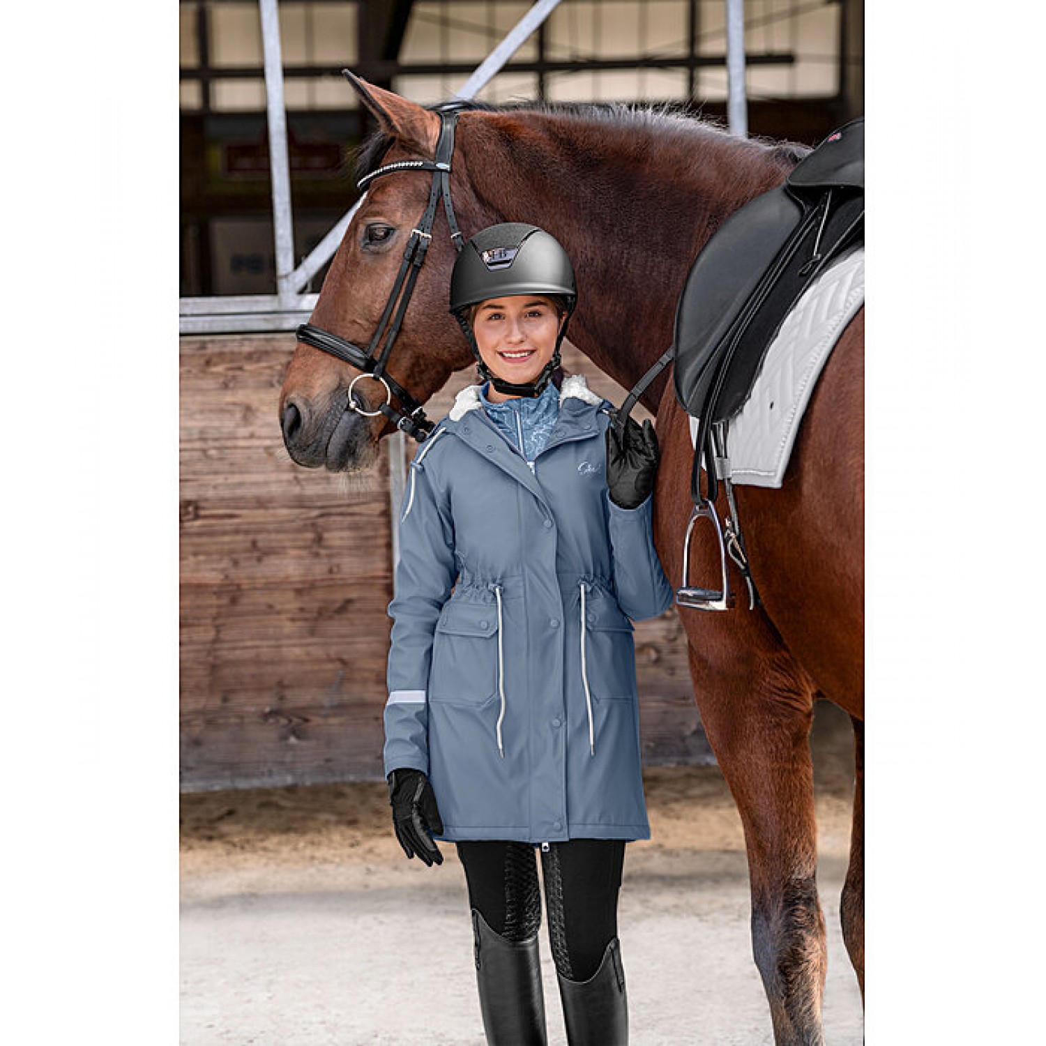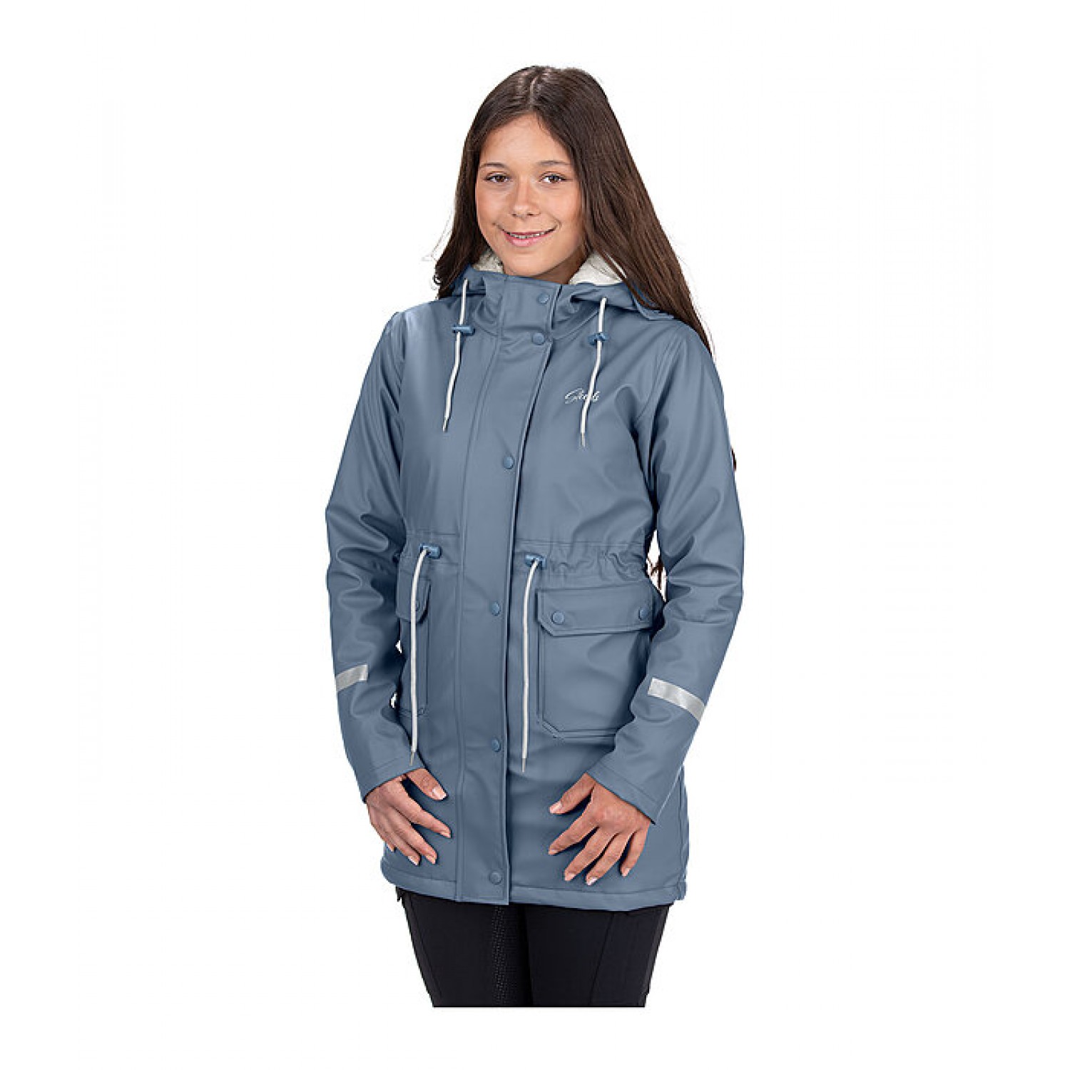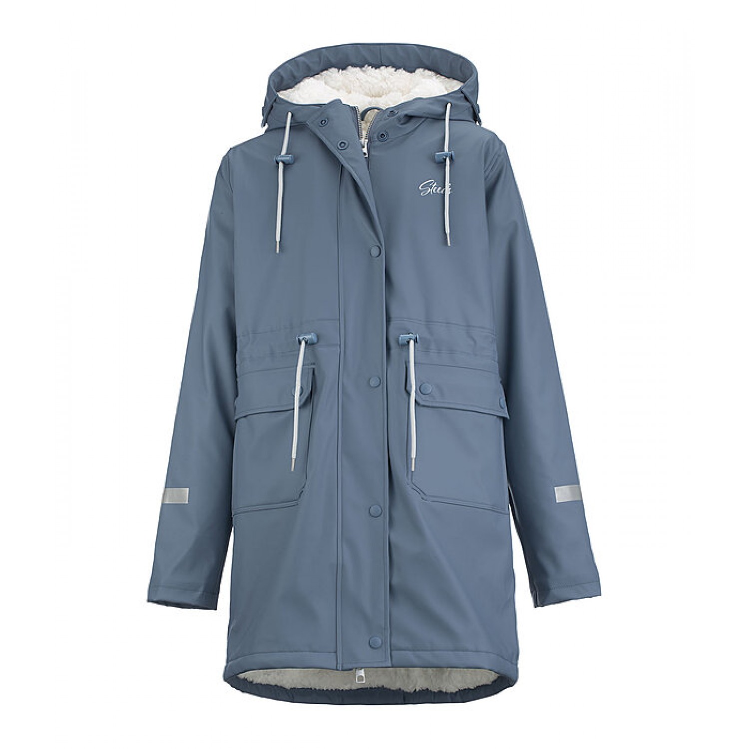 Мягкая и тёплая детская зимняя куртка-дождевик с подкладкой из плюшевого флиса. Большой регулируемый капюшон, который можно удлинить в сильный дождь. Водонепроницаемая и ветрозащитная. Потайная двусторонняя молния спереди, два кармана с клапанами на кнопках спереди, регулируемая талия, шлица для верховой езды на кнопках сзади и светоотражающий принт на рукаве. На рукаве и капюшоне изображены принты STEEDS. 100% полиуретан, подкладка из плюшевого флиса, 100% полиэстер.