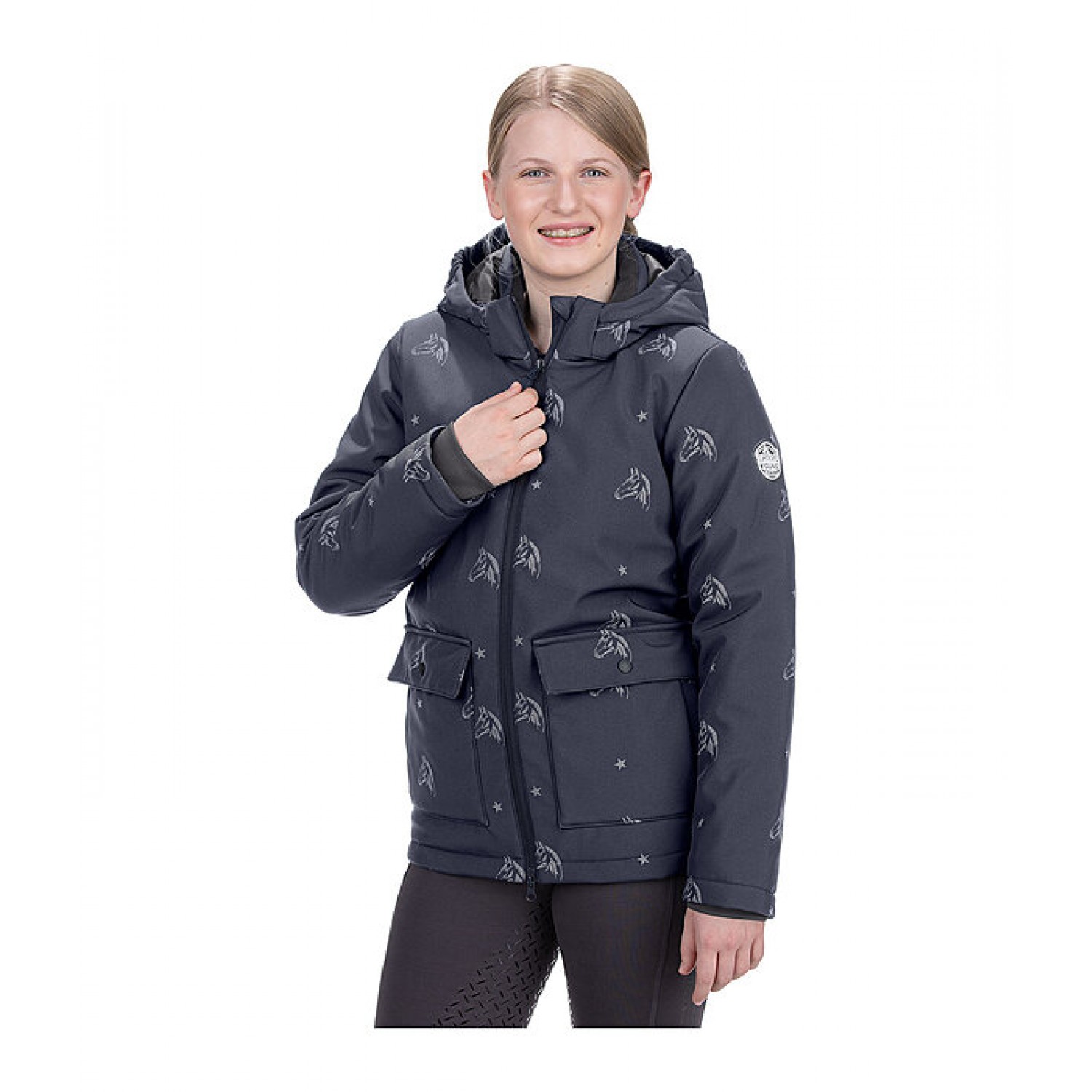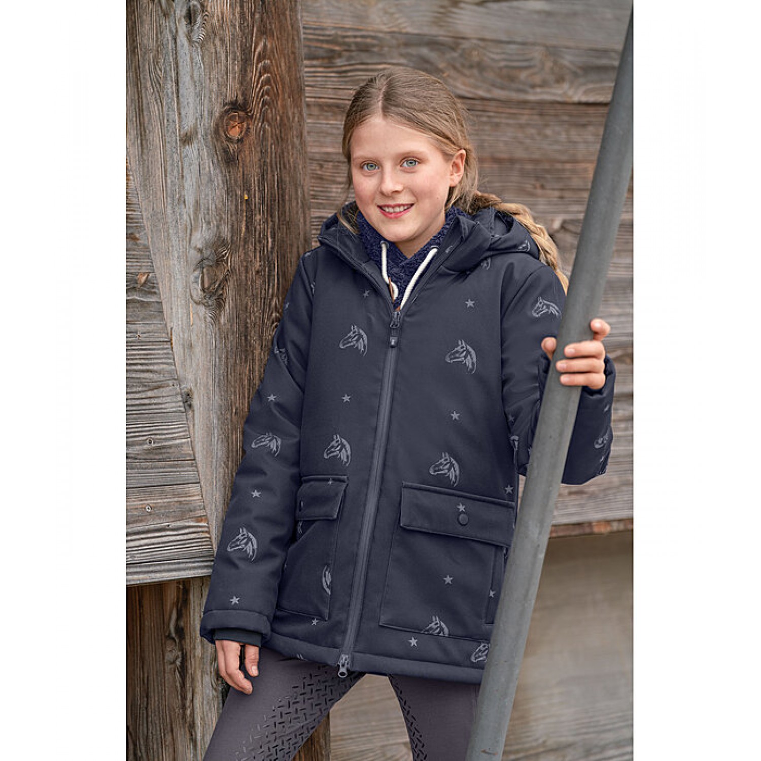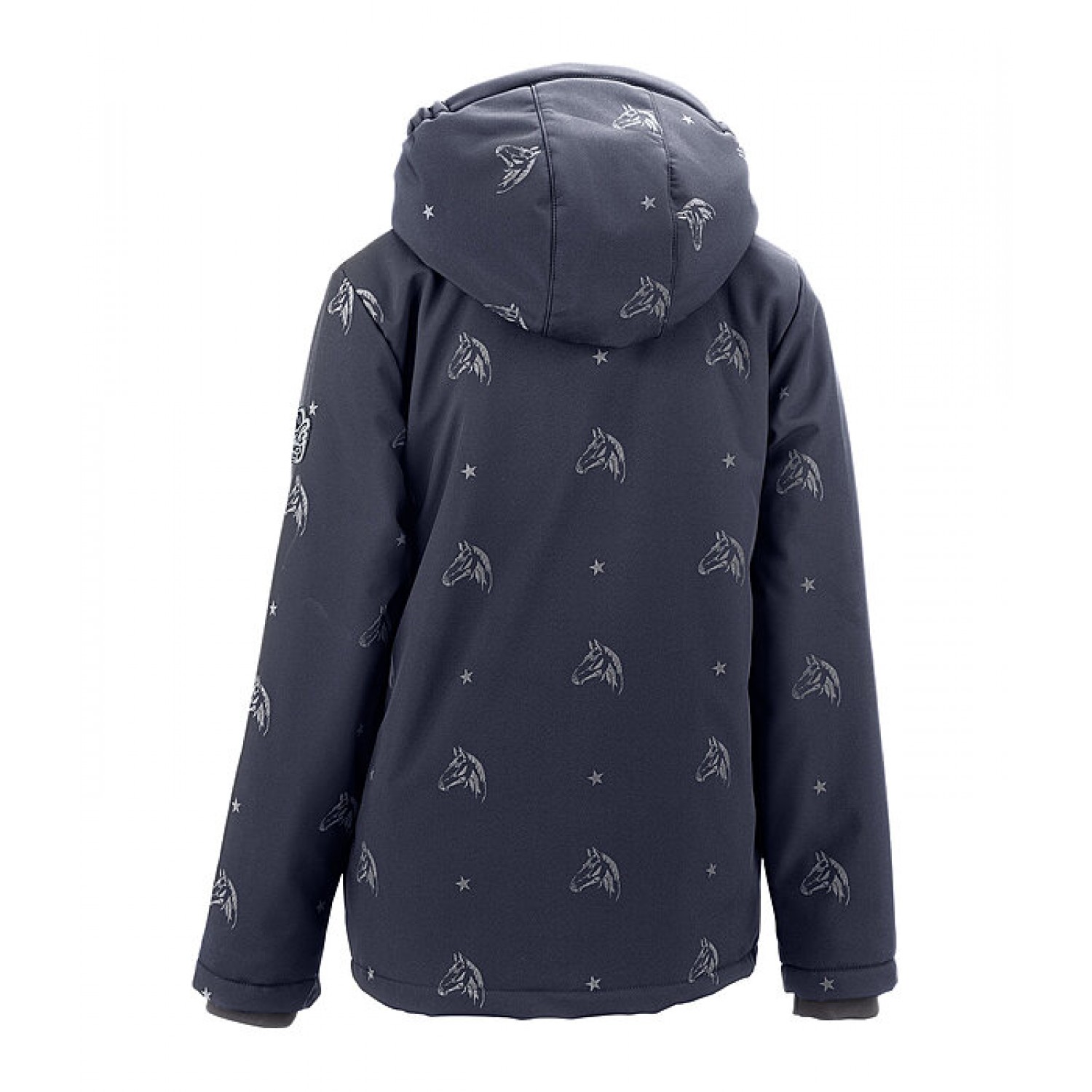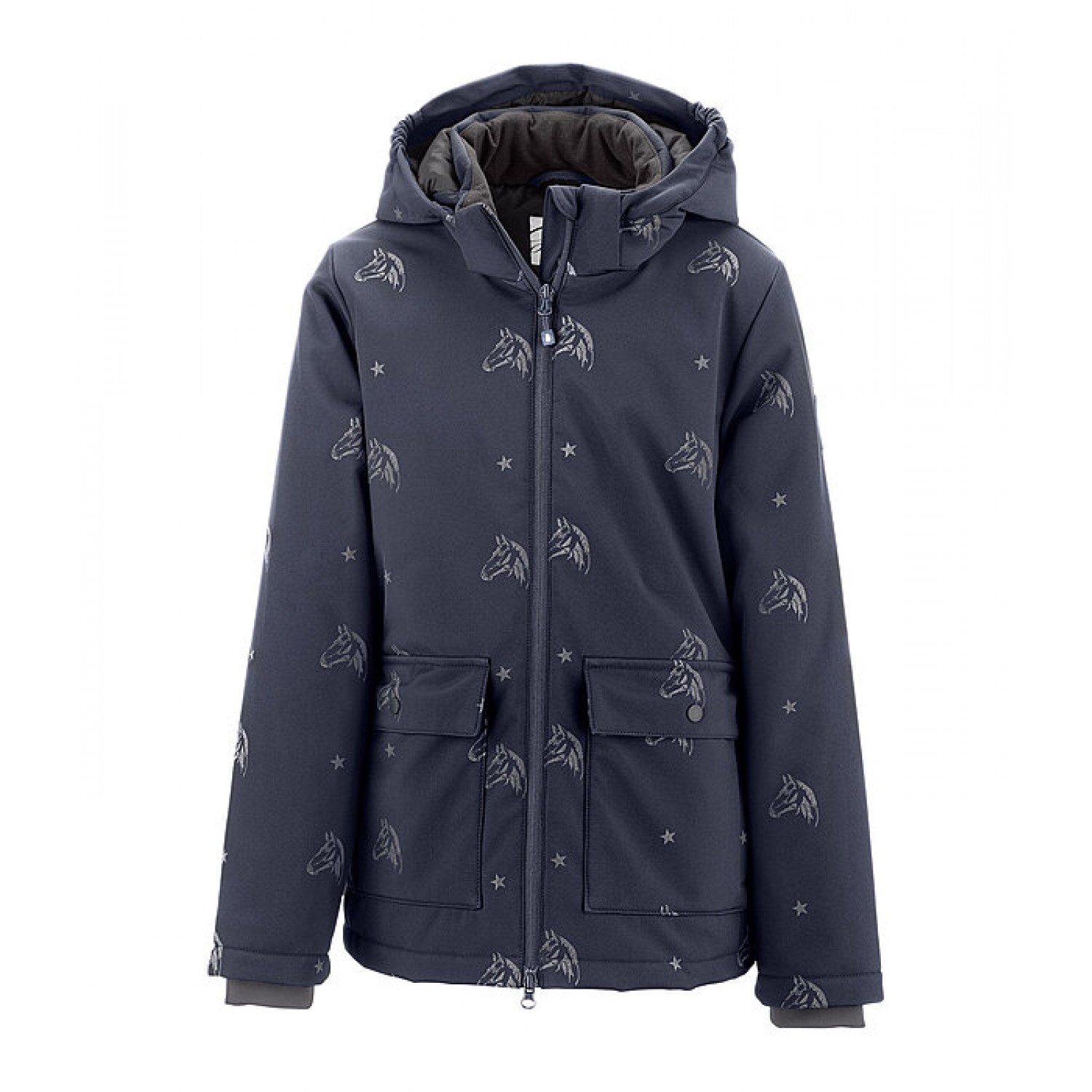 Теплая детская куртка из софтшелла со светоотражающим принтом в виде лошадей, точек и логотипа по всей поверхности. Водоотталкивающая, ветронепроницаемая и дышащая. Высокий воротник с капюшоном, застегивающимся на кнопку сзади, двусторонняя молния на подкладке с защитой подбородка спереди, два кармана с клапанами на кнопках и встроенные боковые карманы спереди. Эластичные манжеты с ветрозащитой и эмблема STEEDS на рукаве. Состав: 94% полиэстер, 6% эластан.