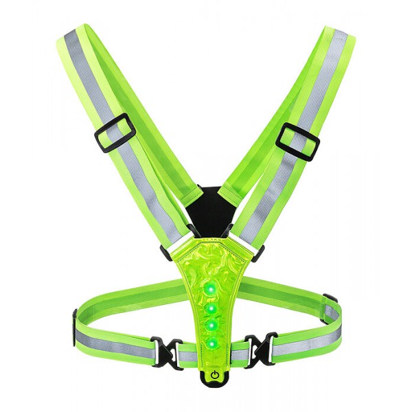 Устройство на всадника для верховой езды с четырьмя светодиодными фонарями спереди и сзади, каждый из которых управляется отдельно и имеет следующие режимы: быстрое мигание, медленное мигание и постоянный свет. В комплект входят два USB-кабеля для зарядки встроенных литий-ионных аккумуляторов. Регулируется по длине и ширине и имеет яркий цвет со светоотражающим принтом.