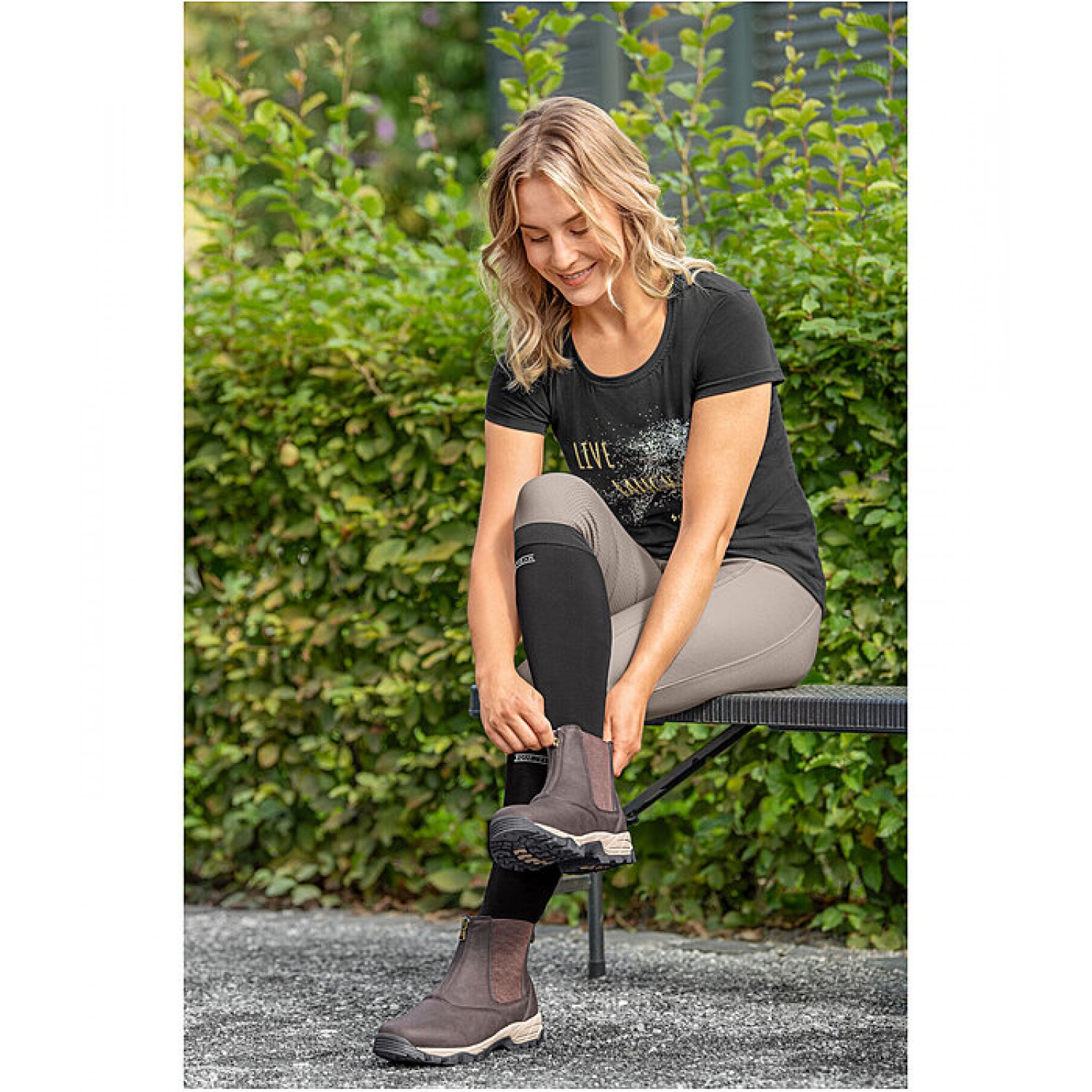 Прочные полиуретановые ботинки по щиколотку с молнией спереди — идеально подходят для верховой езды и работы на земле. Эластичные вставки с обеих сторон и ремешок обеспечивают легкость надевания. Мягкая стелька благодаря двухслойной подошве (промежуточная подошва из мягкого ЭВА, подошва из нескользящей резины). Внутренняя подкладка из дышащей текстильной ткани.