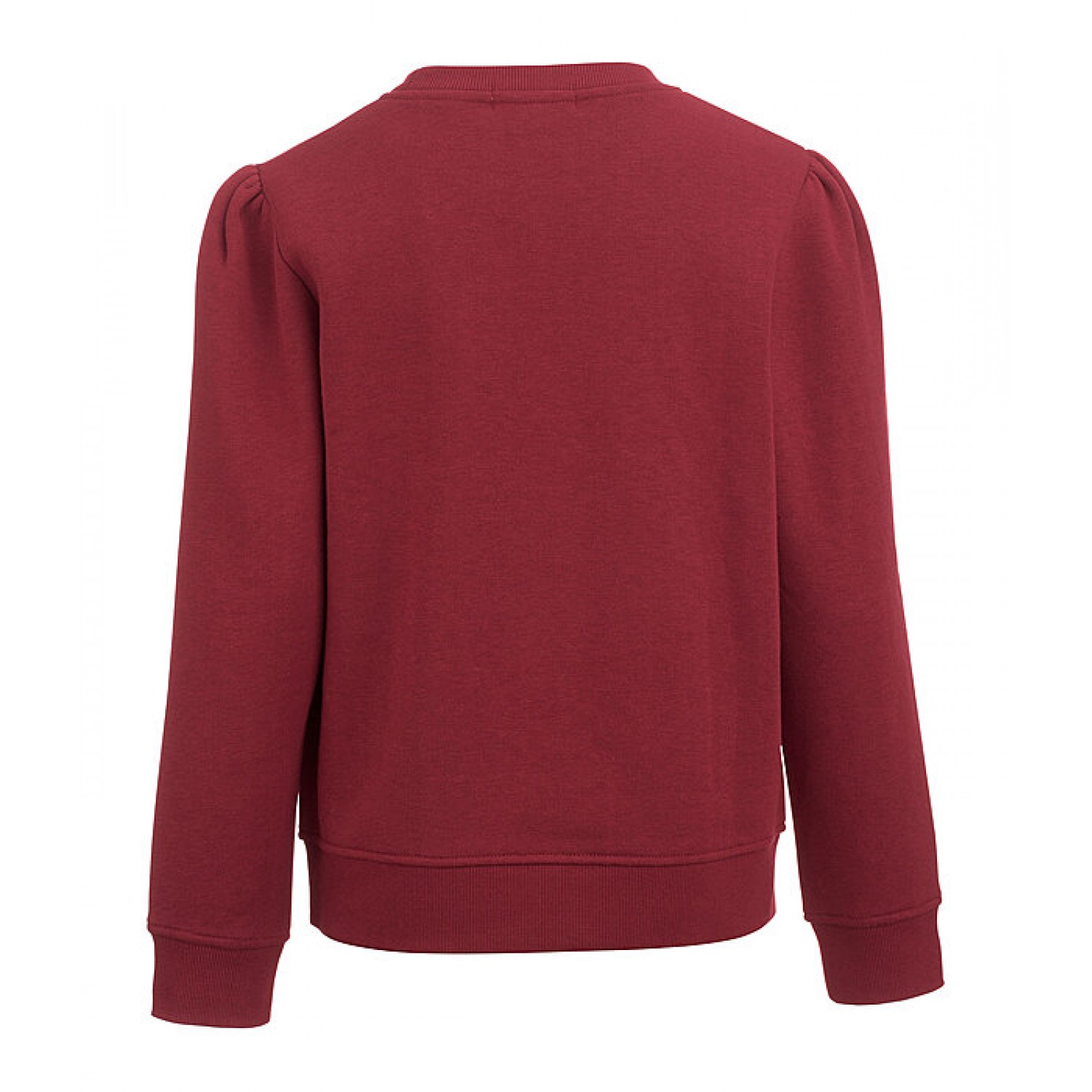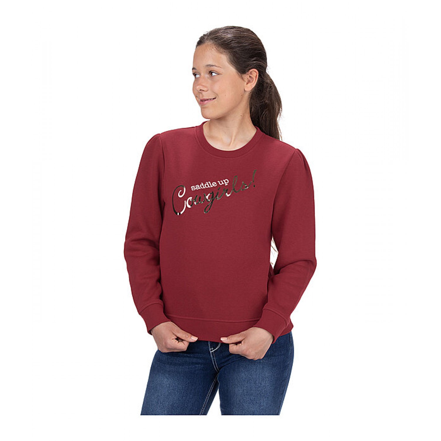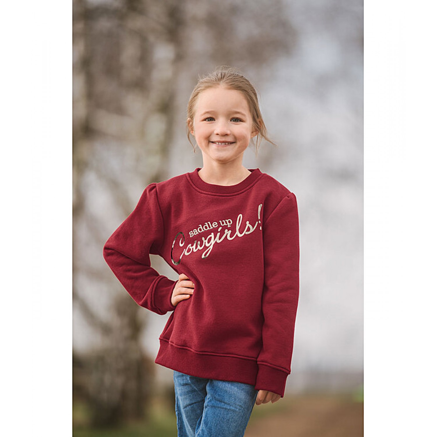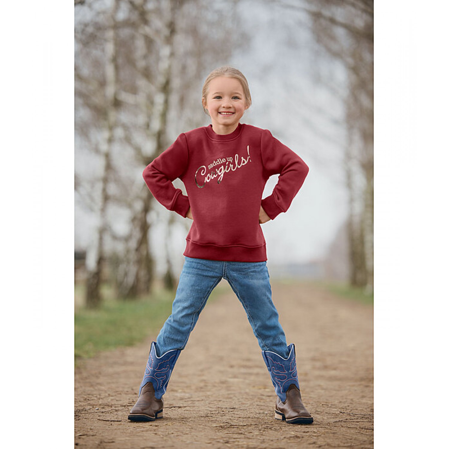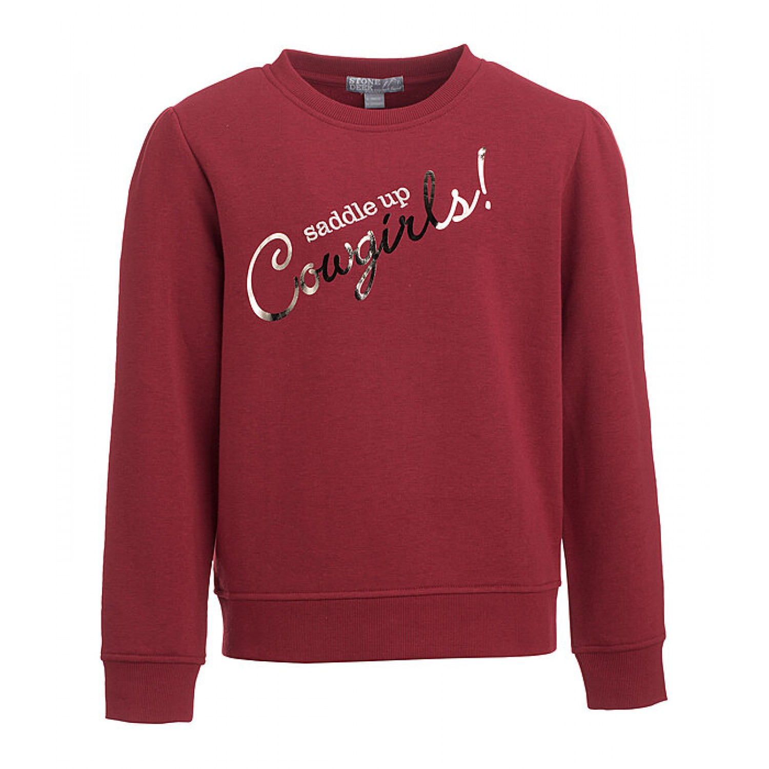 Детский свитер с подчеркнутыми плечами, мерцающим принтом в стиле вестерн и вышитым слоганом на груди. 65% полиэстер, 35% хлопок.