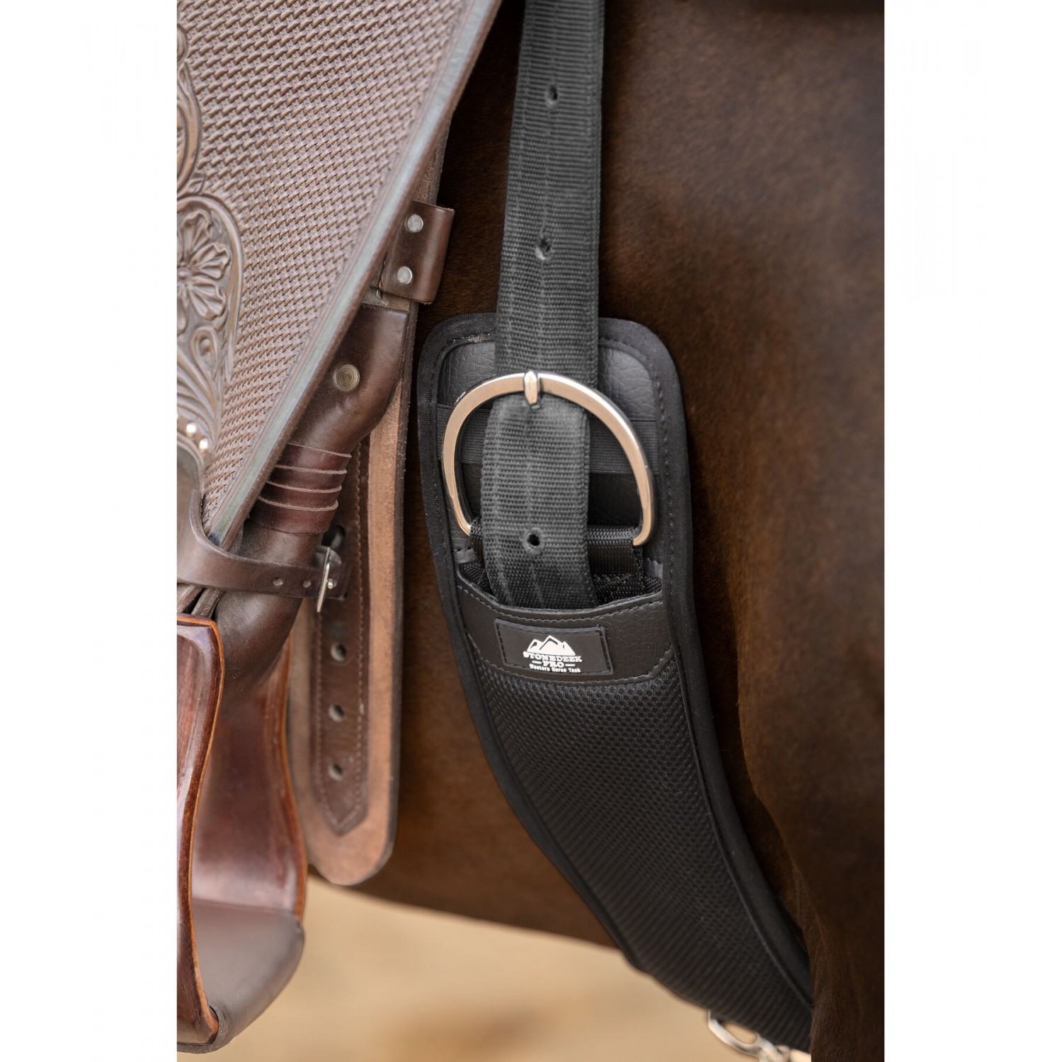 Анатомическая вестерн-подпруга с сетчатым верхом для оптимальной воздухопроницаемости и подкладкой из пеноматериала с эффектом памяти для максимального комфорта лошади. Широкая контактная поверхность и особая форма обеспечивают идеальную свободу движений локтей и равномерное распределение давления. Пряжки из нержавеющей стали. 100% полиэстер.