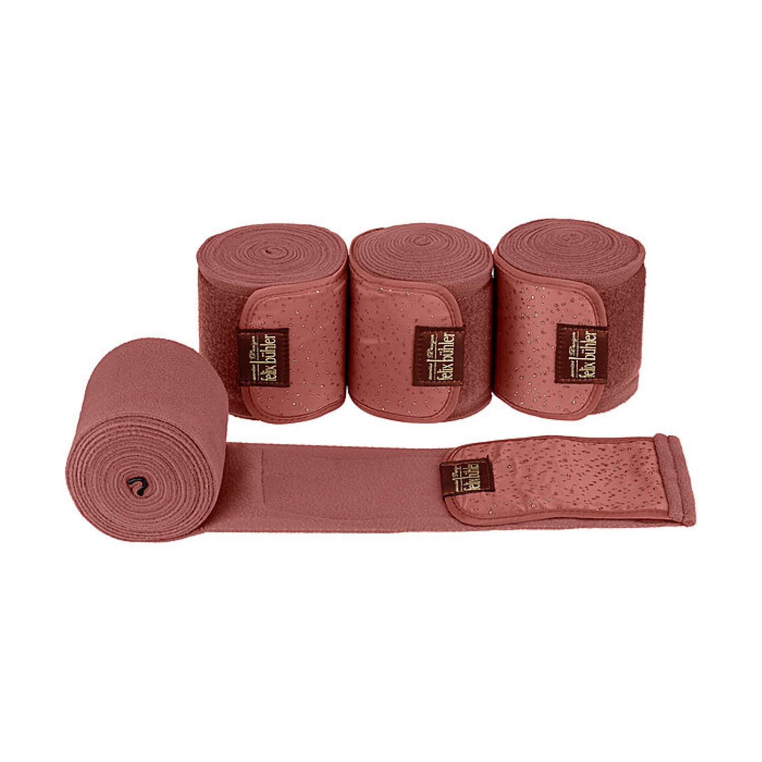 Шикарные бинты из мягкого флиса с очень широкой застежкой для надежной фиксации и вставкой из шелковистой ткани с набивными разноцветными блестками. 100% полиэстер. Набор из 4 шт. Размер P: 8 см x 207 см F: 11 см x 350 см