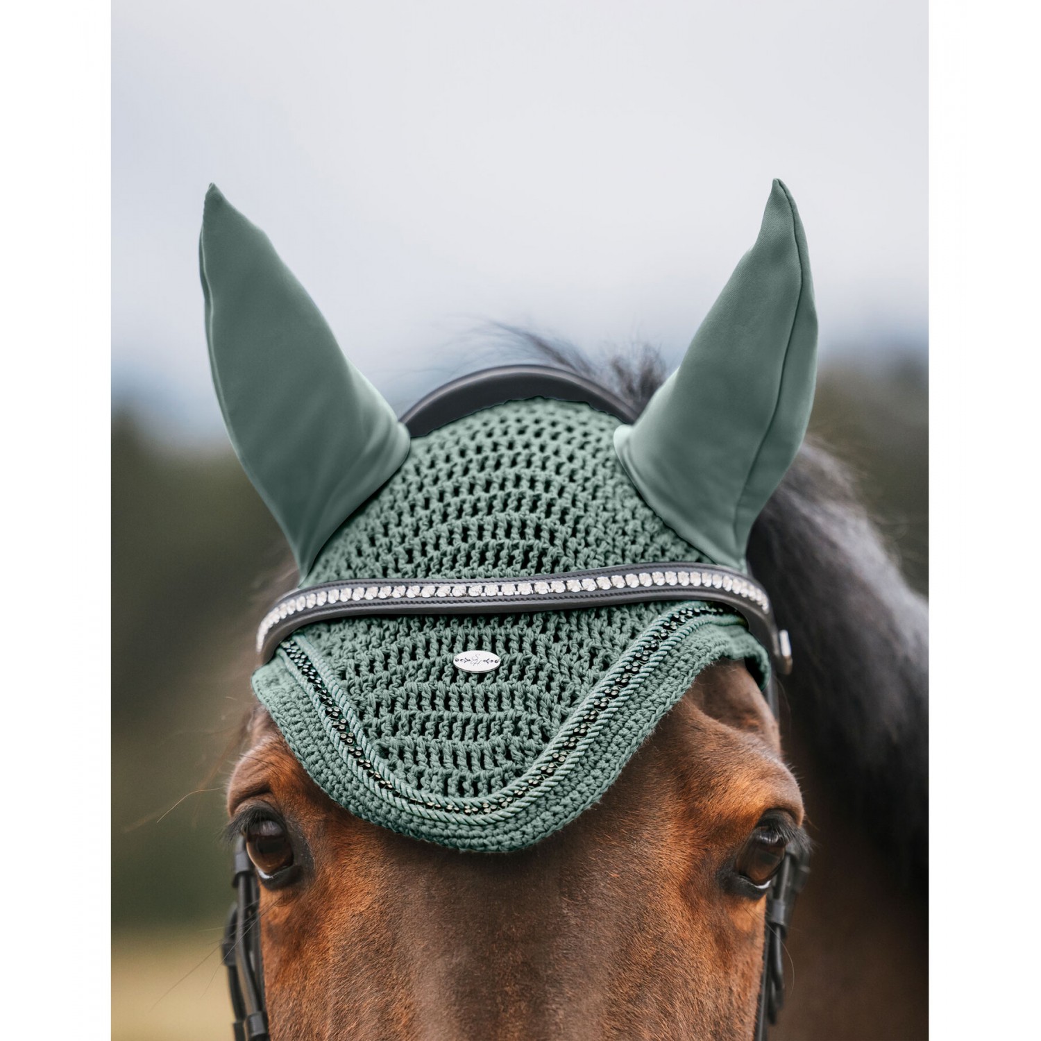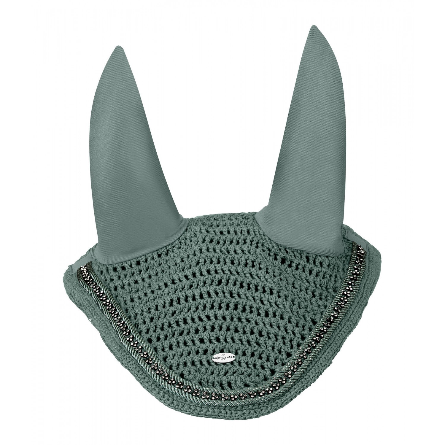 Ушки вязаные крючком, украшенные мелкими стразами и двойным мерцающим декоративным шнурком. Эластичный материал дужек для комфортного ношения и изящная серебряная бирка с логотипом. 88% полиэстер, 12% эластан.