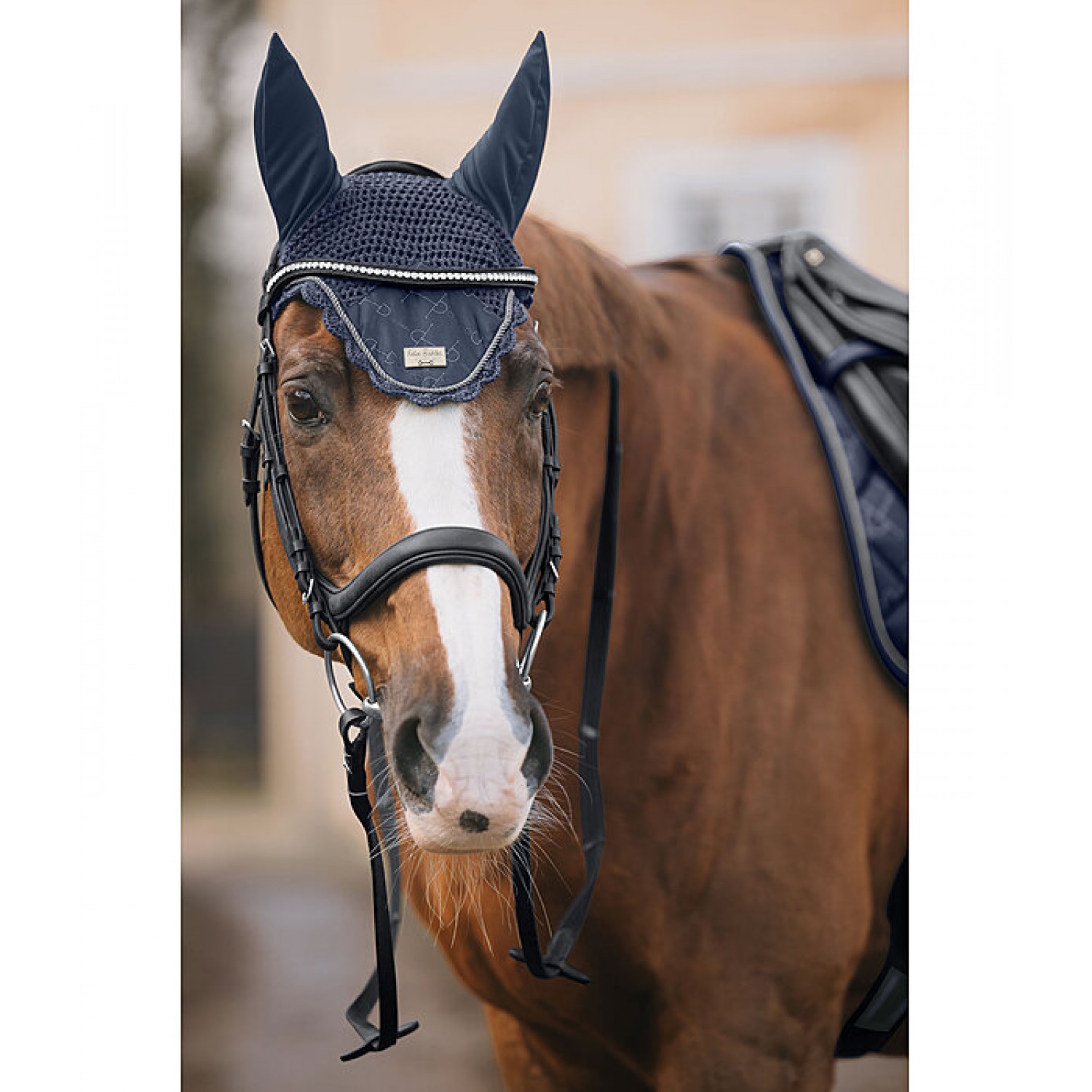 Классические ушки с модным принтом в виде мелкого узора. Элегантная металлическая пластинка с логотипом и декоративный шнур антрацитового цвета. Эластичные дужки для комфортного ношения. 88% полиэстер, 12% эластан
