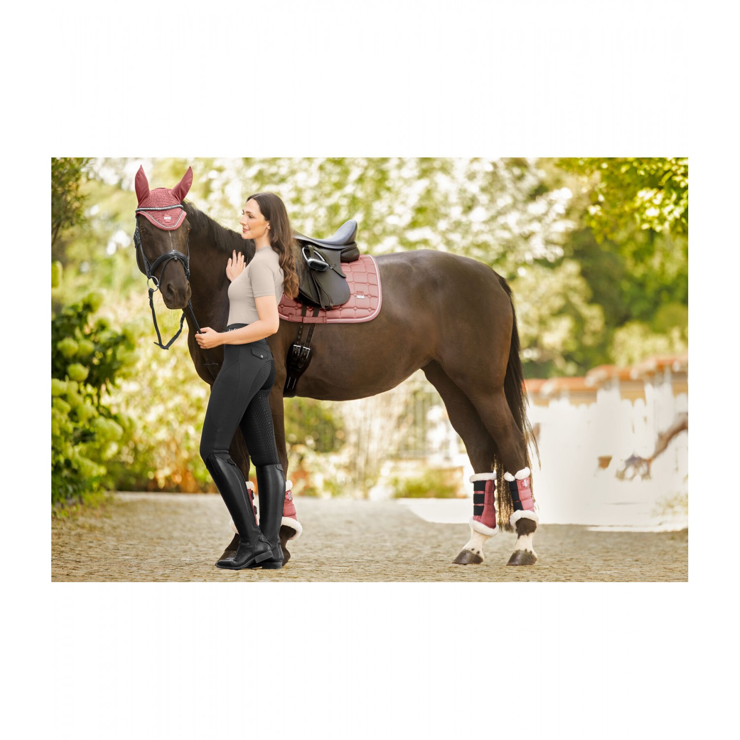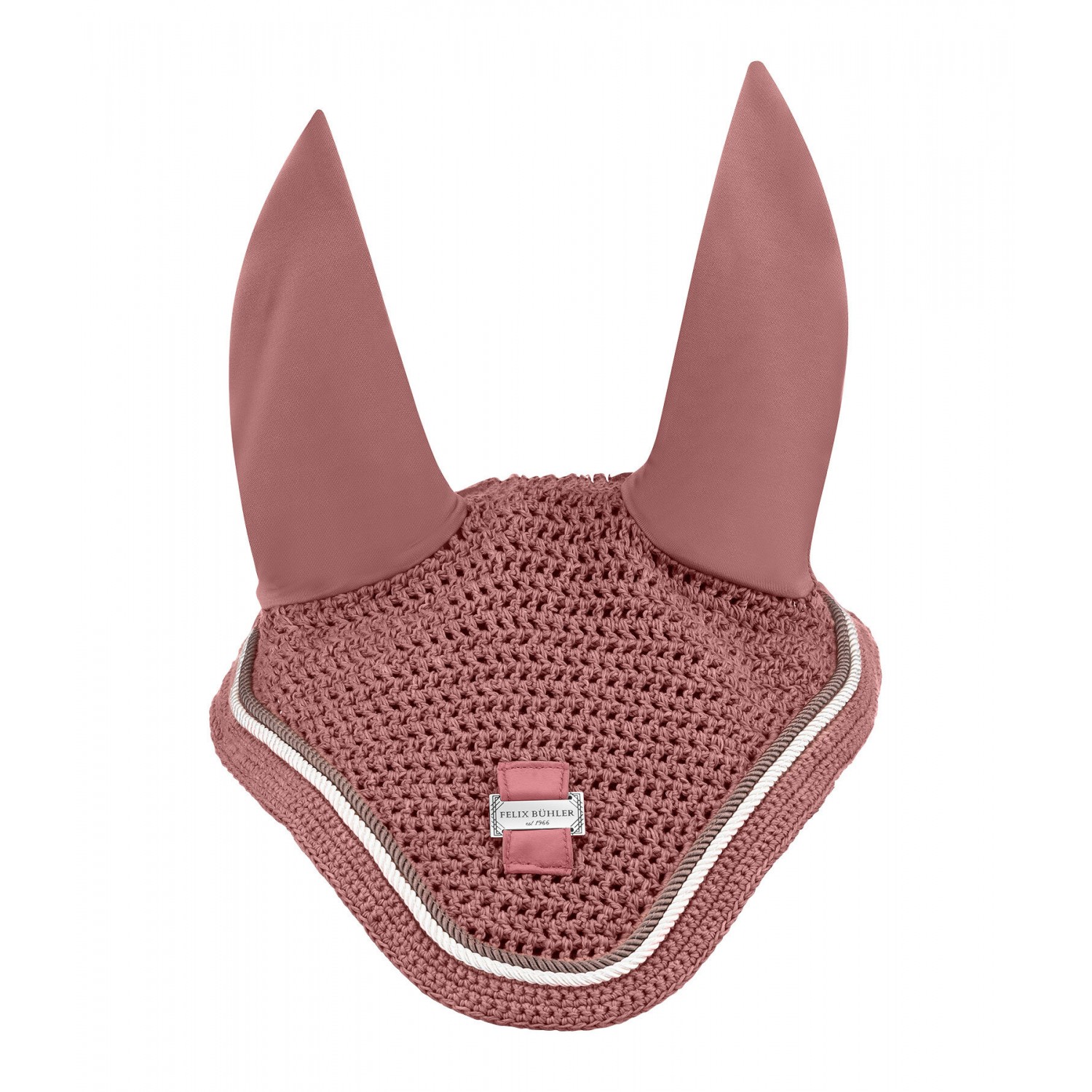 Вязаные уши, с двойным декоративным шнуром в тонких контрастных цветах и ​​небольшой металлической табличкой с логотипом Felix Bühler - серебристого цвета для цветов GL, DF, GC и W, медного цвета для TE и розового золота для TA. Эластичный материал в области ушей для идеального комфорта и липучка для надежного крепления к уздечке. 100% полиэстер.